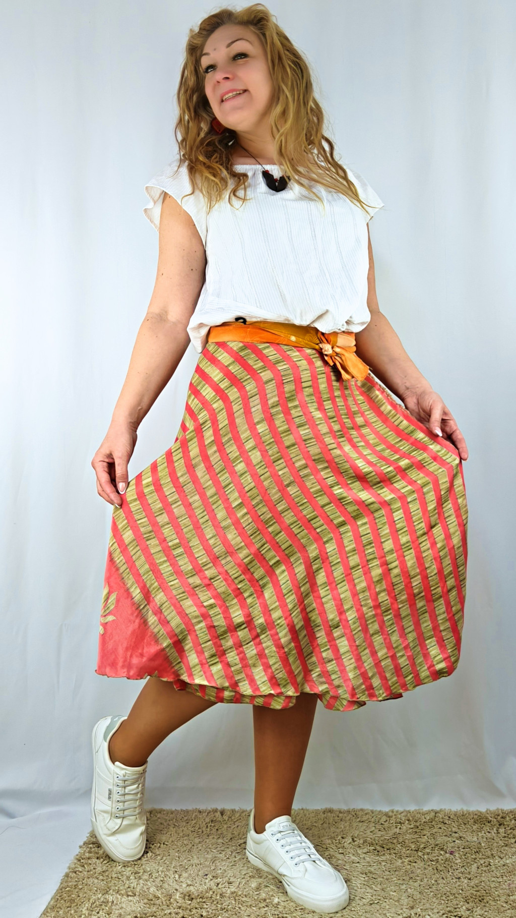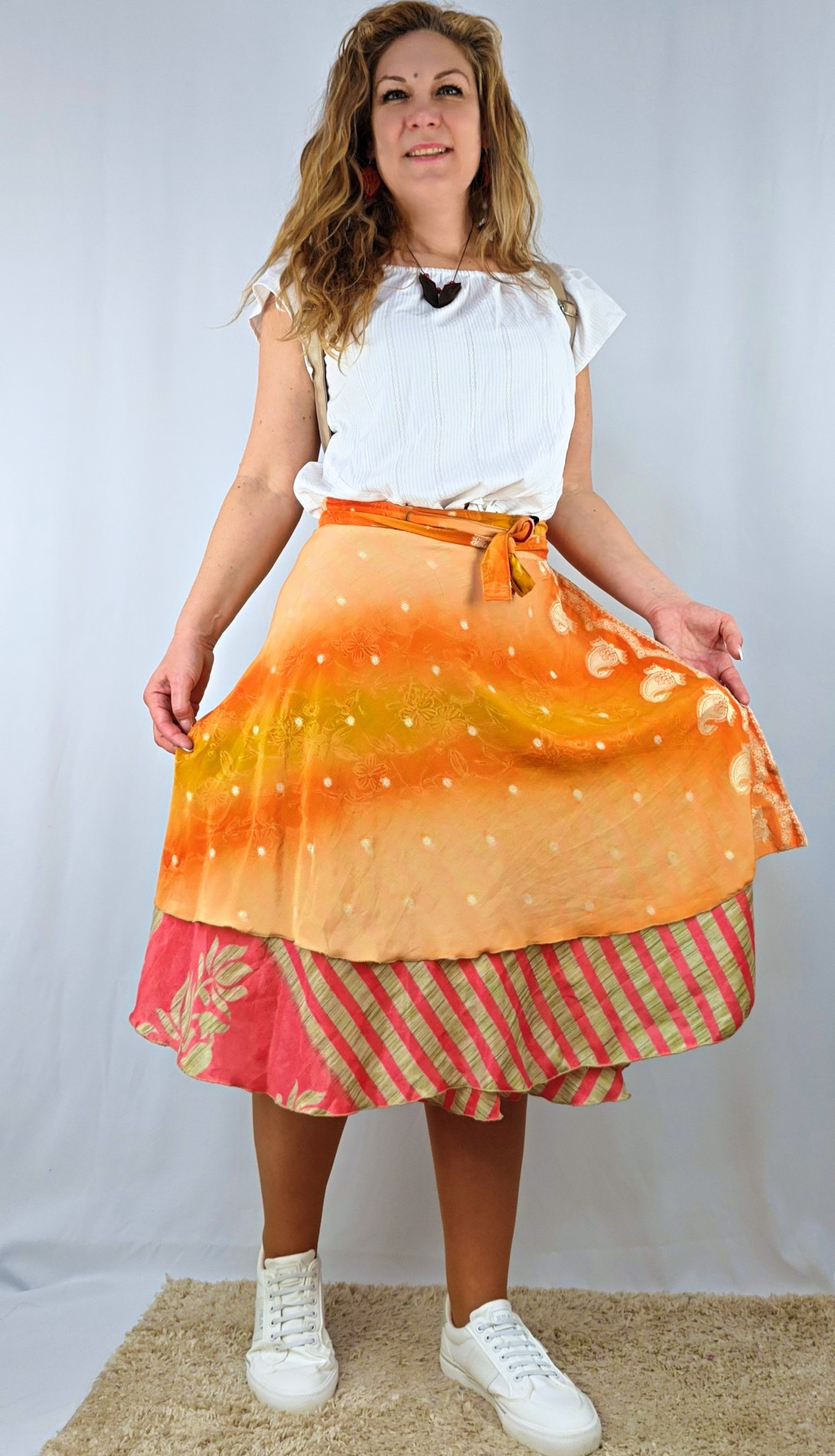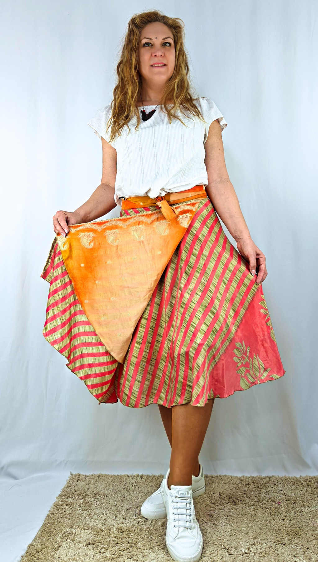 Lapszoknyáink újrahasznosított szárikból készülnek Indiában, egy hosszabb és egy rövidebb anyag derékban összevarrva! Két oldalú, kifordítható, mindkét oldala hordható, sokféleképpen köthető, variálható. Szoknyáinkból nincs két egyforma, mindegyikből csak EGY darab van, ha megtetszik, csapj le rá!