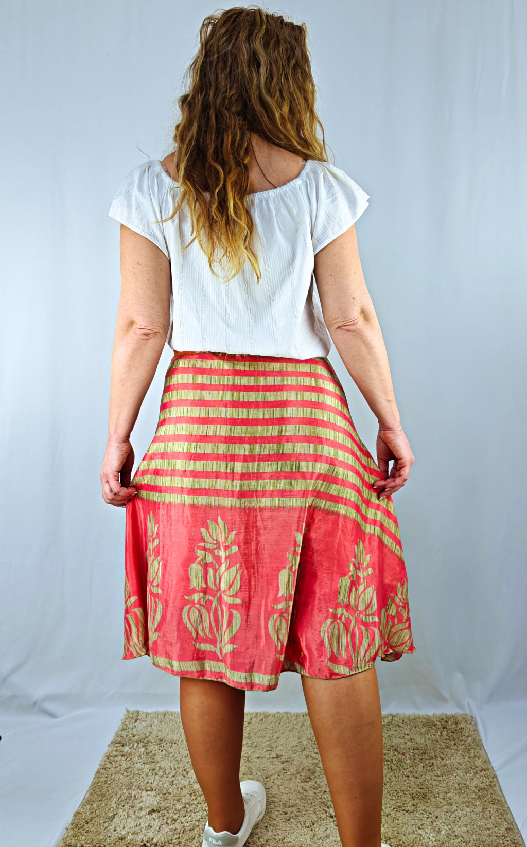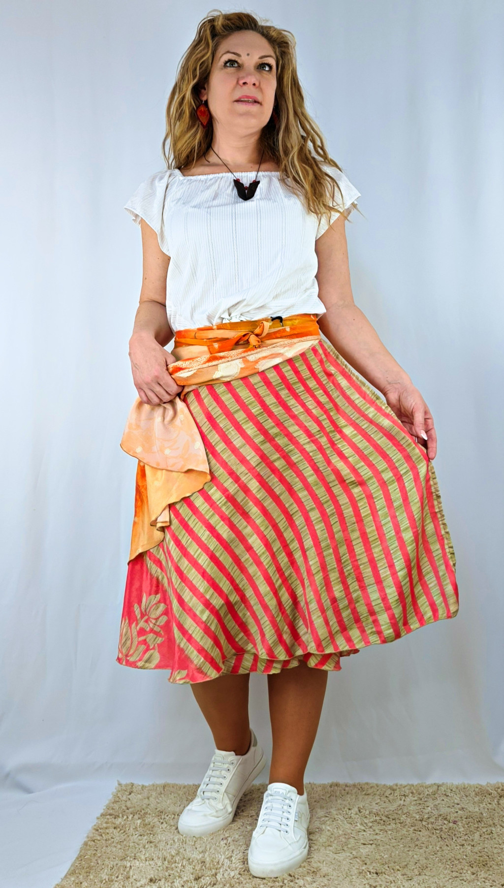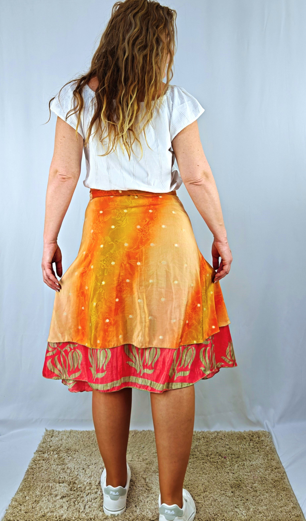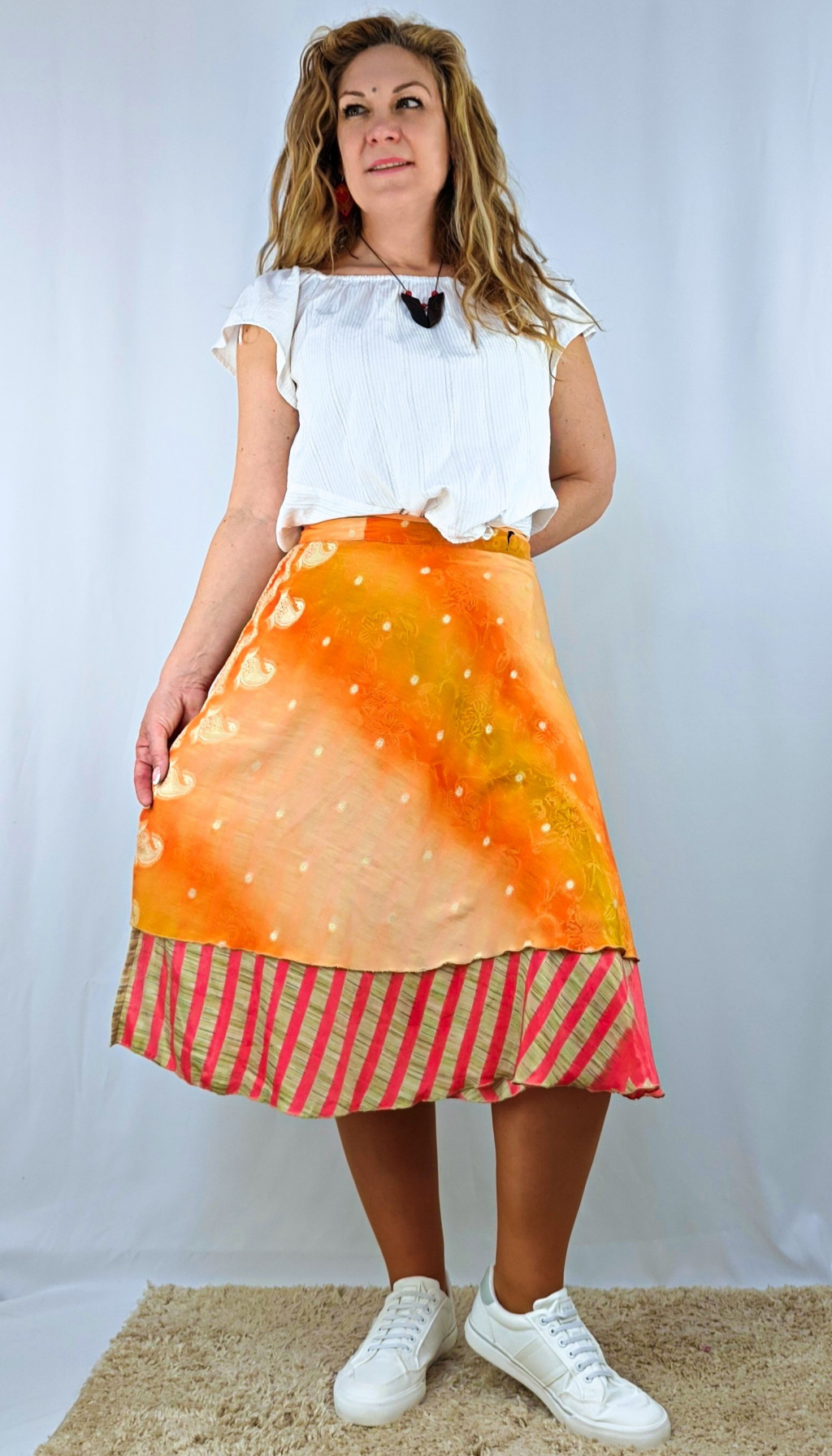 Lapszoknyáink újrahasznosított szárikból készülnek Indiában, egy hosszabb és egy rövidebb anyag derékban összevarrva! Két oldalú, kifordítható, mindkét oldala hordható, sokféleképpen köthető, variálható. Szoknyáinkból nincs két egyforma, mindegyikből csak EGY darab van, ha megtetszik, csapj le rá!