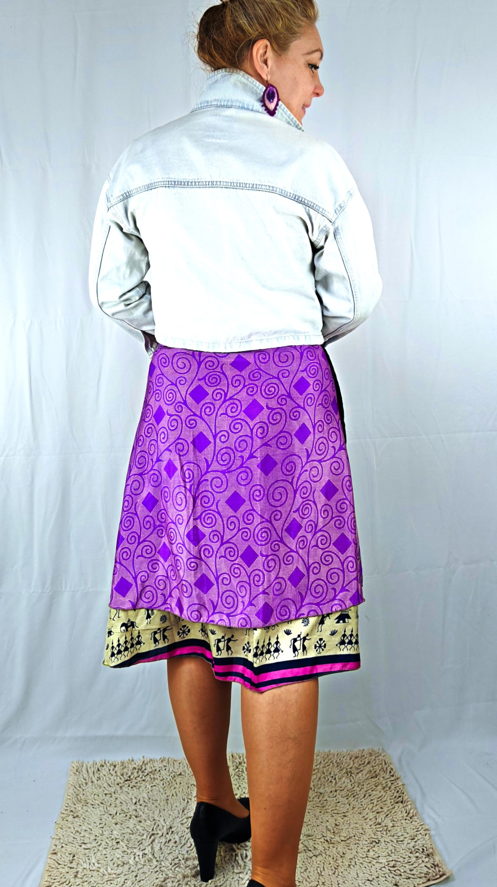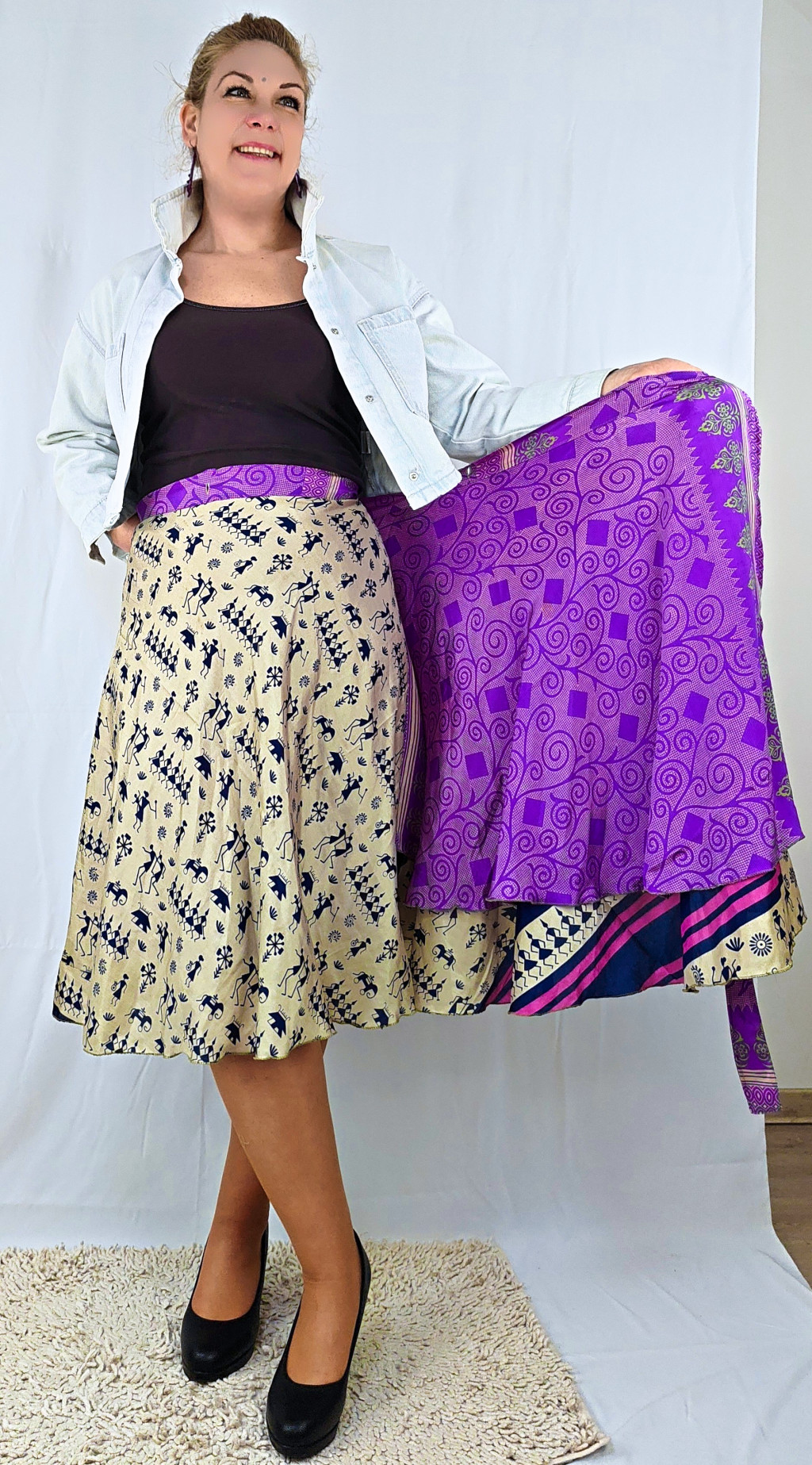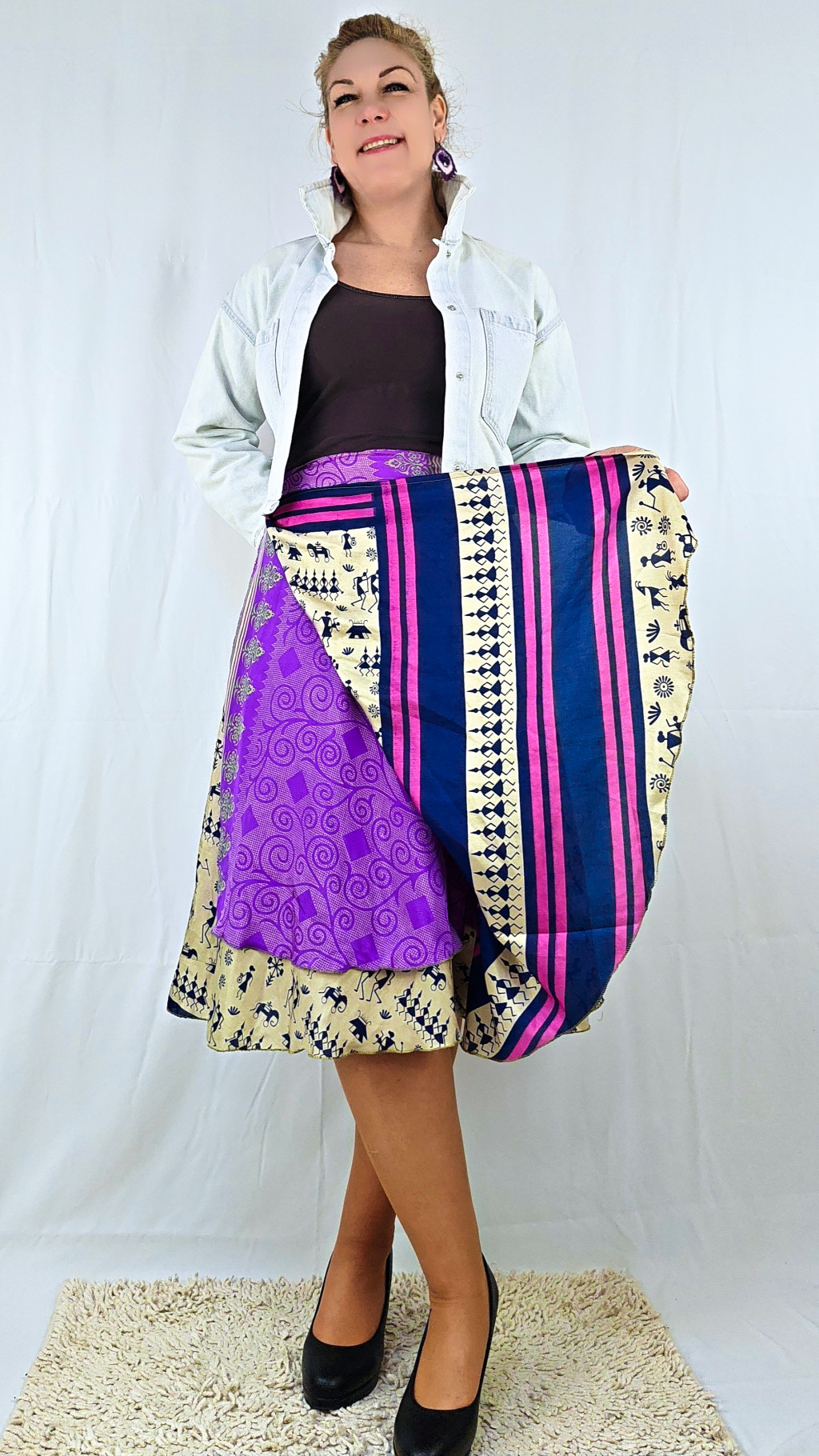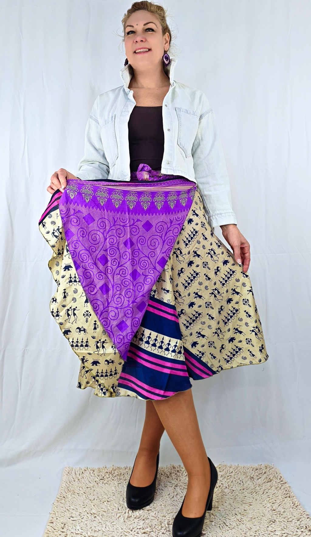 Lapszoknyáink újrahasznosított szárikból készülnek Indiában, egy hosszabb és egy rövidebb anyag derékban összevarrva! Két oldalú, kifordítható, mindkét oldala hordható, sokféleképpen köthető, variálható. Szoknyáinkból nincs két egyforma, mindegyikből csak EGY darab van, ha megtetszik, csapj le rá!
