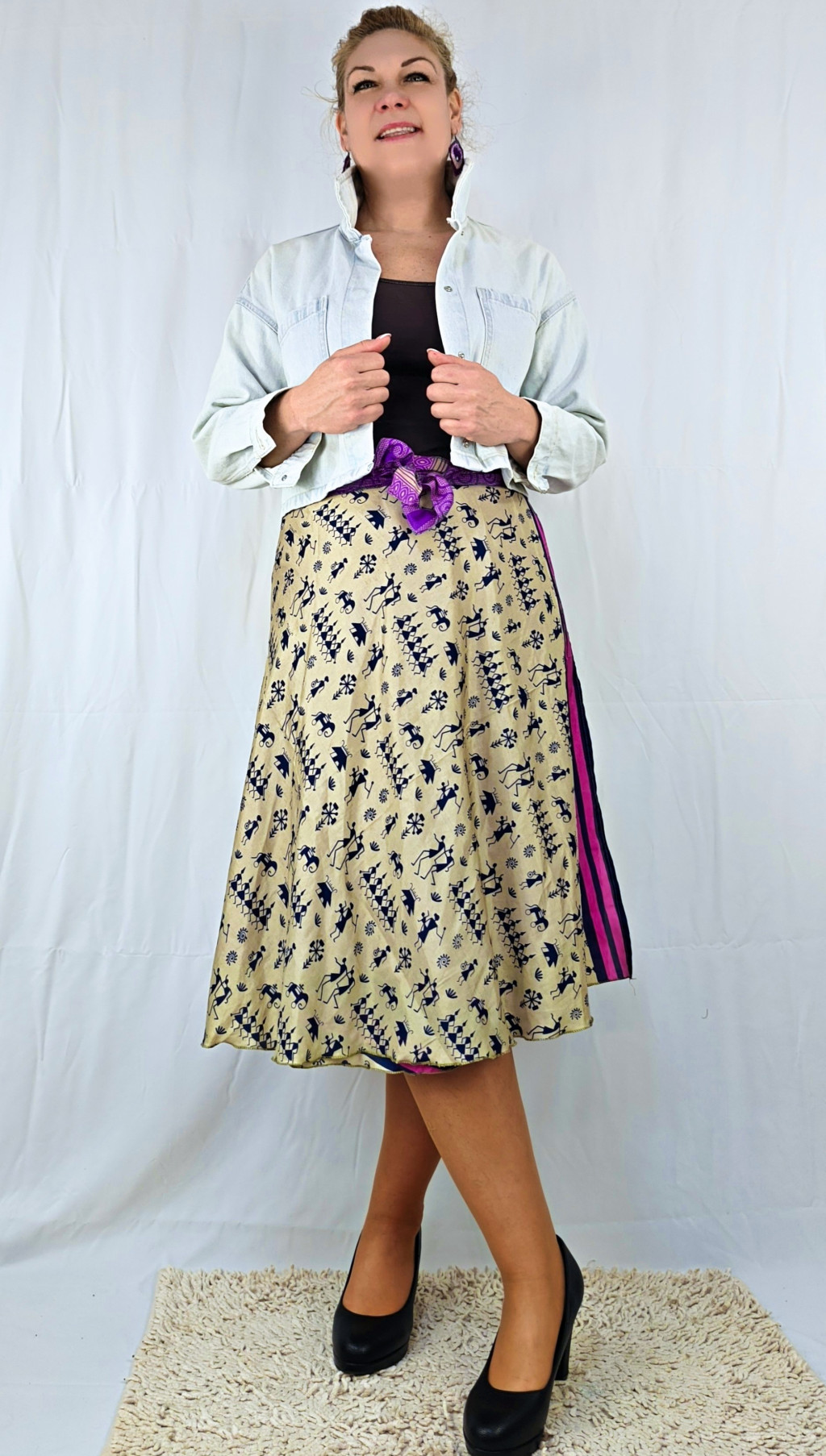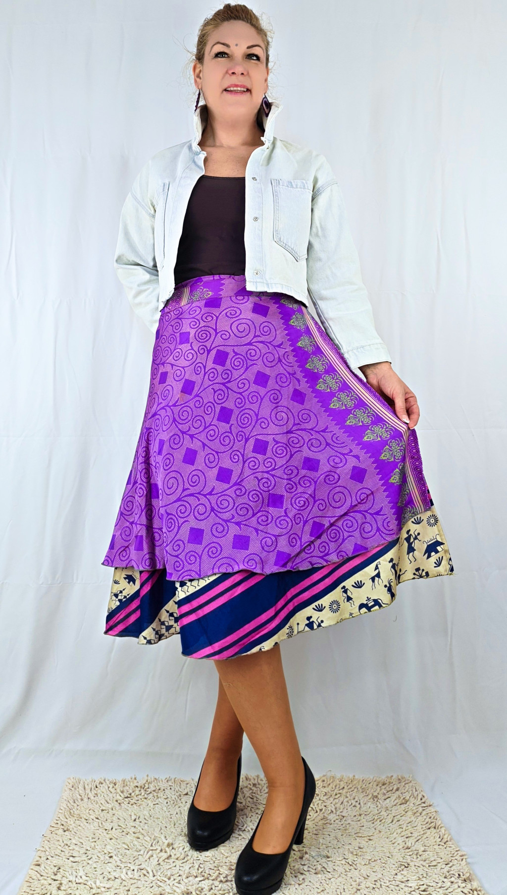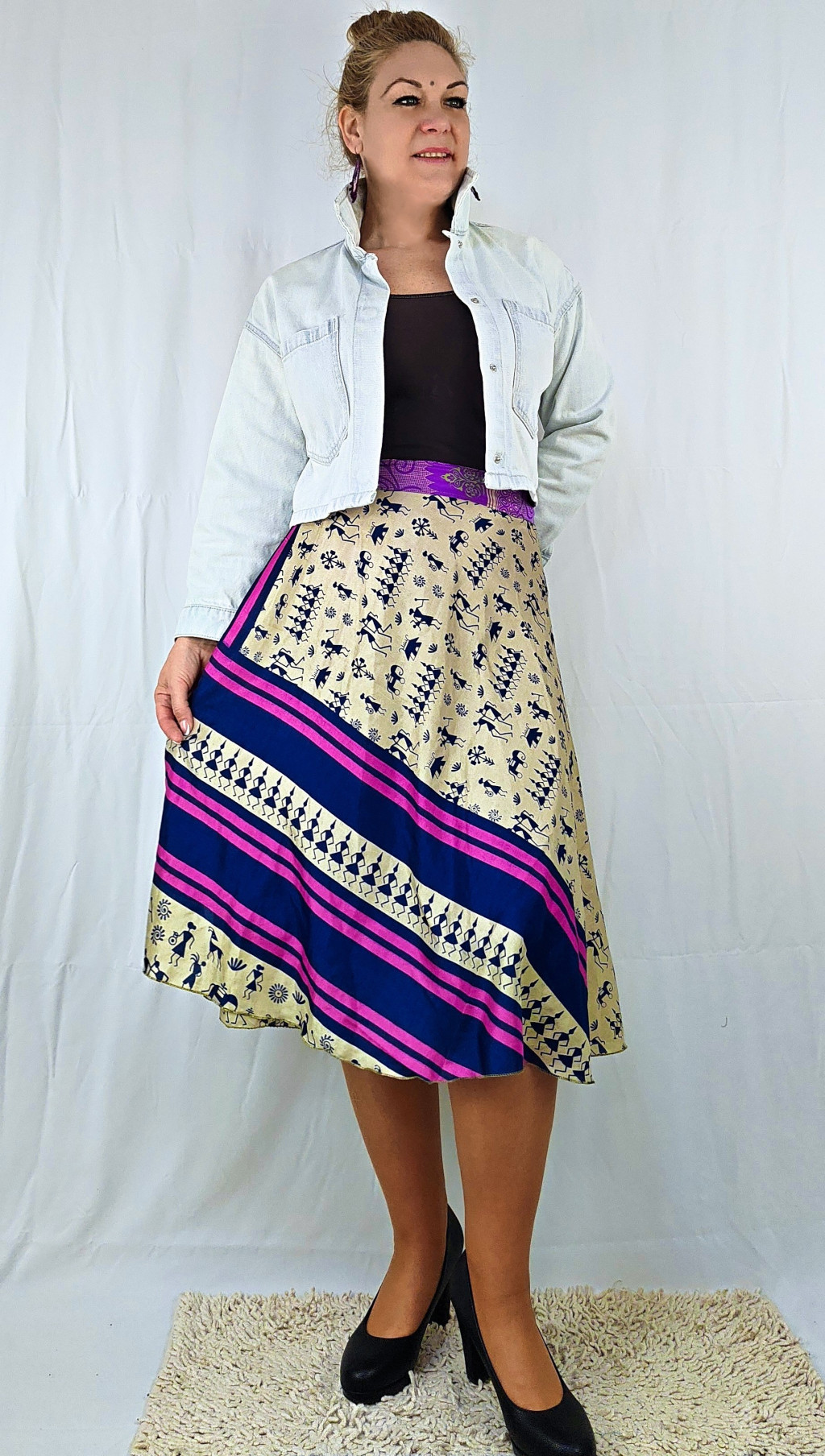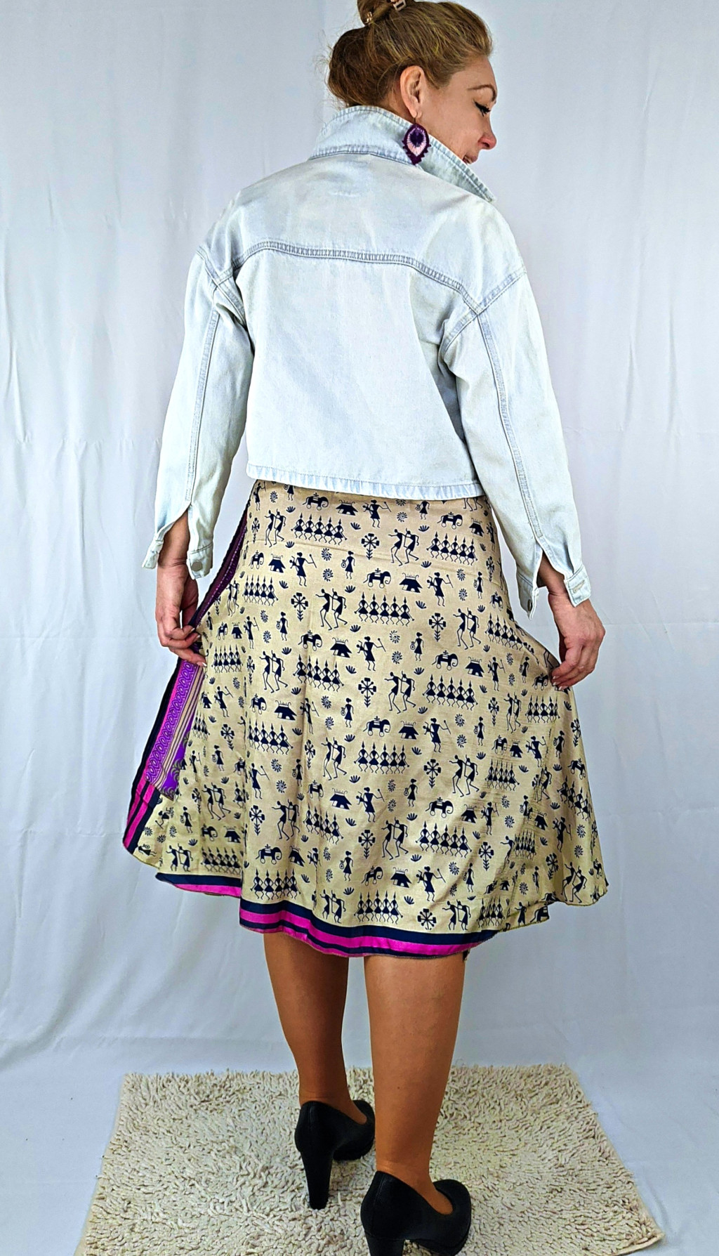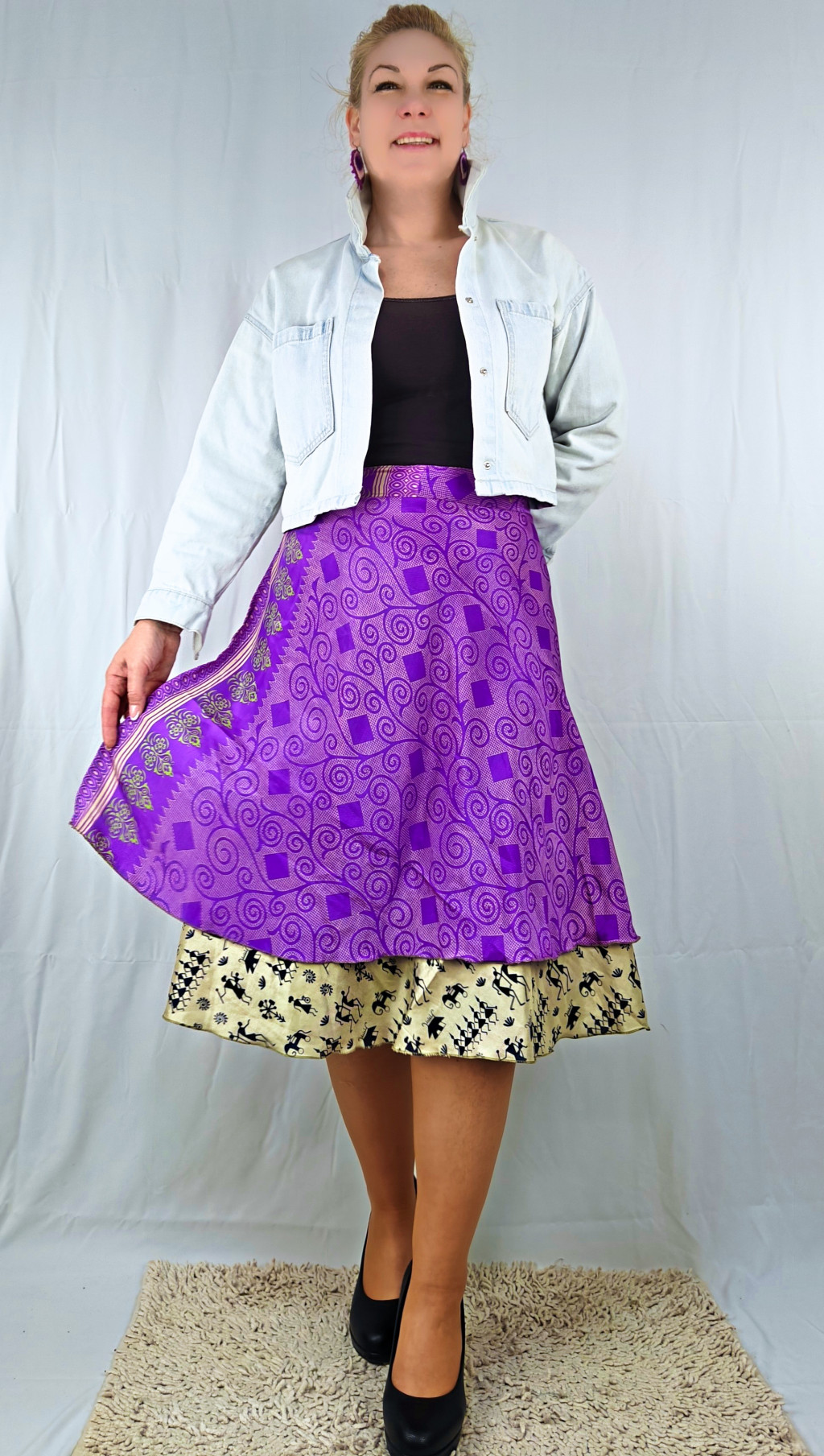 Lapszoknyáink újrahasznosított szárikból készülnek Indiában, egy hosszabb és egy rövidebb anyag derékban összevarrva! Két oldalú, kifordítható, mindkét oldala hordható, sokféleképpen köthető, variálható. Szoknyáinkból nincs két egyforma, mindegyikből csak EGY darab van, ha megtetszik, csapj le rá!
