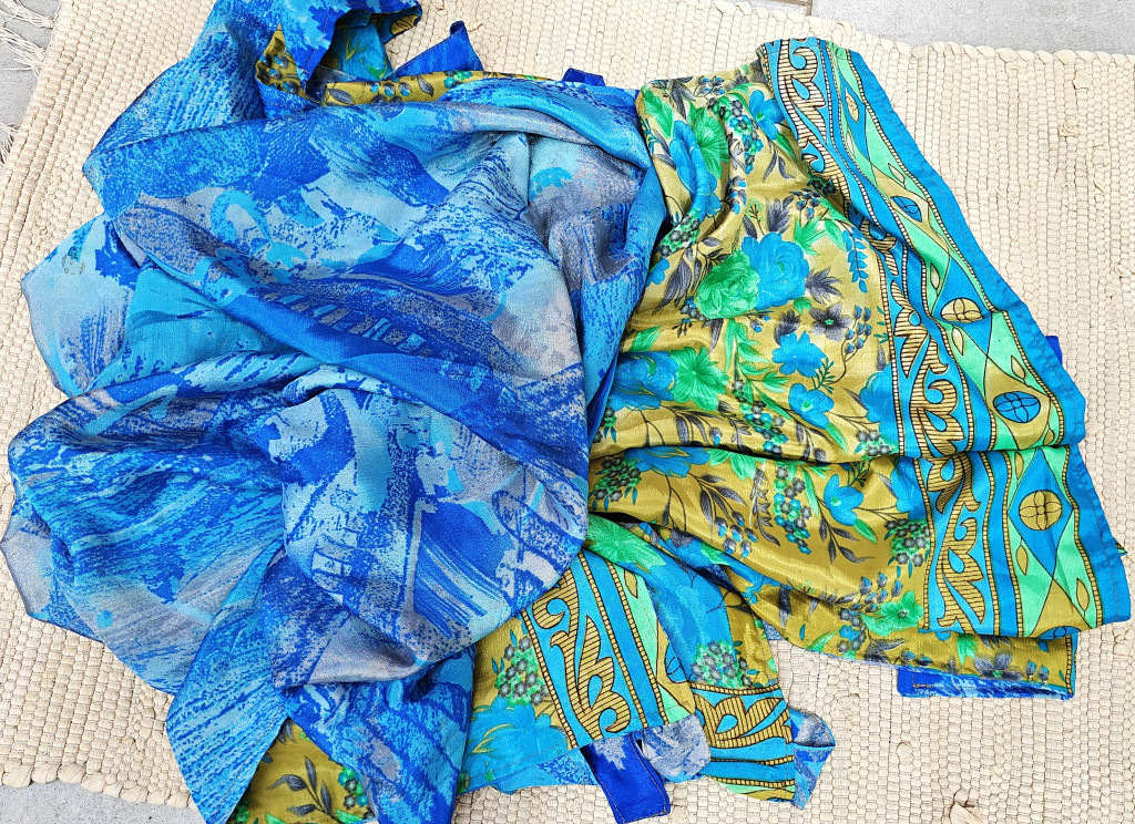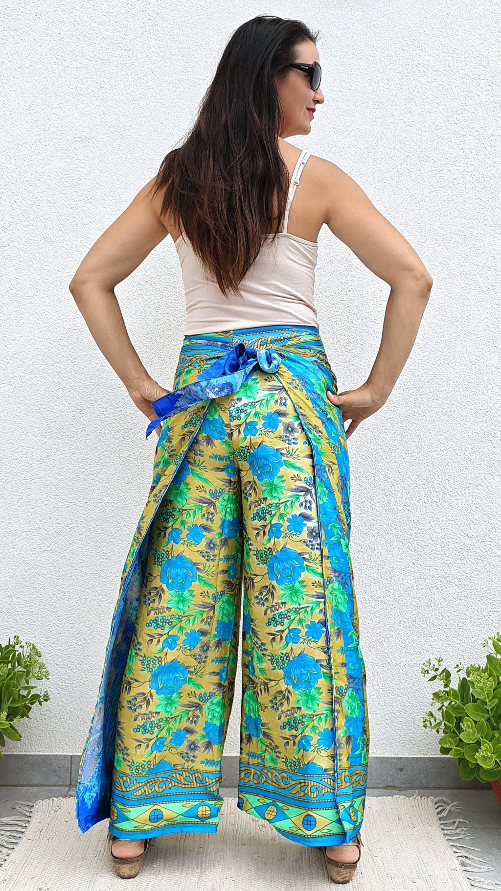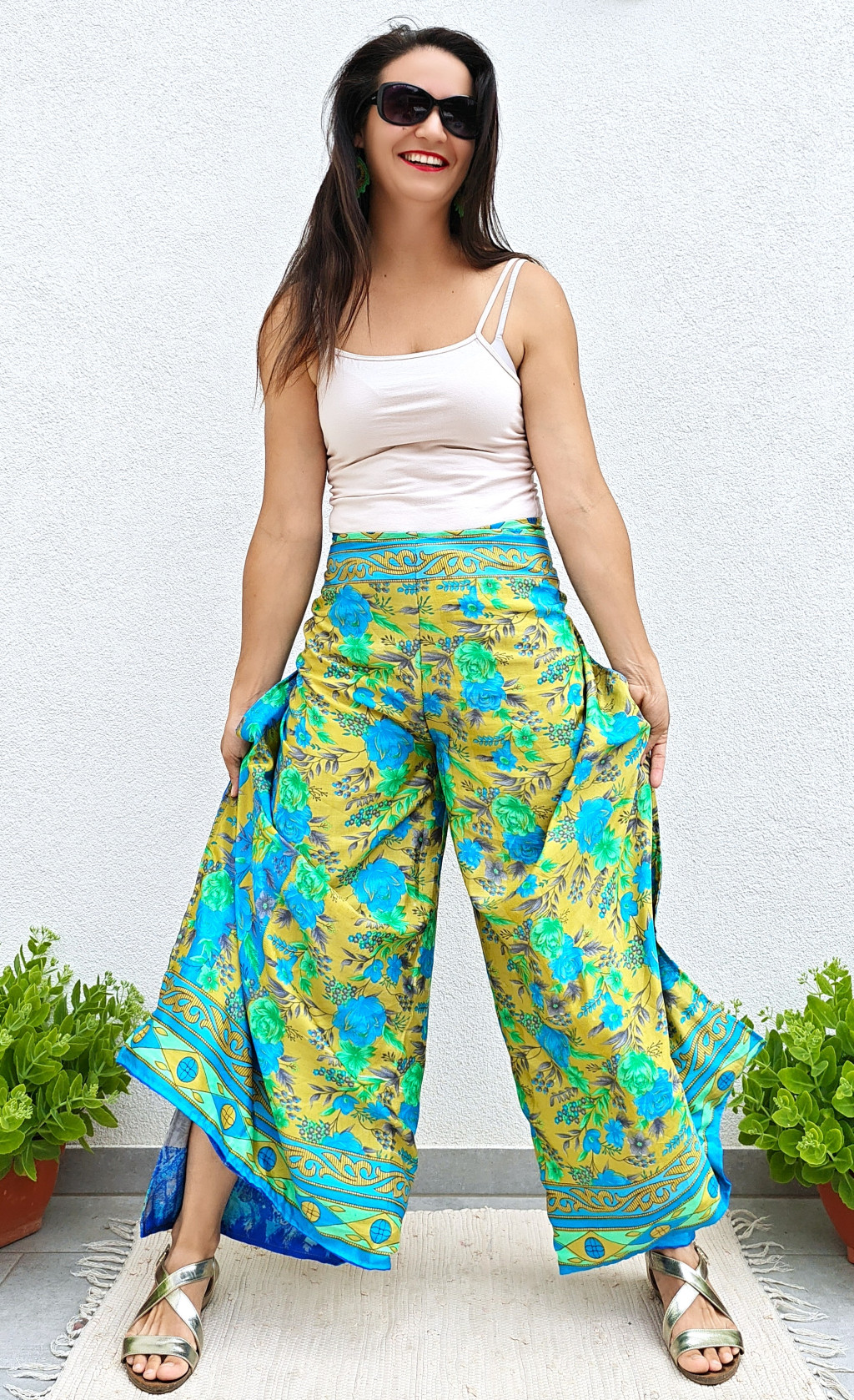 Lapnadrágjaink újrahasznosított szárikból készülnek Indiában. Két különböző csodás anyagot varrnak össze, így a külső és belső fele is hordható!