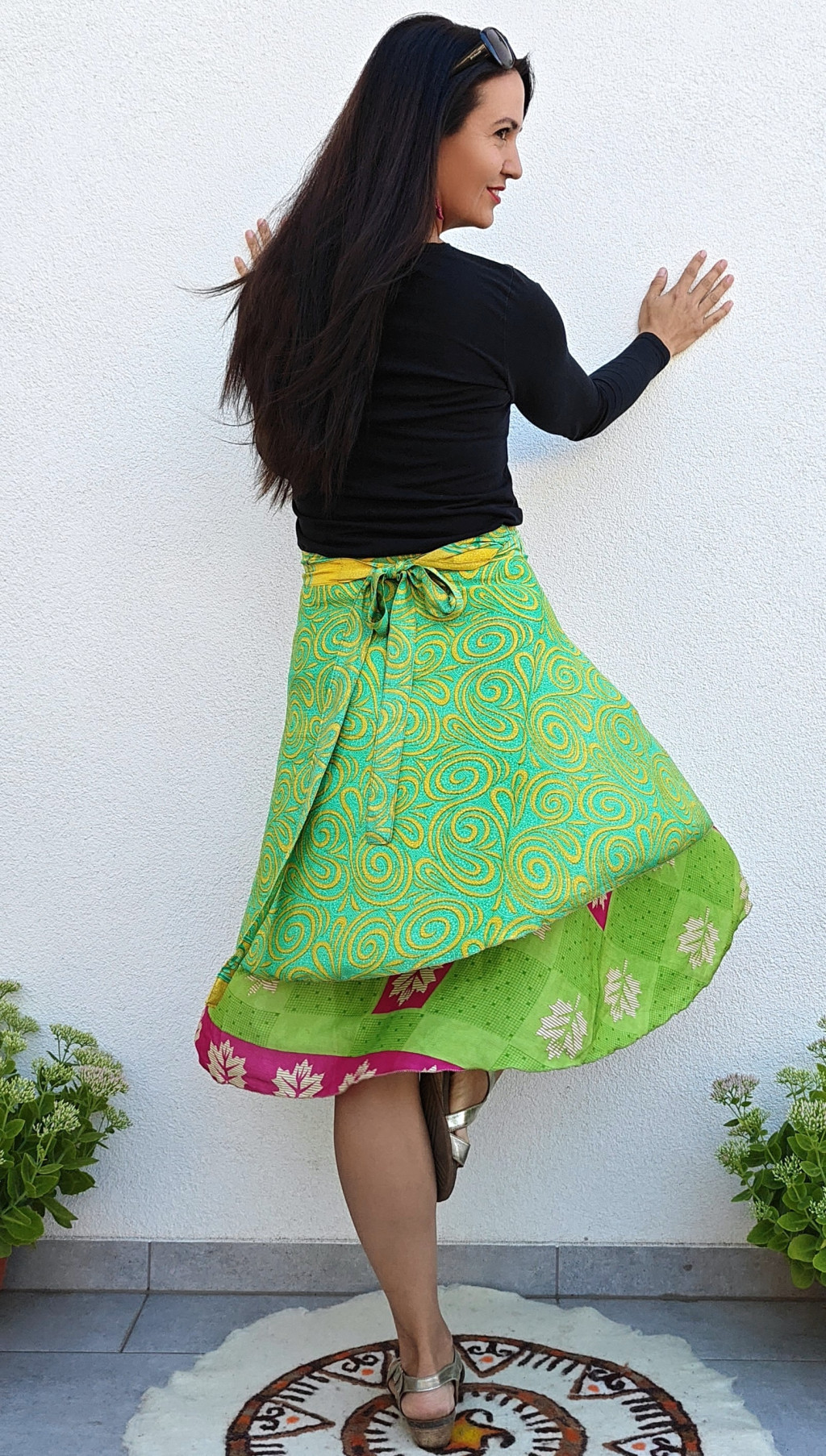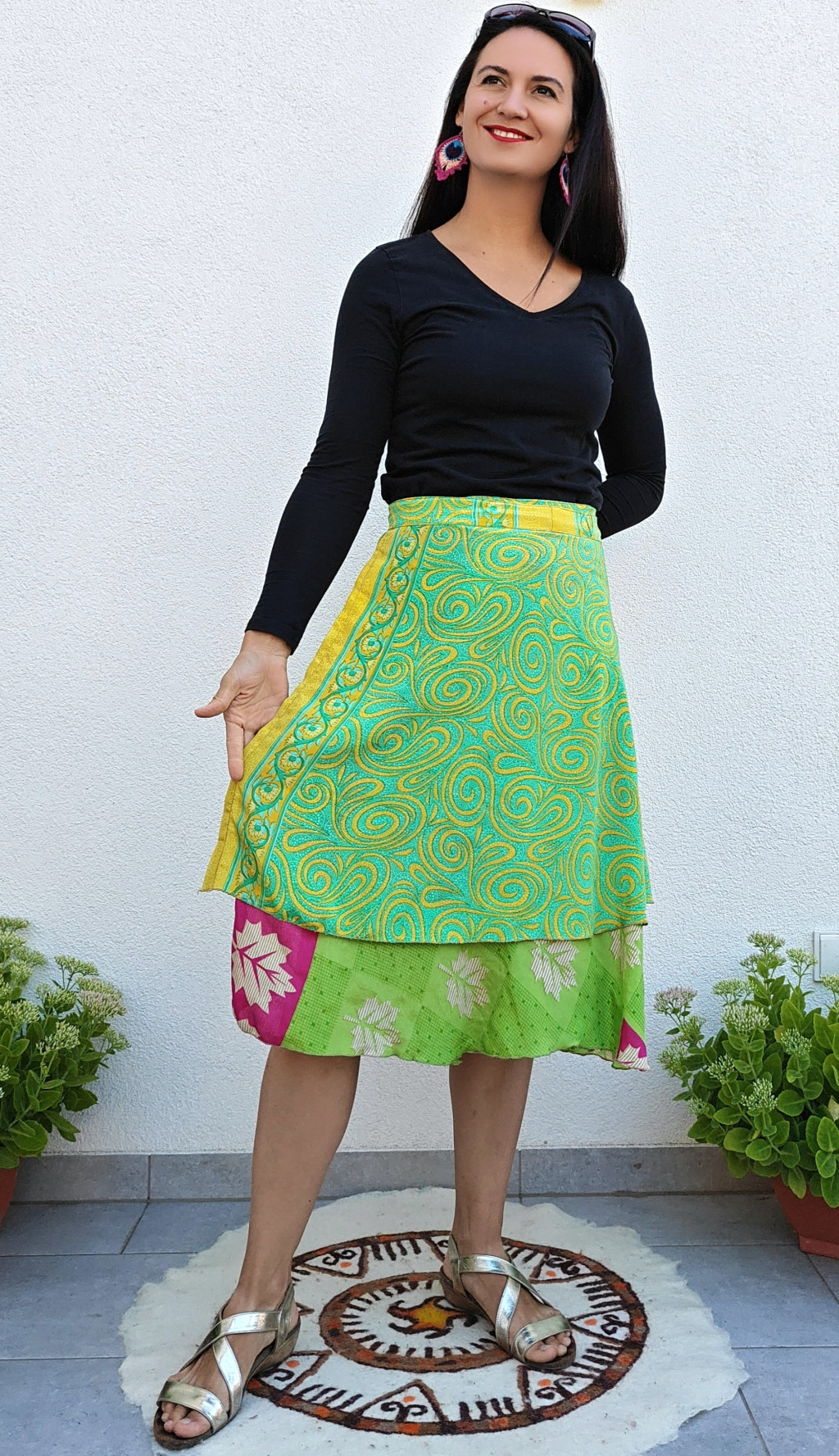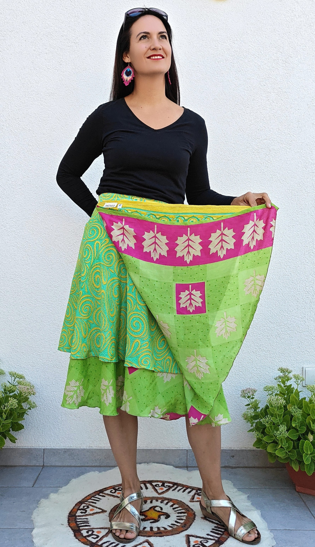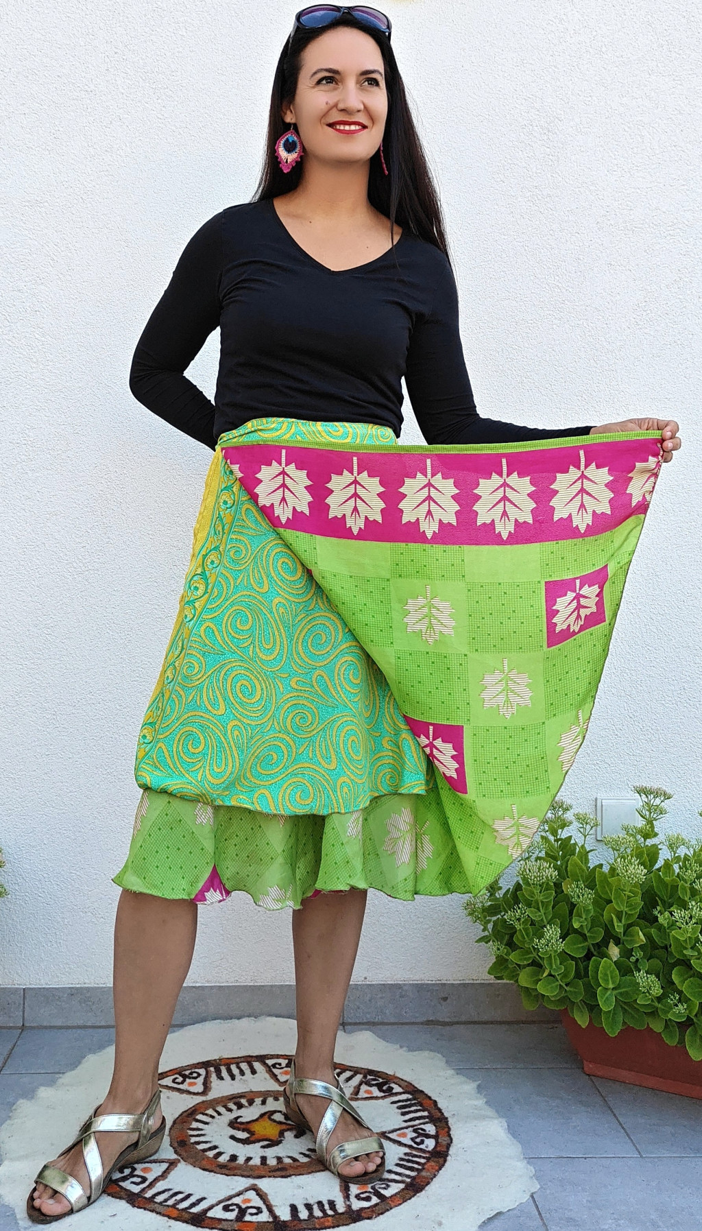 Lapszoknyáink újrahasznosított szárikból készülnek Indiában, egy hosszabb és egy rövidebb anyag derékban összevarrva! Két oldalú, kifordítható, mindkét oldala hordható, sokféleképpen köthető, variálható. Szoknyáinkból nincs két egyforma, mindegyikből csak EGY darab van, ha megtetszik, csapj le rá!