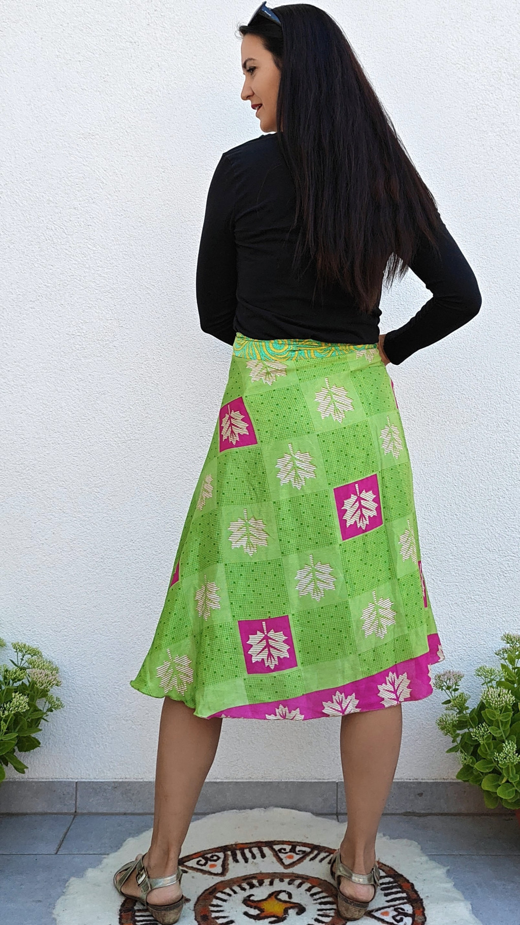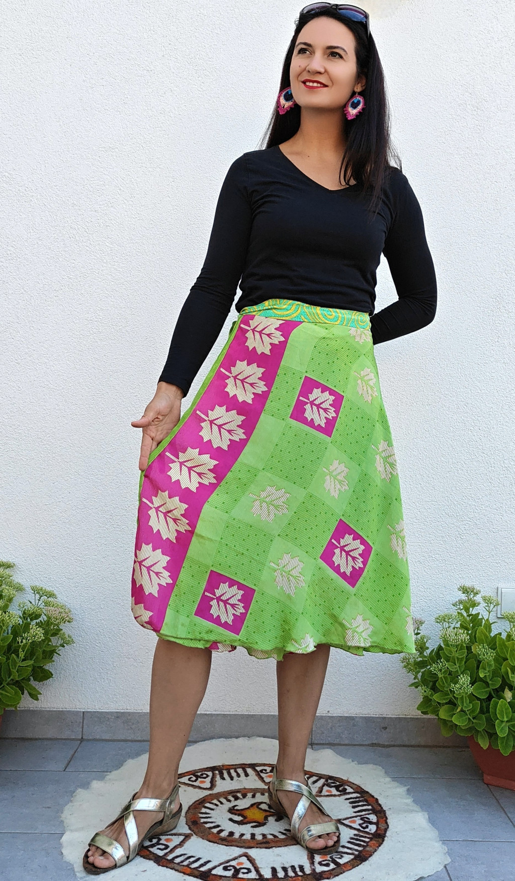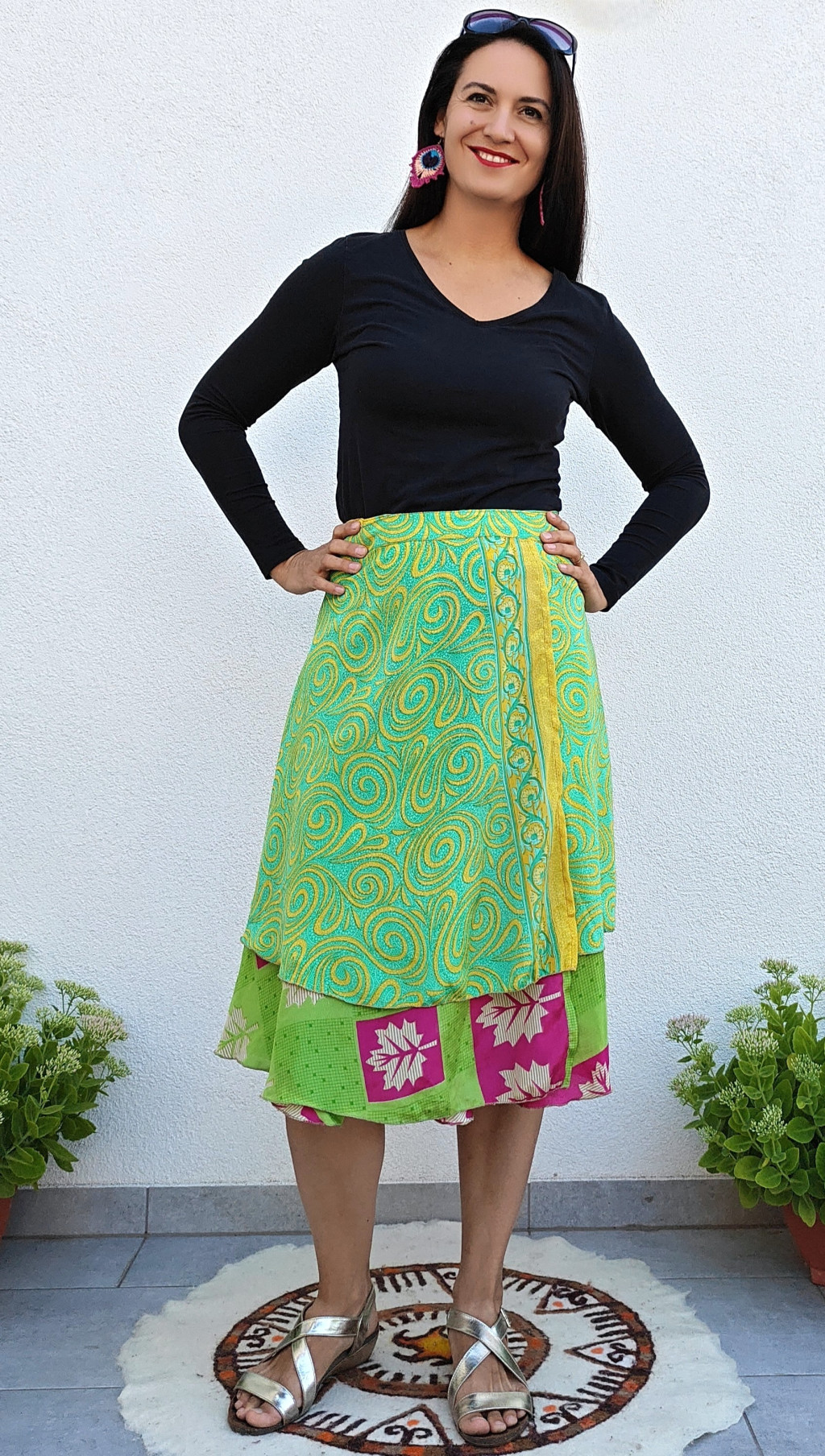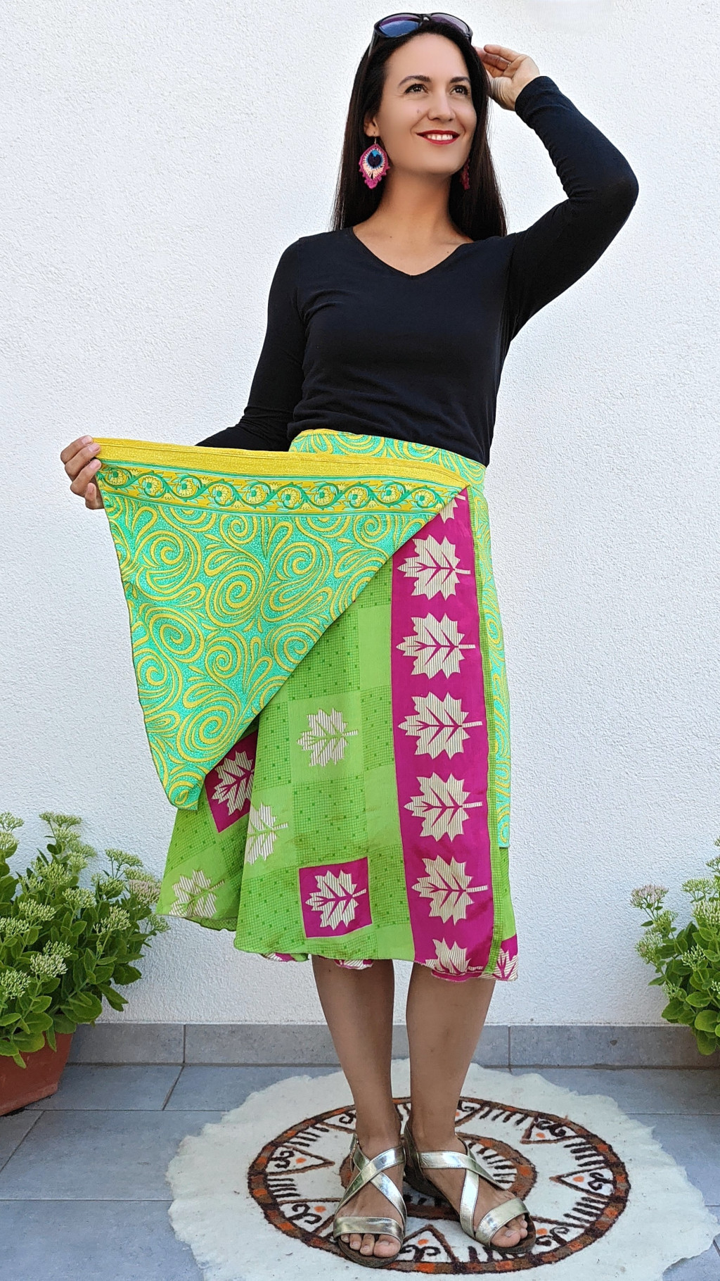 Lapszoknyáink újrahasznosított szárikból készülnek Indiában, egy hosszabb és egy rövidebb anyag derékban összevarrva! Két oldalú, kifordítható, mindkét oldala hordható, sokféleképpen köthető, variálható. Szoknyáinkból nincs két egyforma, mindegyikből csak EGY darab van, ha megtetszik, csapj le rá!