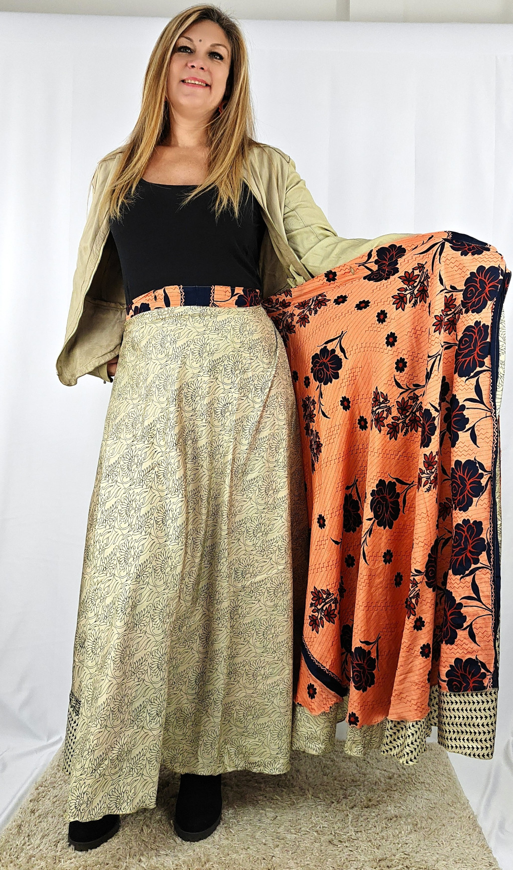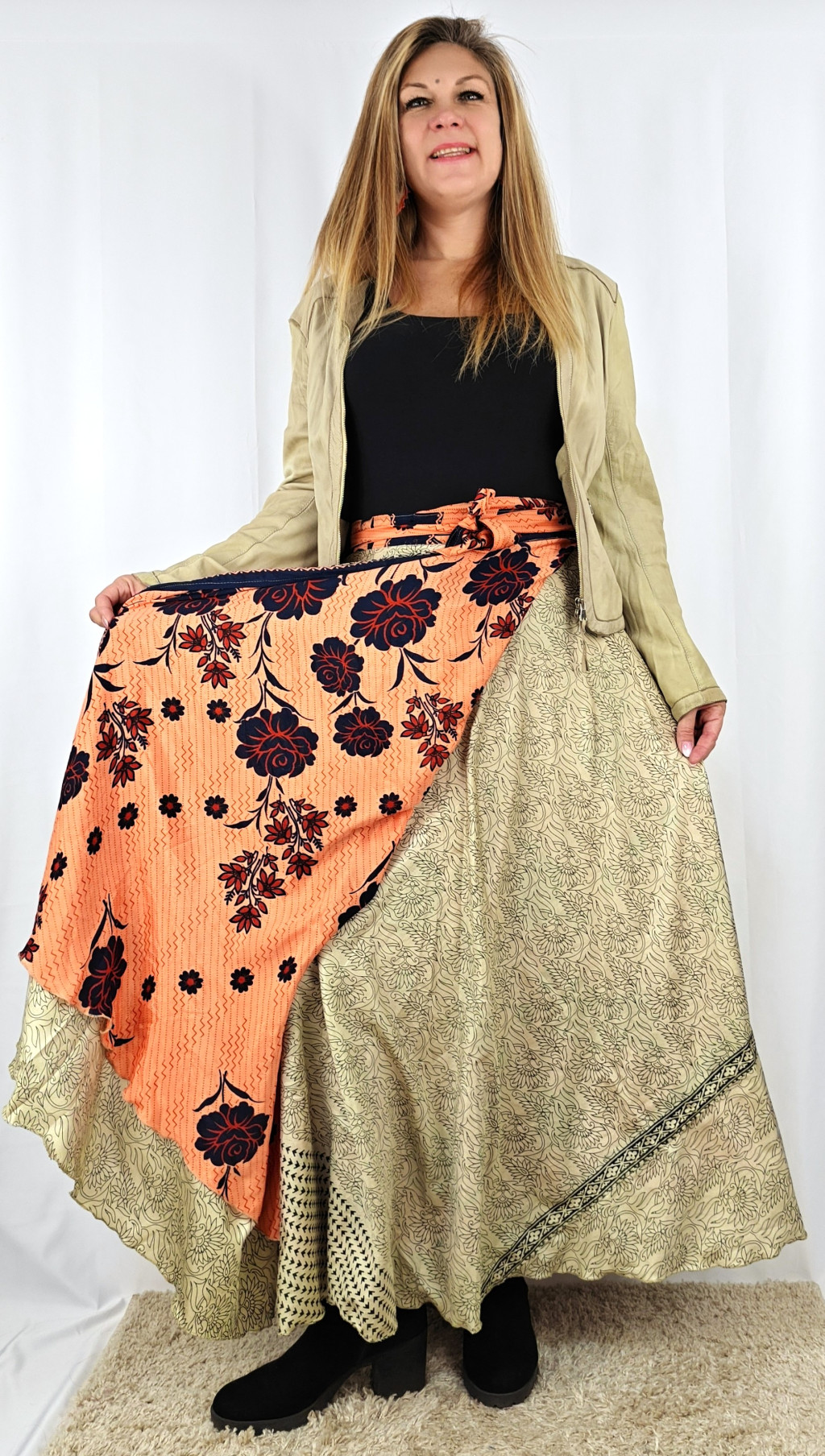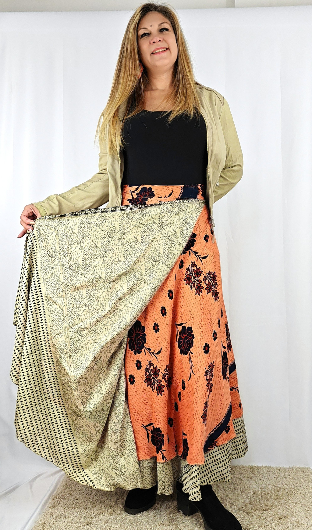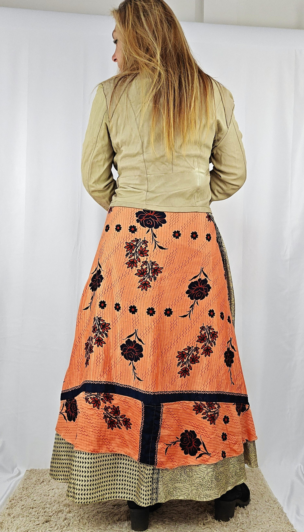 Lapszoknyáink újrahasznosított szárikból készülnek Indiában, egy hosszabb és egy rövidebb anyag derékban összevarrva! Két oldalú, kifordítható, mindkét oldala hordható, sokféleképpen köthető, variálható. Szoknyáinkból nincs két egyforma, mindegyikből csak EGY darab van, ha megtetszik, csapj le rá!