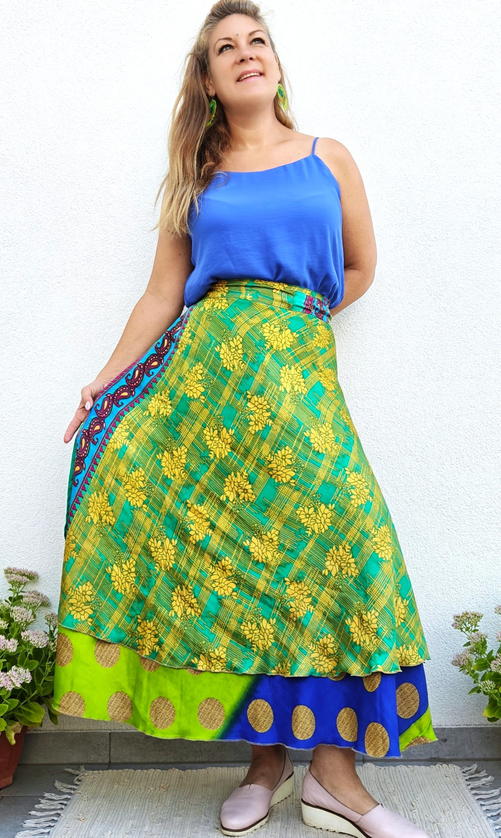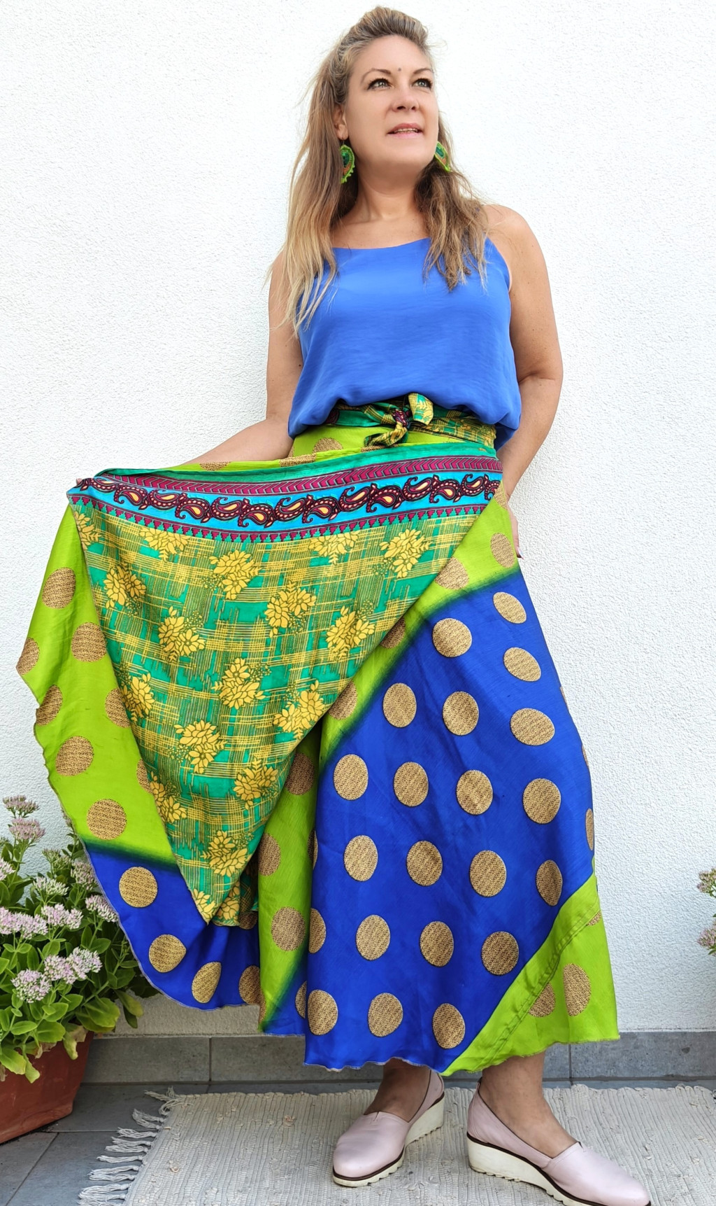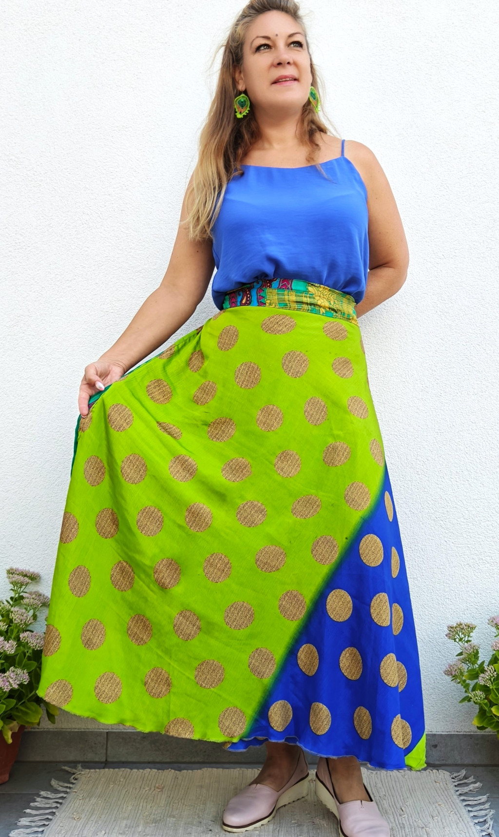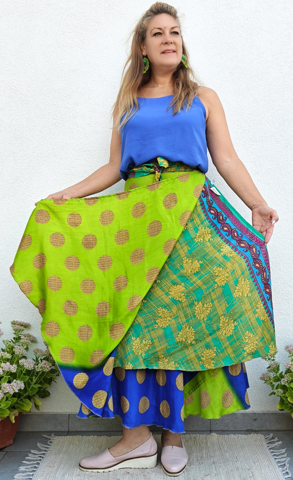 Lapszoknyáink újrahasznosított szárikból készülnek Indiában, egy hosszabb és egy rövidebb anyag derékban összevarrva! Két oldalú, kifordítható, mindkét oldala hordható, sokféleképpen köthető, variálható. Szoknyáinkból nincs két egyforma, mindegyikből csak EGY darab van, ha megtetszik, csapj le rá!