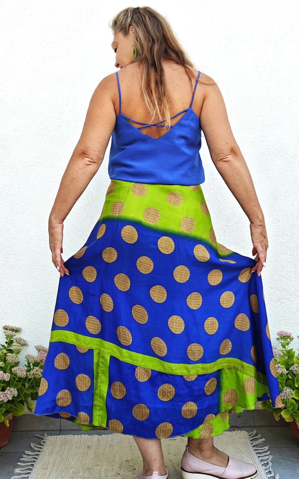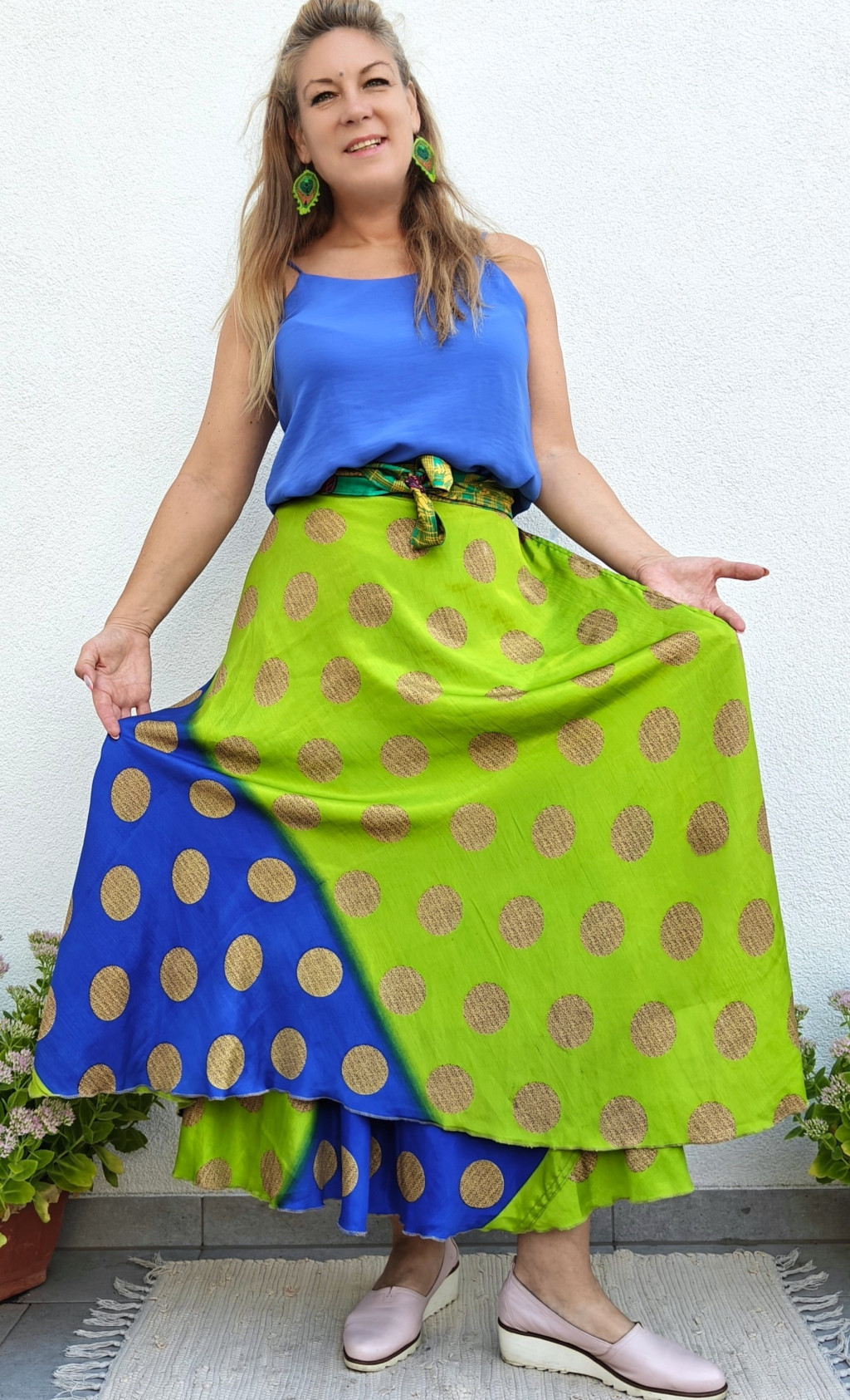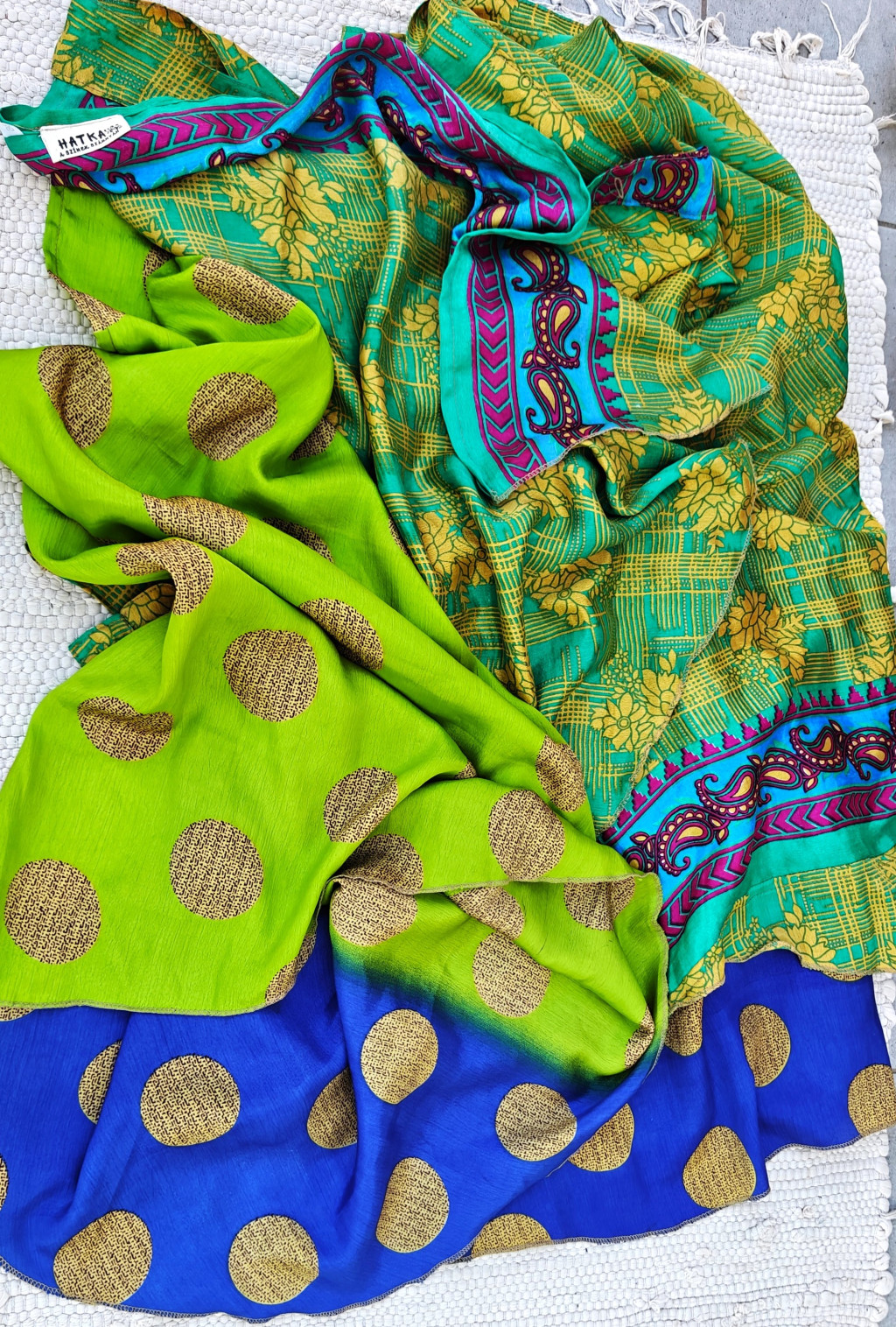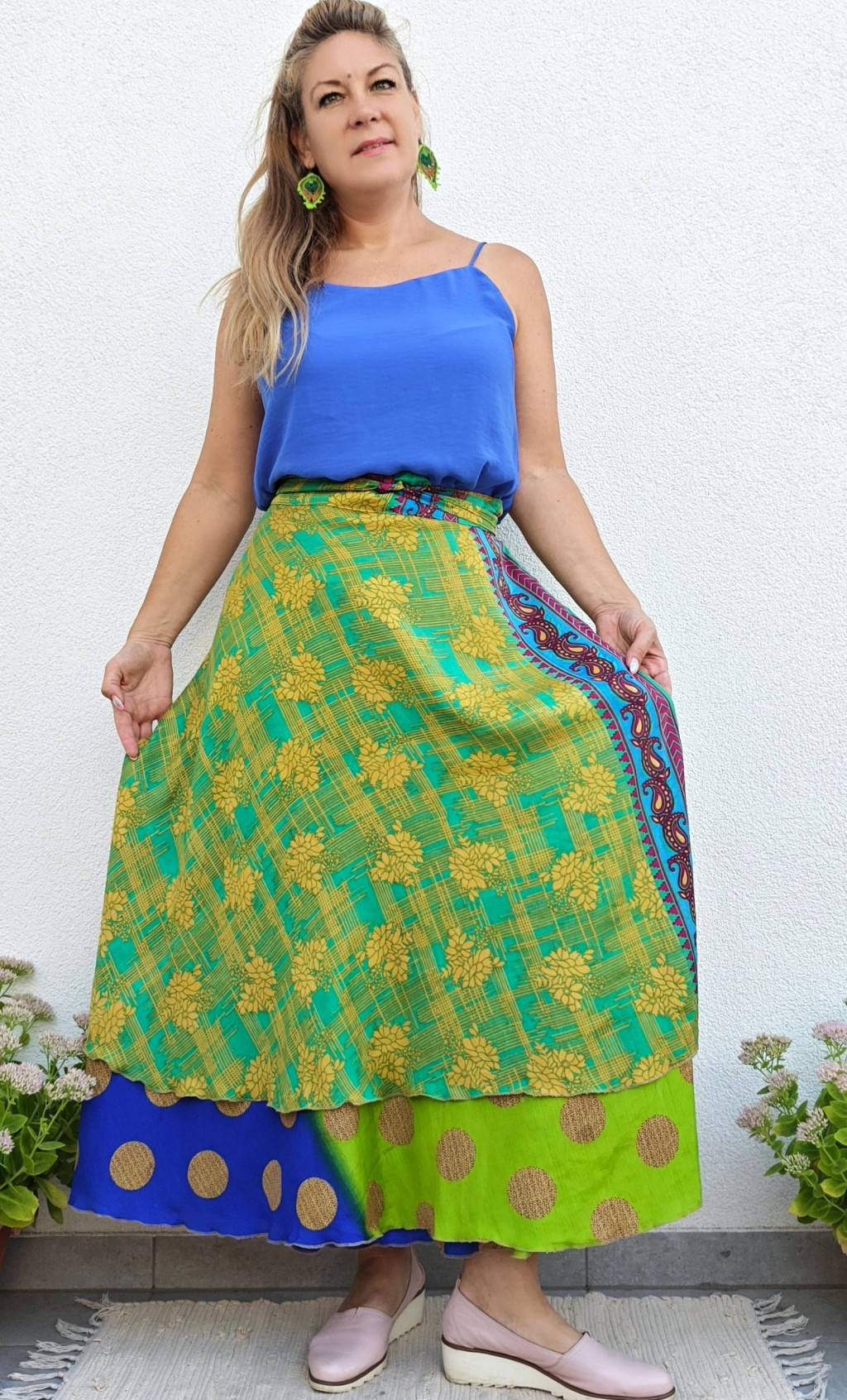 Lapszoknyáink újrahasznosított szárikból készülnek Indiában, egy hosszabb és egy rövidebb anyag derékban összevarrva! Két oldalú, kifordítható, mindkét oldala hordható, sokféleképpen köthető, variálható. Szoknyáinkból nincs két egyforma, mindegyikből csak EGY darab van, ha megtetszik, csapj le rá!