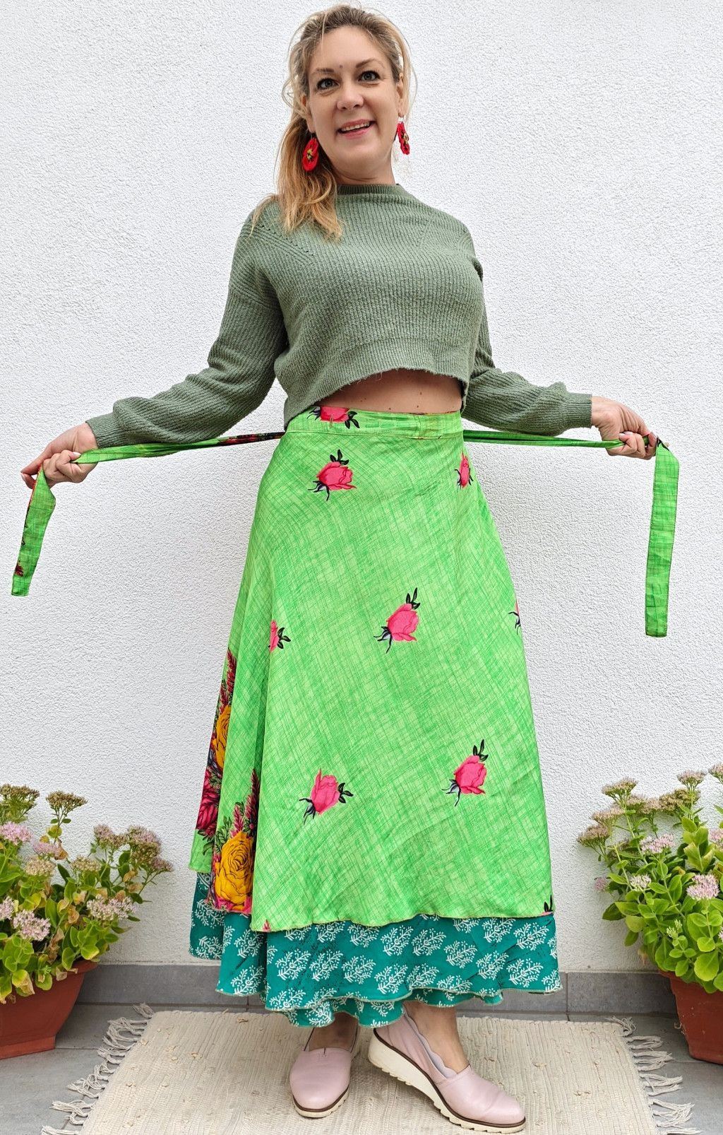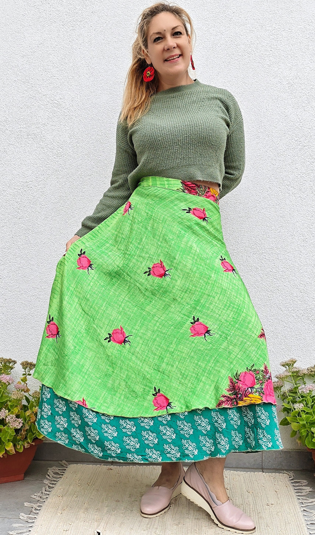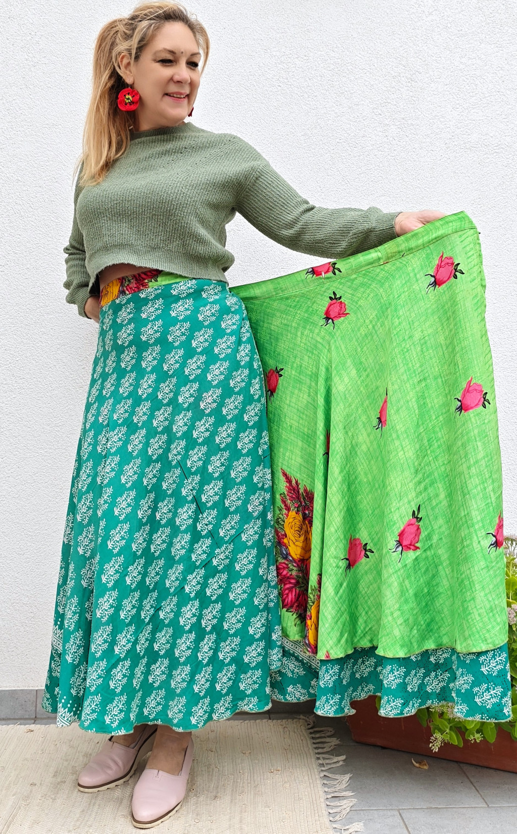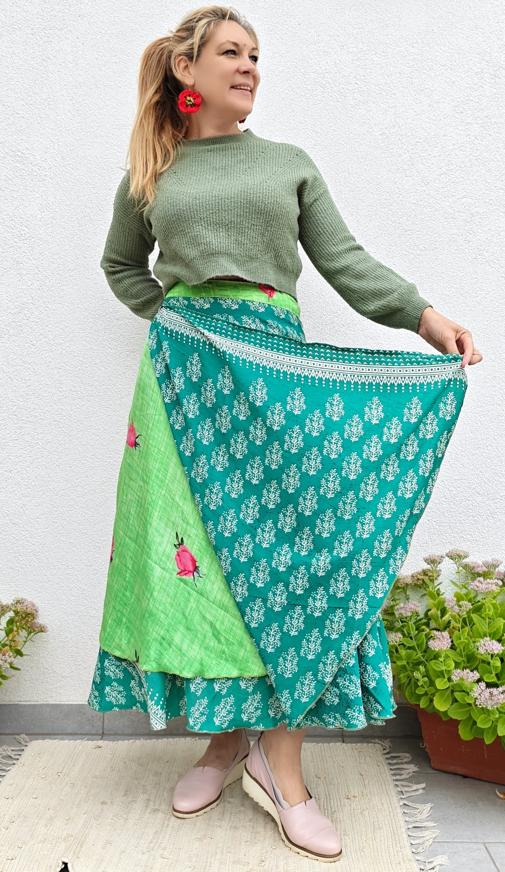 Lapszoknyáink újrahasznosított szárikból készülnek Indiában, egy hosszabb és egy rövidebb anyag derékban összevarrva! Két oldalú, kifordítható, mindkét oldala hordható, sokféleképpen köthető, variálható. Szoknyáinkból nincs két egyforma, mindegyikből csak EGY darab van, ha megtetszik, csapj le rá!