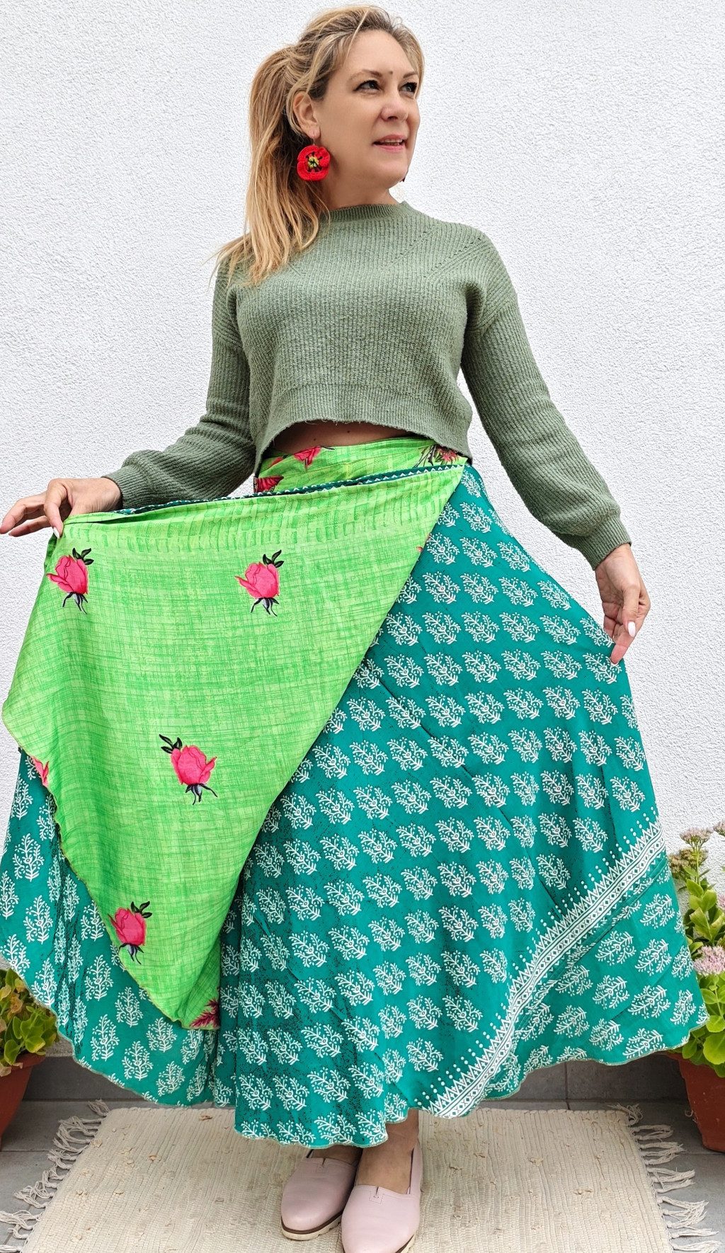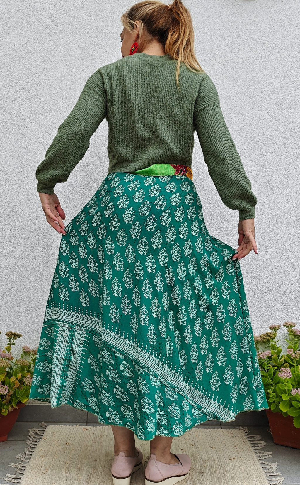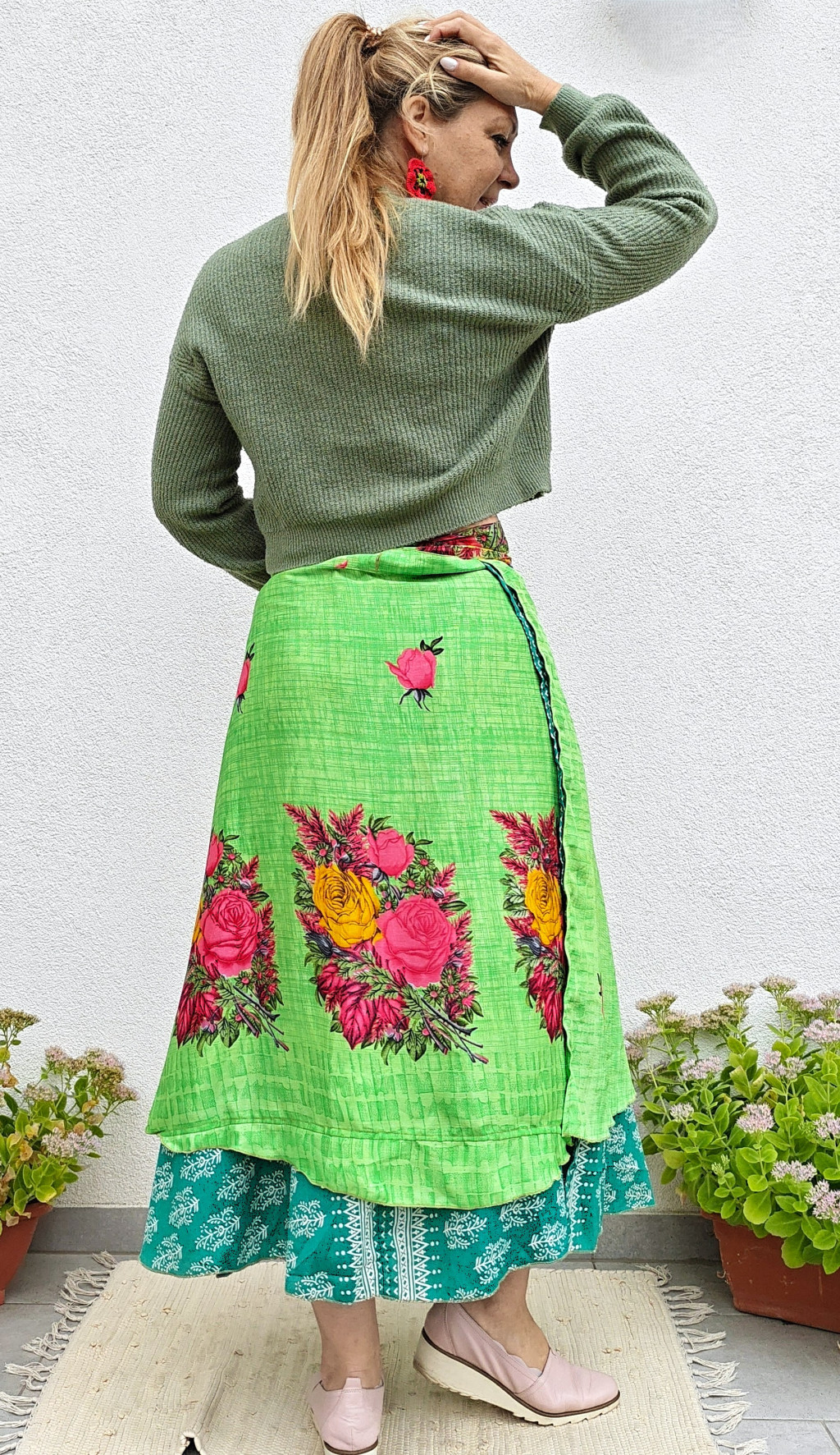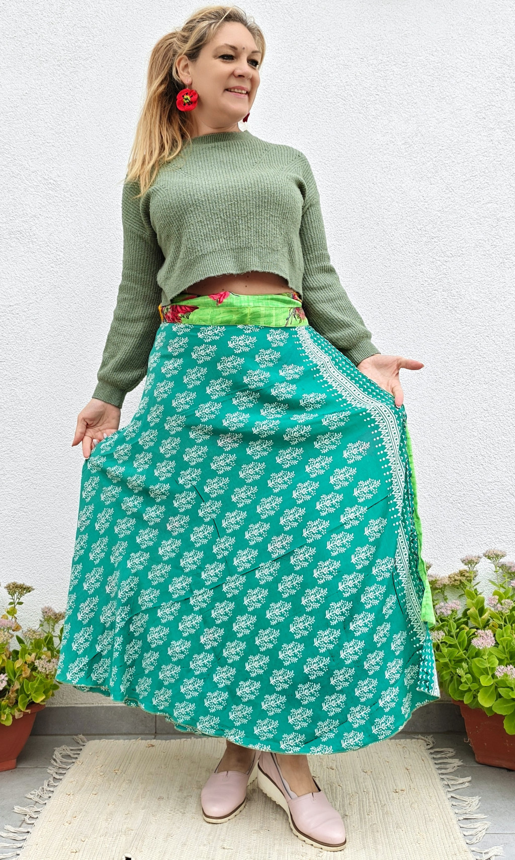 Lapszoknyáink újrahasznosított szárikból készülnek Indiában, egy hosszabb és egy rövidebb anyag derékban összevarrva! Két oldalú, kifordítható, mindkét oldala hordható, sokféleképpen köthető, variálható. Szoknyáinkból nincs két egyforma, mindegyikből csak EGY darab van, ha megtetszik, csapj le rá!