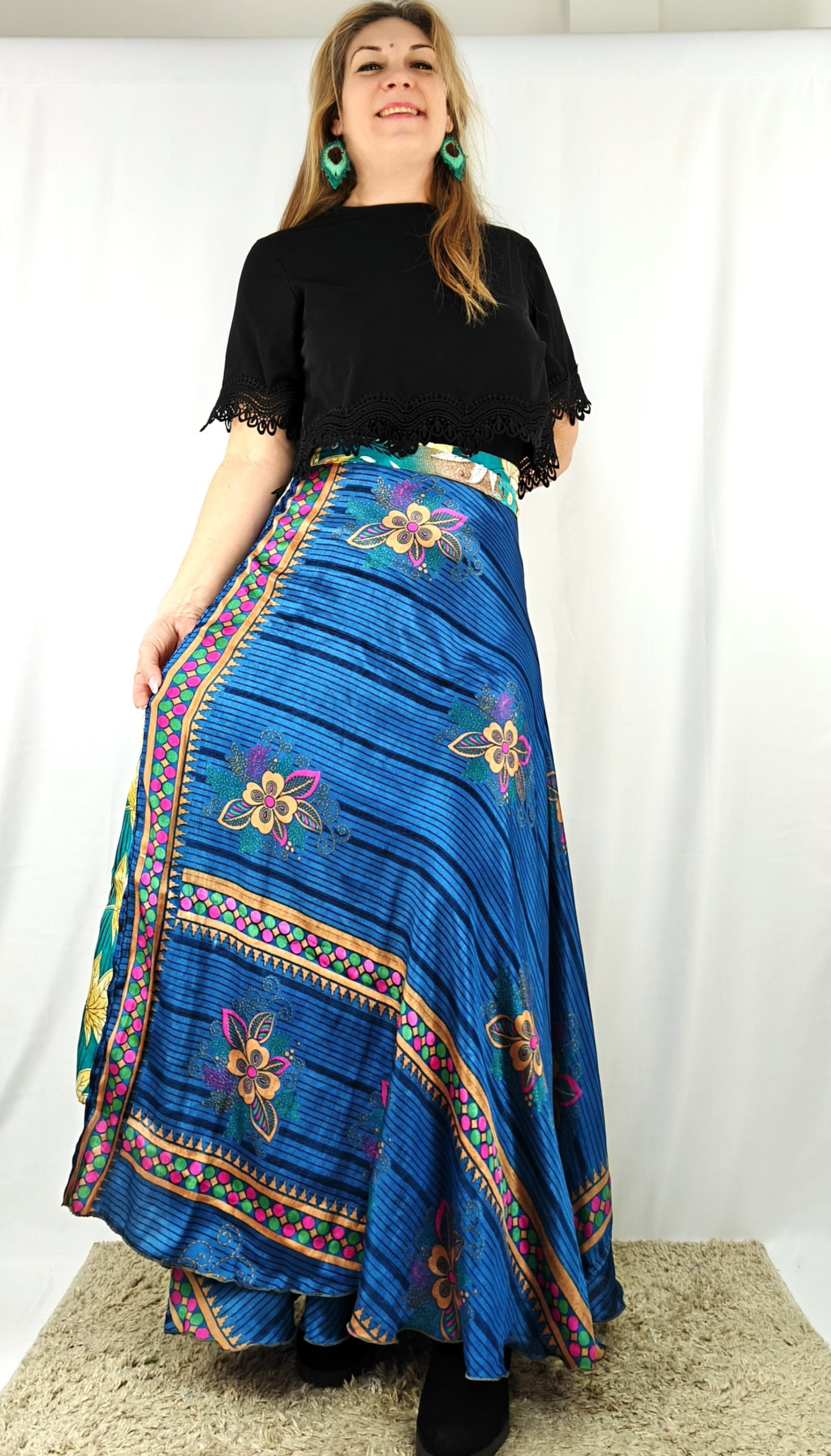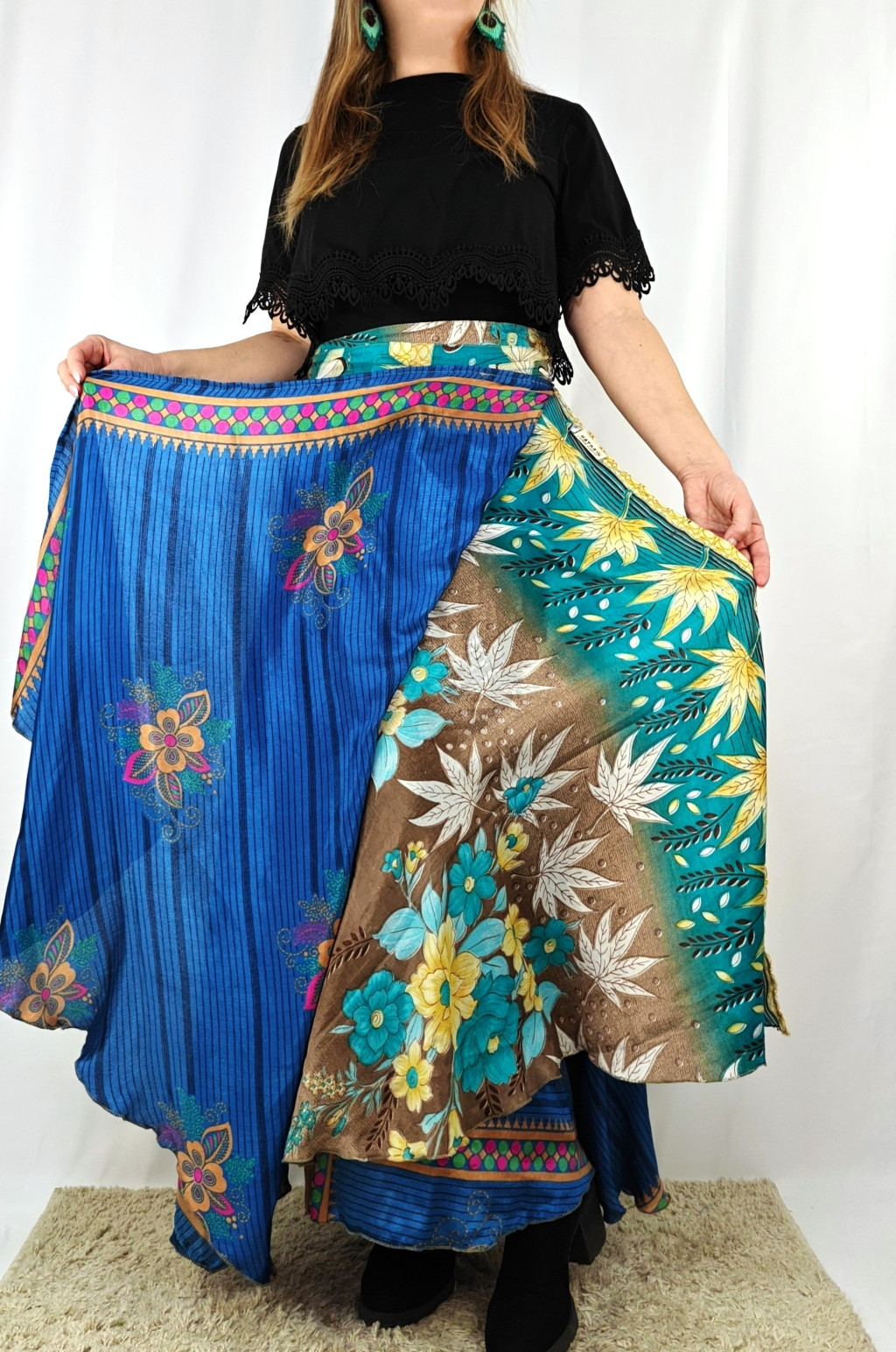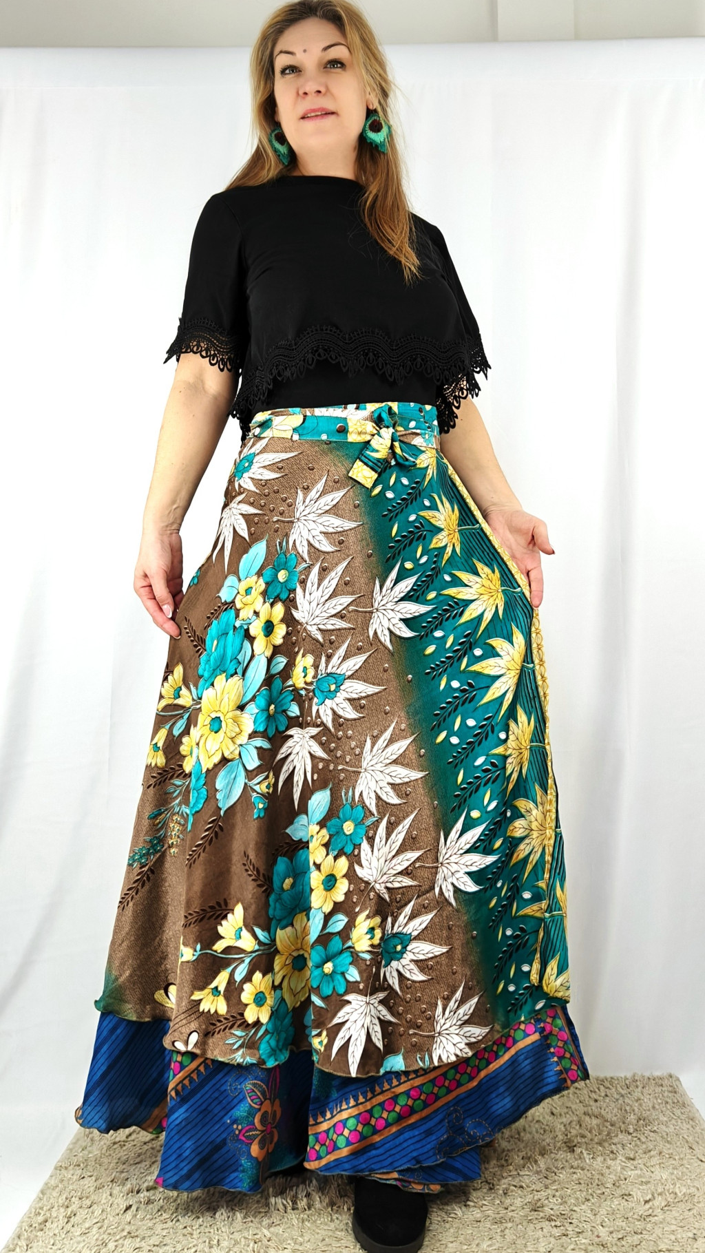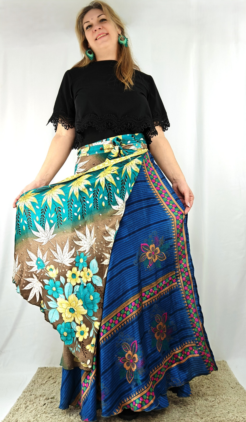 Lapszoknyáink újrahasznosított szárikból készülnek Indiában, egy hosszabb és egy rövidebb anyag derékban összevarrva! Két oldalú, kifordítható, mindkét oldala hordható, sokféleképpen köthető, variálható. Szoknyáinkból nincs két egyforma, mindegyikből csak EGY darab van, ha megtetszik, csapj le rá!