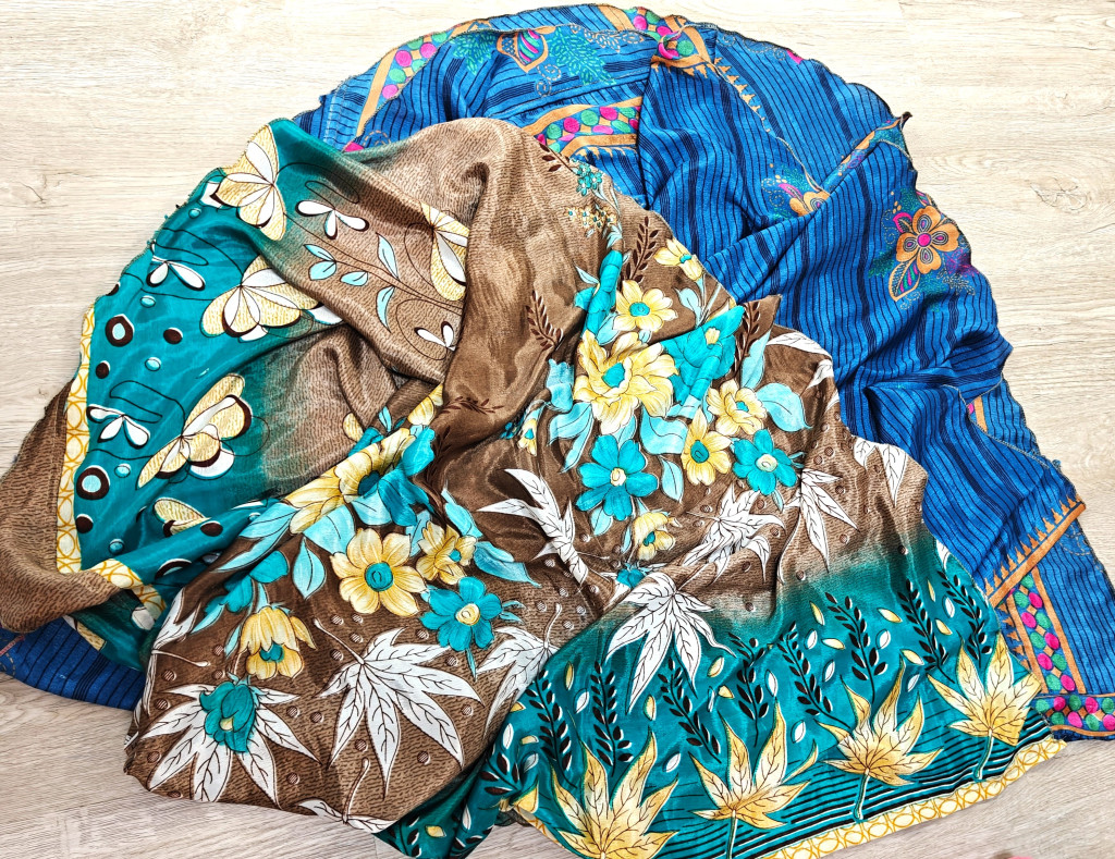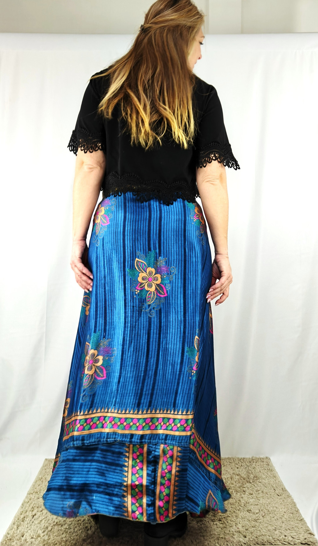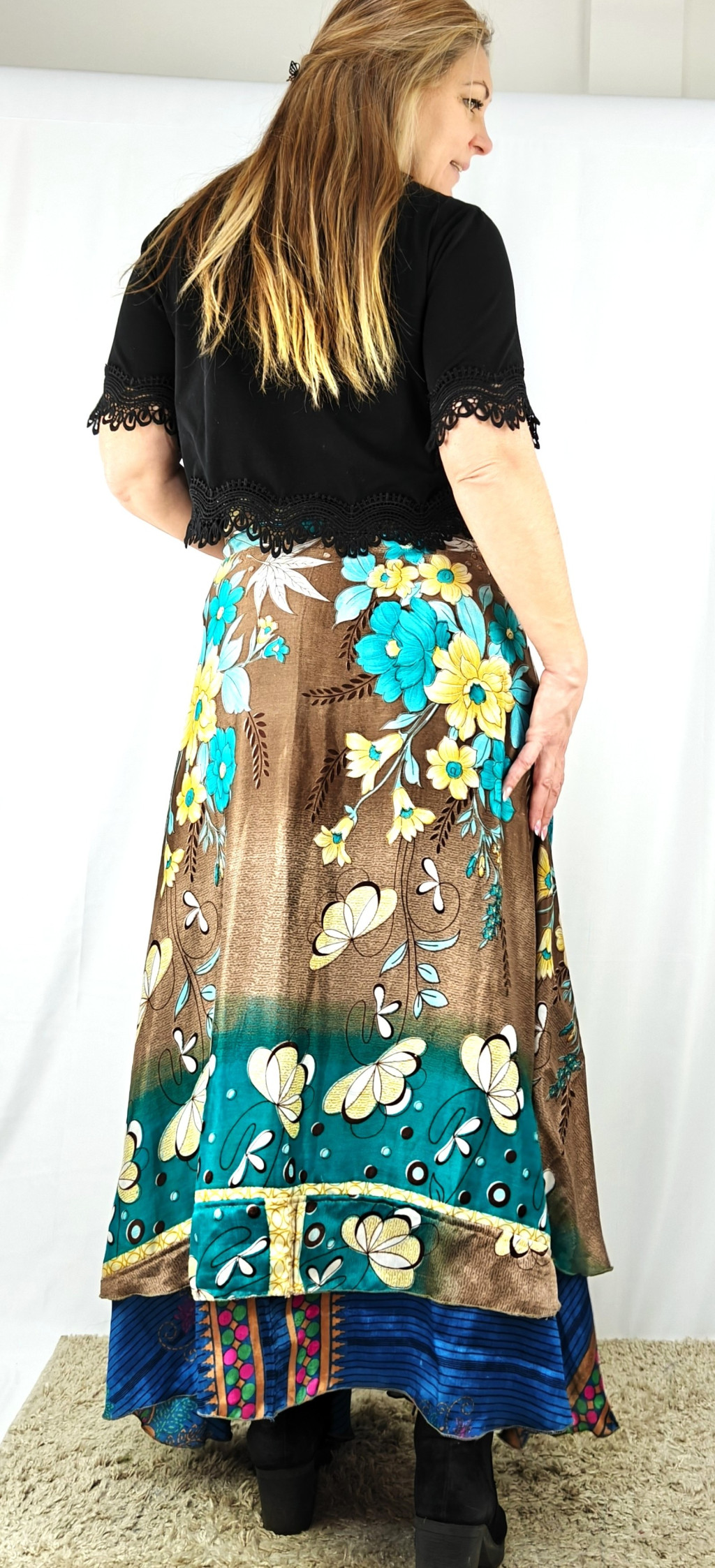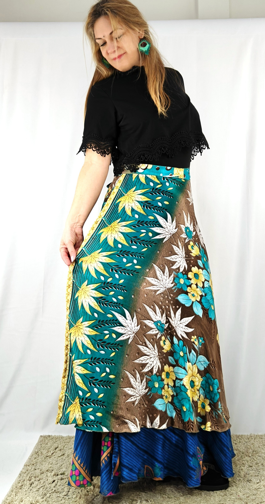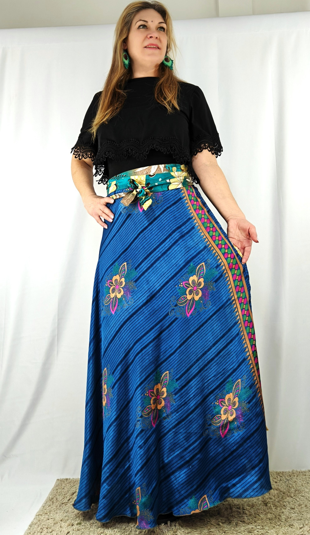 Lapszoknyáink újrahasznosított szárikból készülnek Indiában, egy hosszabb és egy rövidebb anyag derékban összevarrva! Két oldalú, kifordítható, mindkét oldala hordható, sokféleképpen köthető, variálható. Szoknyáinkból nincs két egyforma, mindegyikből csak EGY darab van, ha megtetszik, csapj le rá!