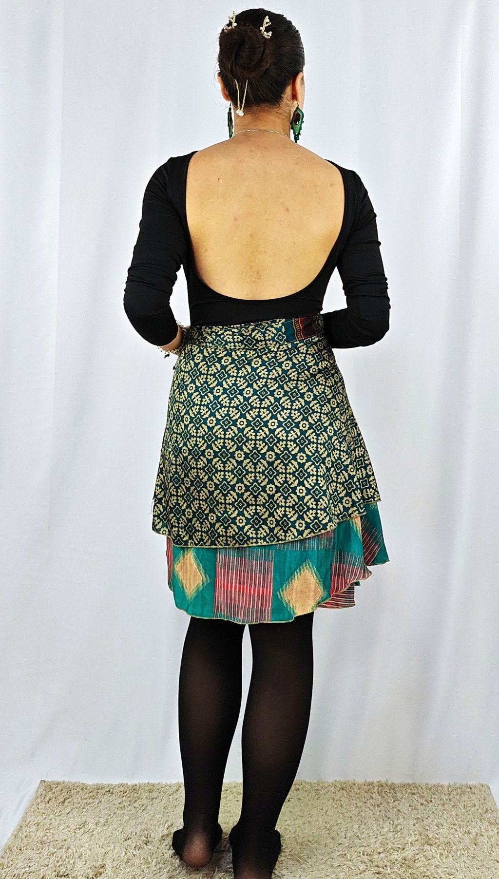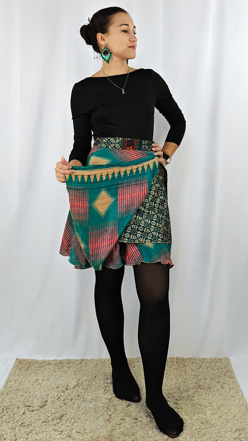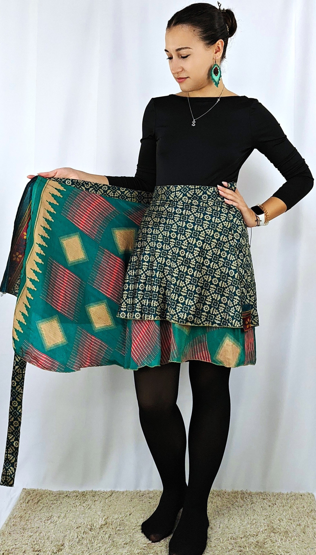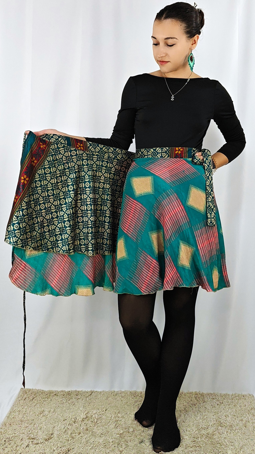 Lapszoknyáink újrahasznosított szárikból készülnek Indiában, egy hosszabb és egy rövidebb anyag derékban összevarrva! Két oldalú, kifordítható, mindkét oldala hordható, sokféleképpen köthető, variálható. Szoknyáinkból nincs két egyforma, mindegyikből csak EGY darab van, ha megtetszik, csapj le rá!