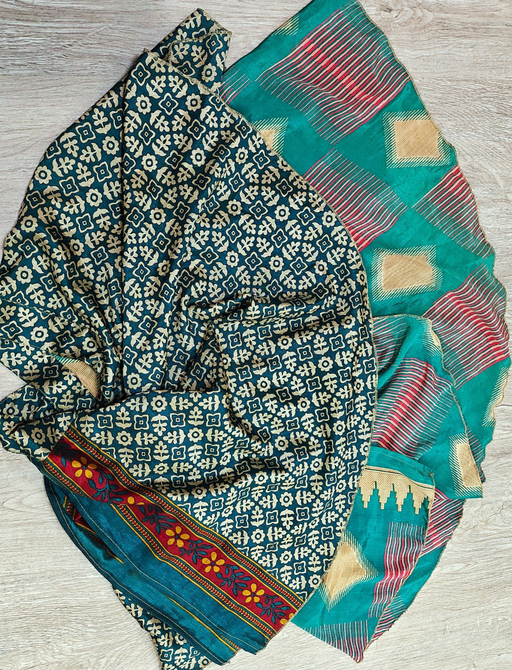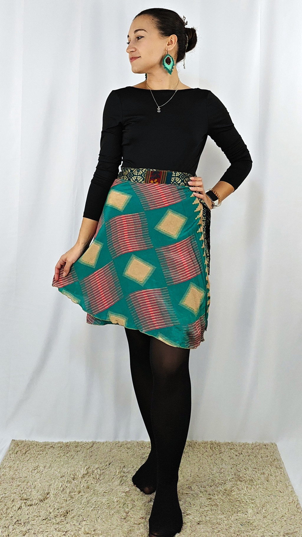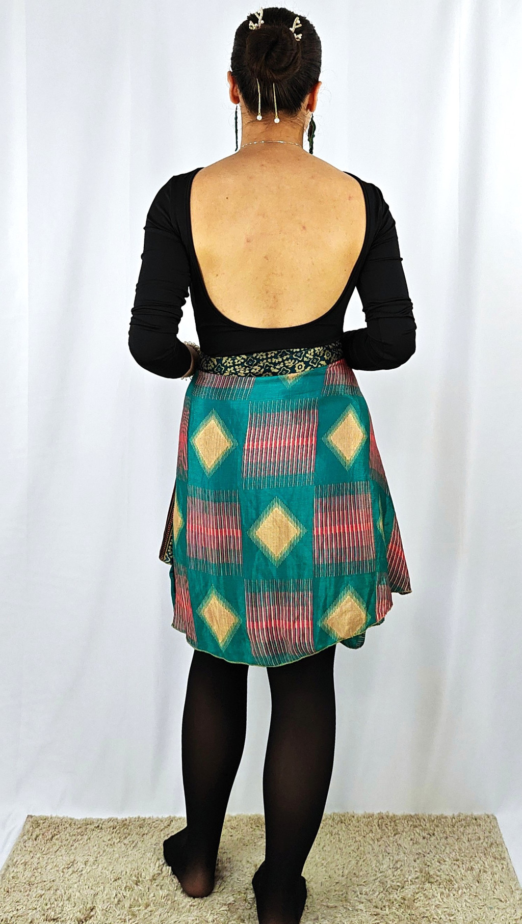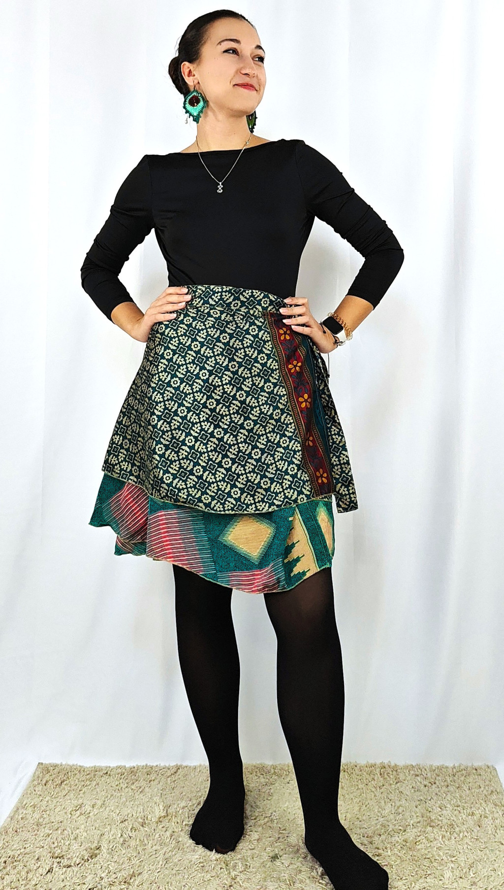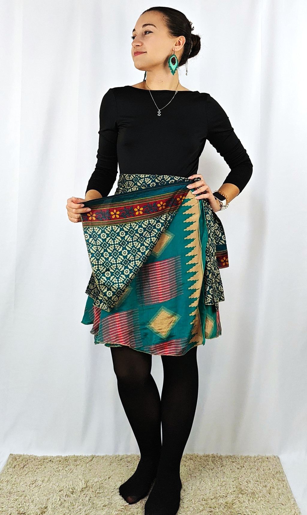 Lapszoknyáink újrahasznosított szárikból készülnek Indiában, egy hosszabb és egy rövidebb anyag derékban összevarrva! Két oldalú, kifordítható, mindkét oldala hordható, sokféleképpen köthető, variálható. Szoknyáinkból nincs két egyforma, mindegyikből csak EGY darab van, ha megtetszik, csapj le rá!