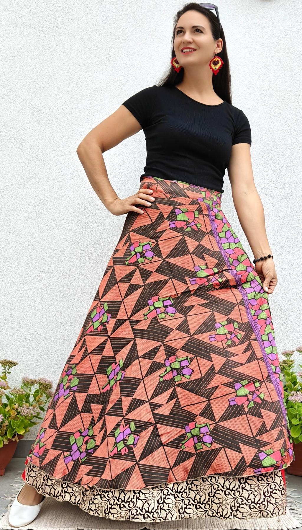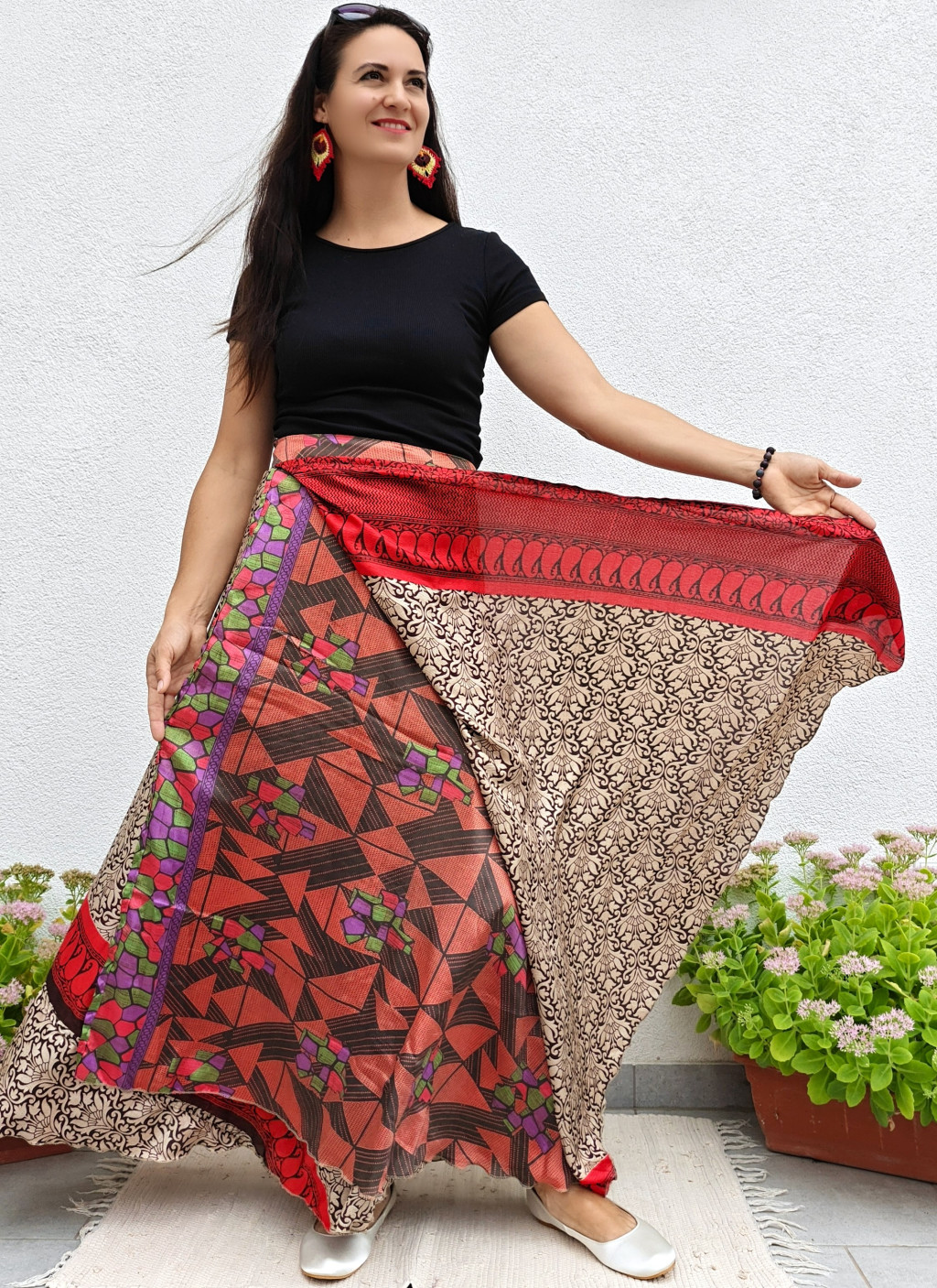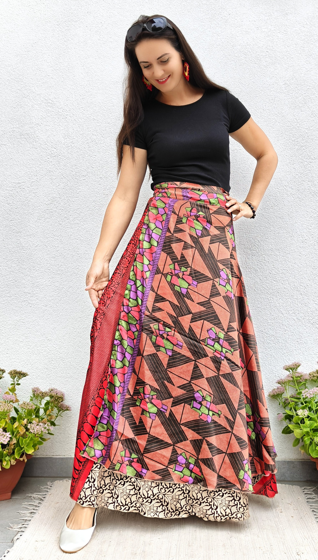 Lapszoknyáink újrahasznosított szárikból készülnek Indiában, egy hosszabb és egy rövidebb anyag derékban összevarrva! Két oldalú, kifordítható, mindkét oldala hordható, sokféleképpen köthető, variálható. Szoknyáinkból nincs két egyforma, mindegyikből csak EGY darab van, ha megtetszik, csapj le rá!