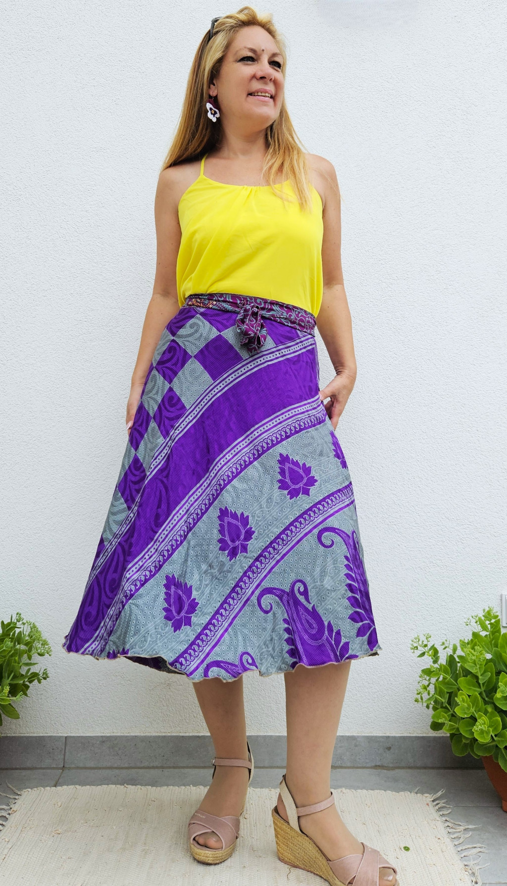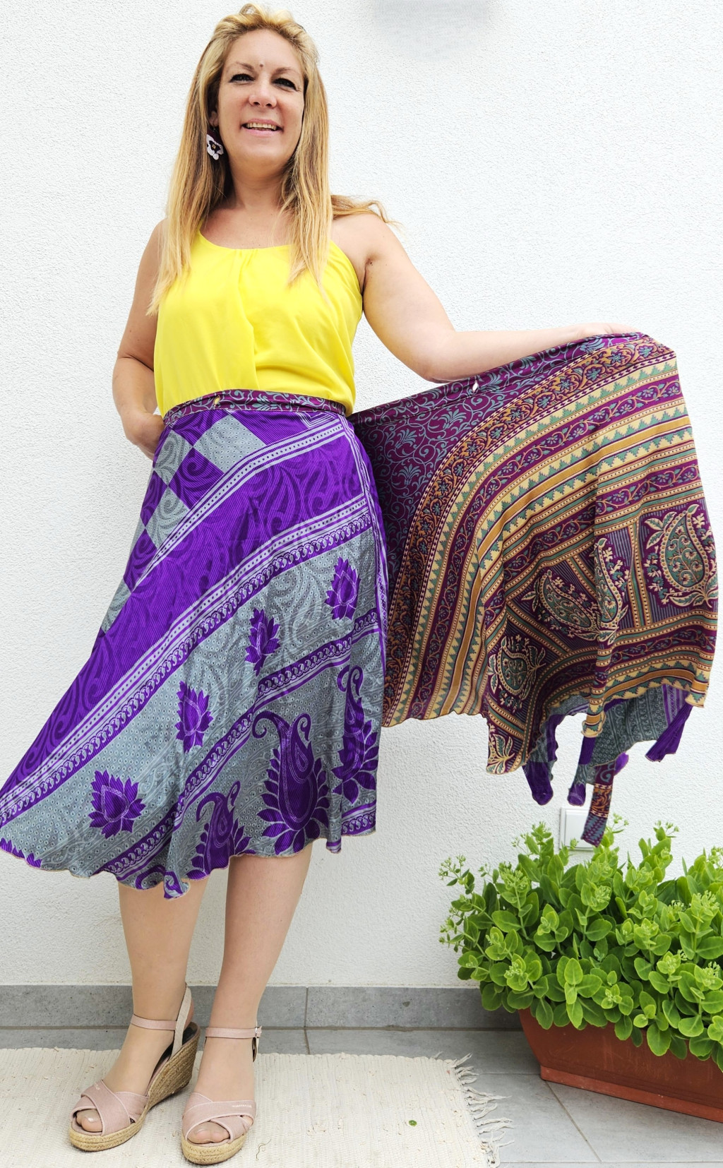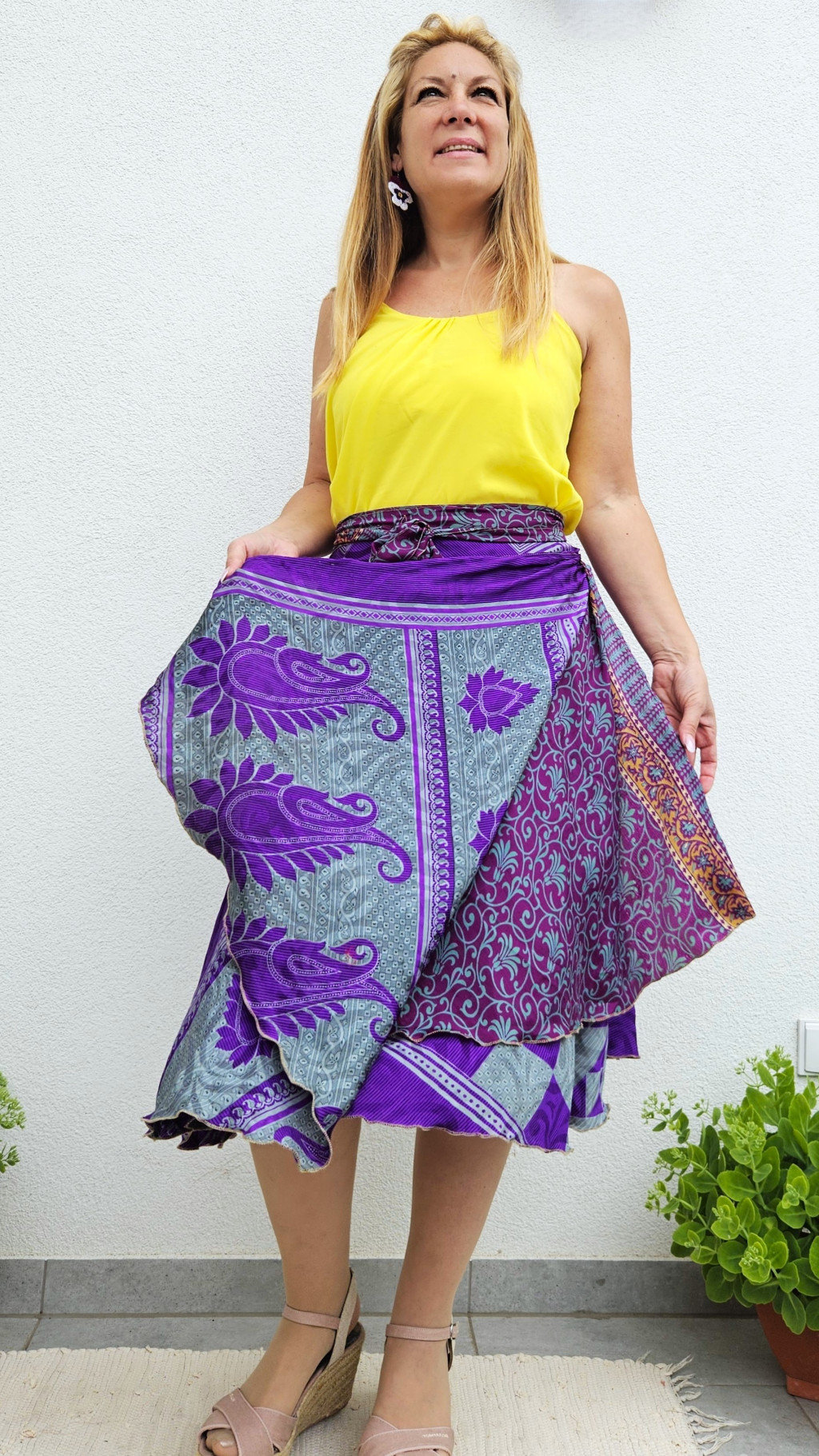 Lapszoknyáink újrahasznosított szárikból készülnek Indiában, egy hosszabb és egy rövidebb anyag derékban összevarrva! Kifordítható, mindkét oldala hordható, sokféleképpen köthető, variálható. Szoknyáinkból nincs két egyforma, mindegyikből csak EGY darab van, ha megtetszik, csapj le rá!