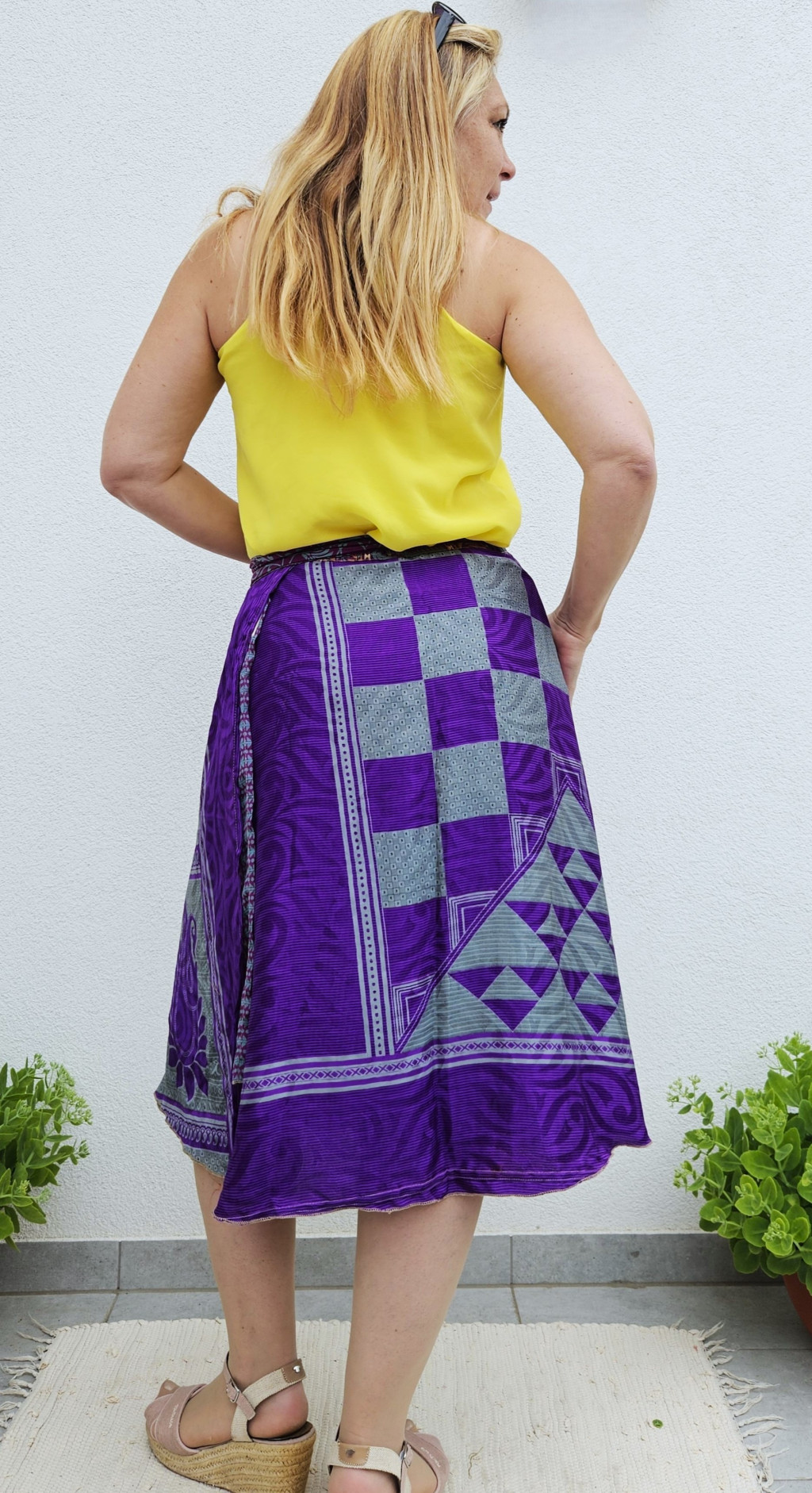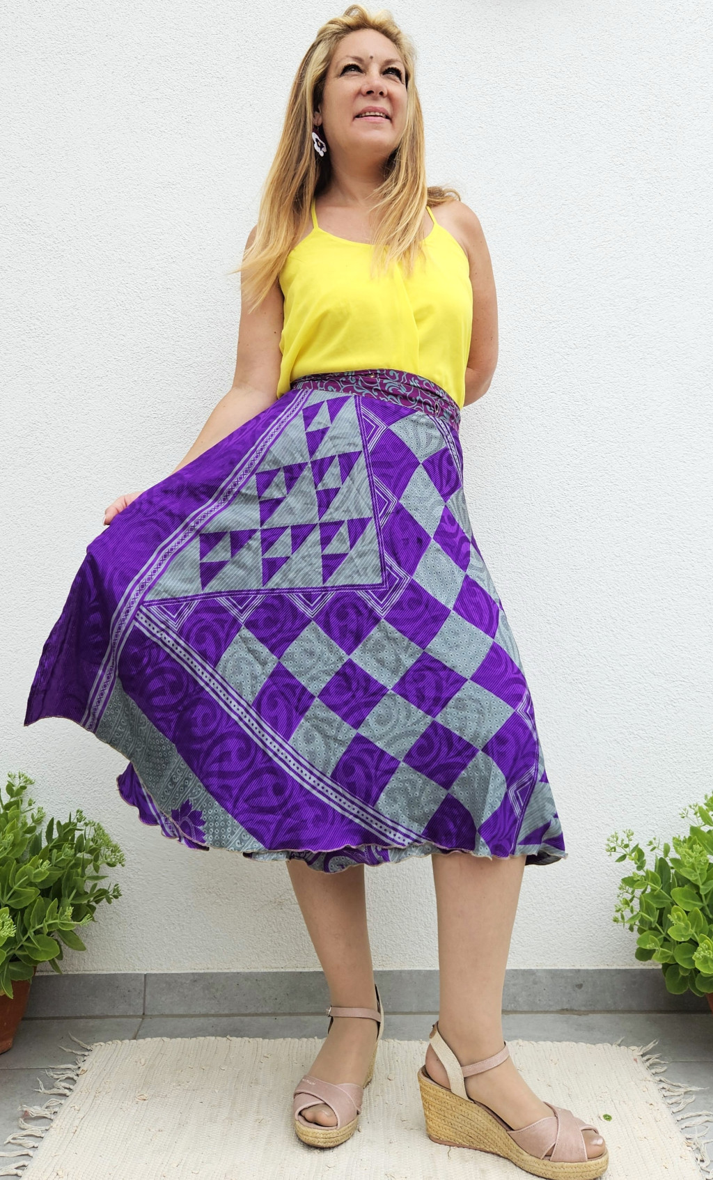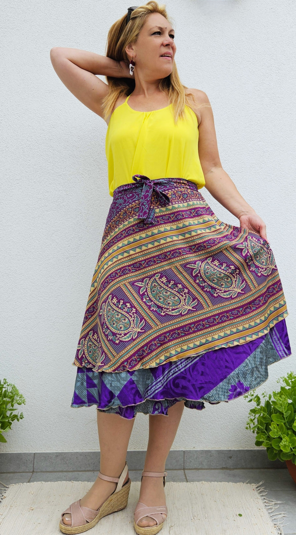 Lapszoknyáink újrahasznosított szárikból készülnek Indiában, egy hosszabb és egy rövidebb anyag derékban összevarrva! Kifordítható, mindkét oldala hordható, sokféleképpen köthető, variálható. Szoknyáinkból nincs két egyforma, mindegyikből csak EGY darab van, ha megtetszik, csapj le rá!