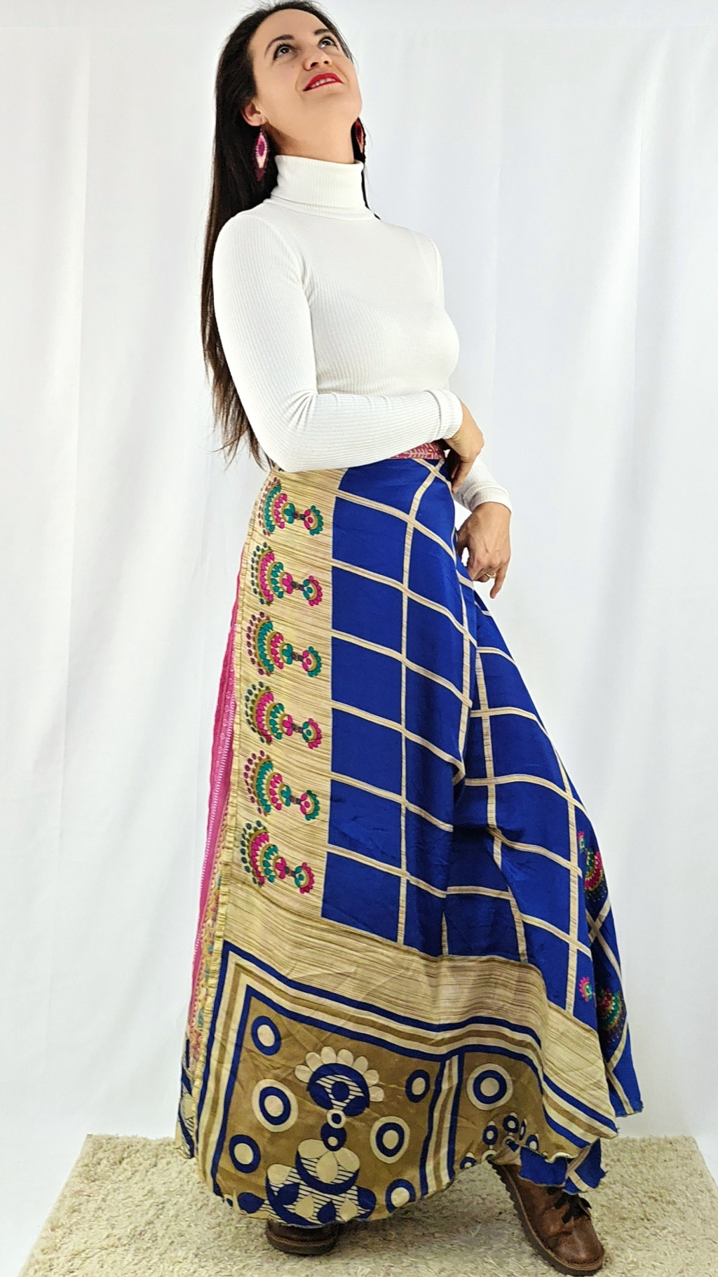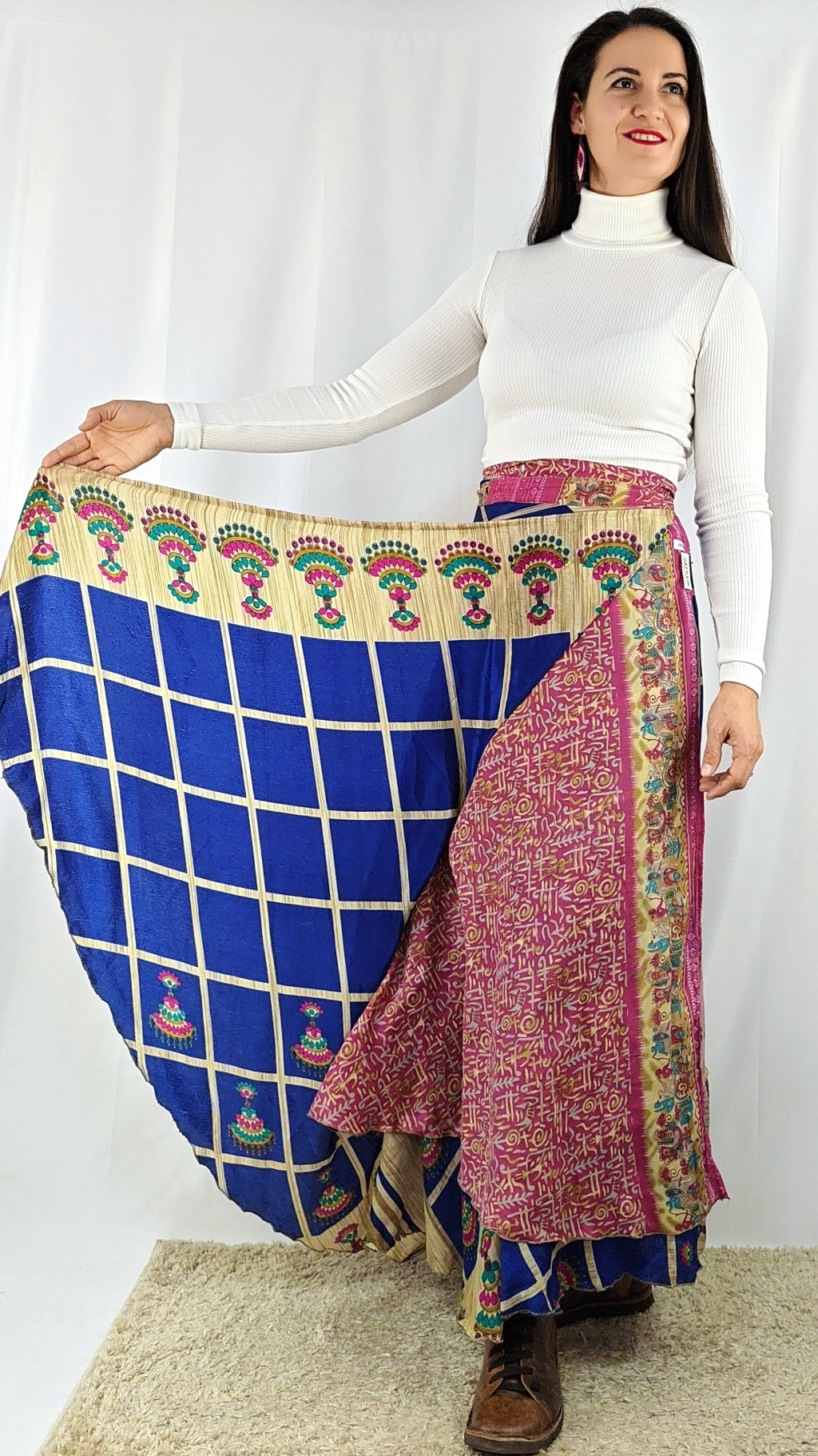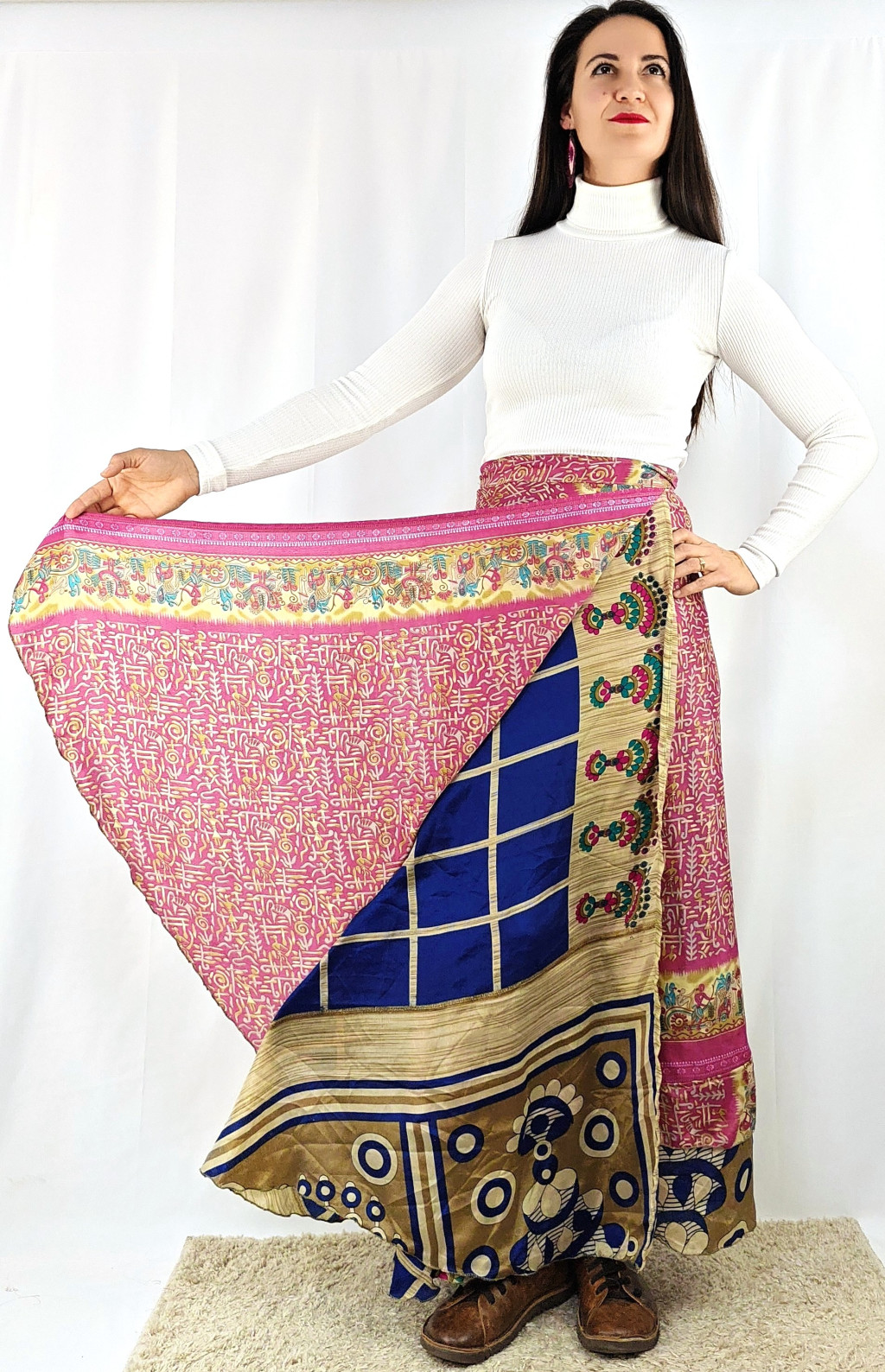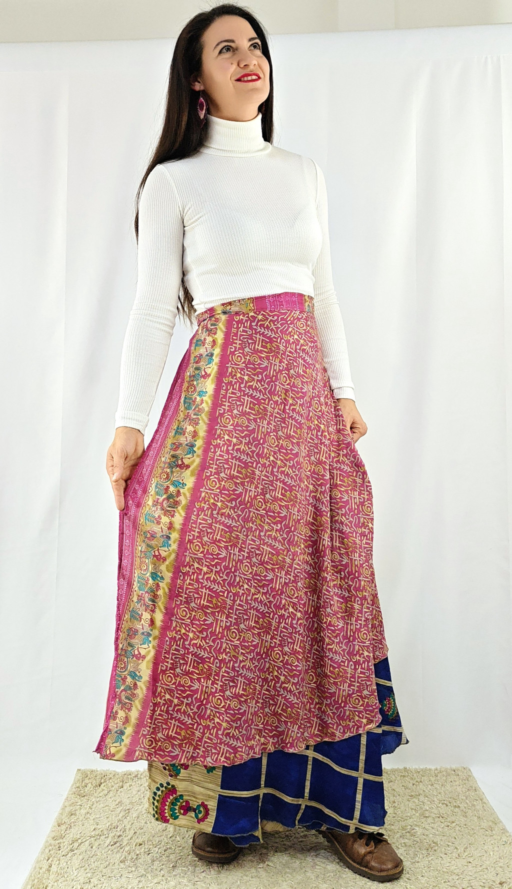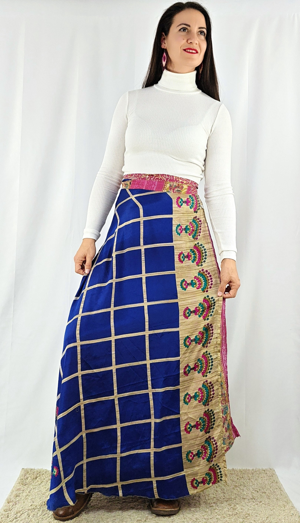 Lapszoknyáink újrahasznosított szárikból készülnek Indiában, egy hosszabb és egy rövidebb anyag derékban összevarrva! Két oldalú, kifordítható, mindkét oldala hordható, sokféleképpen köthető, variálható. Szoknyáinkból nincs két egyforma, mindegyikből csak EGY darab van, ha megtetszik, csapj le rá!