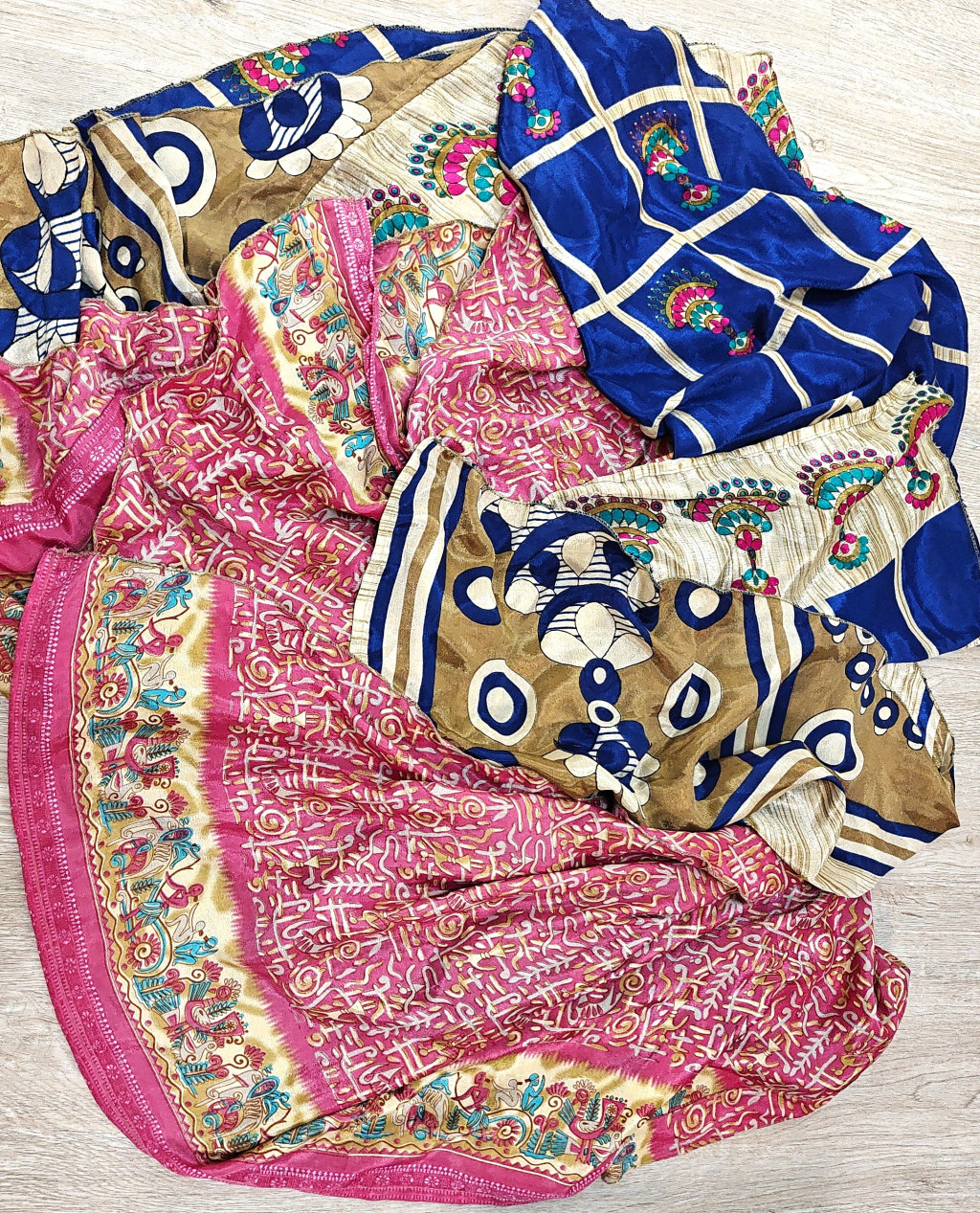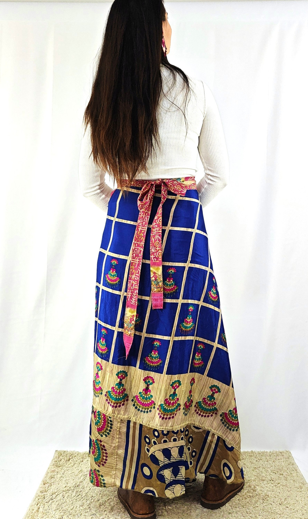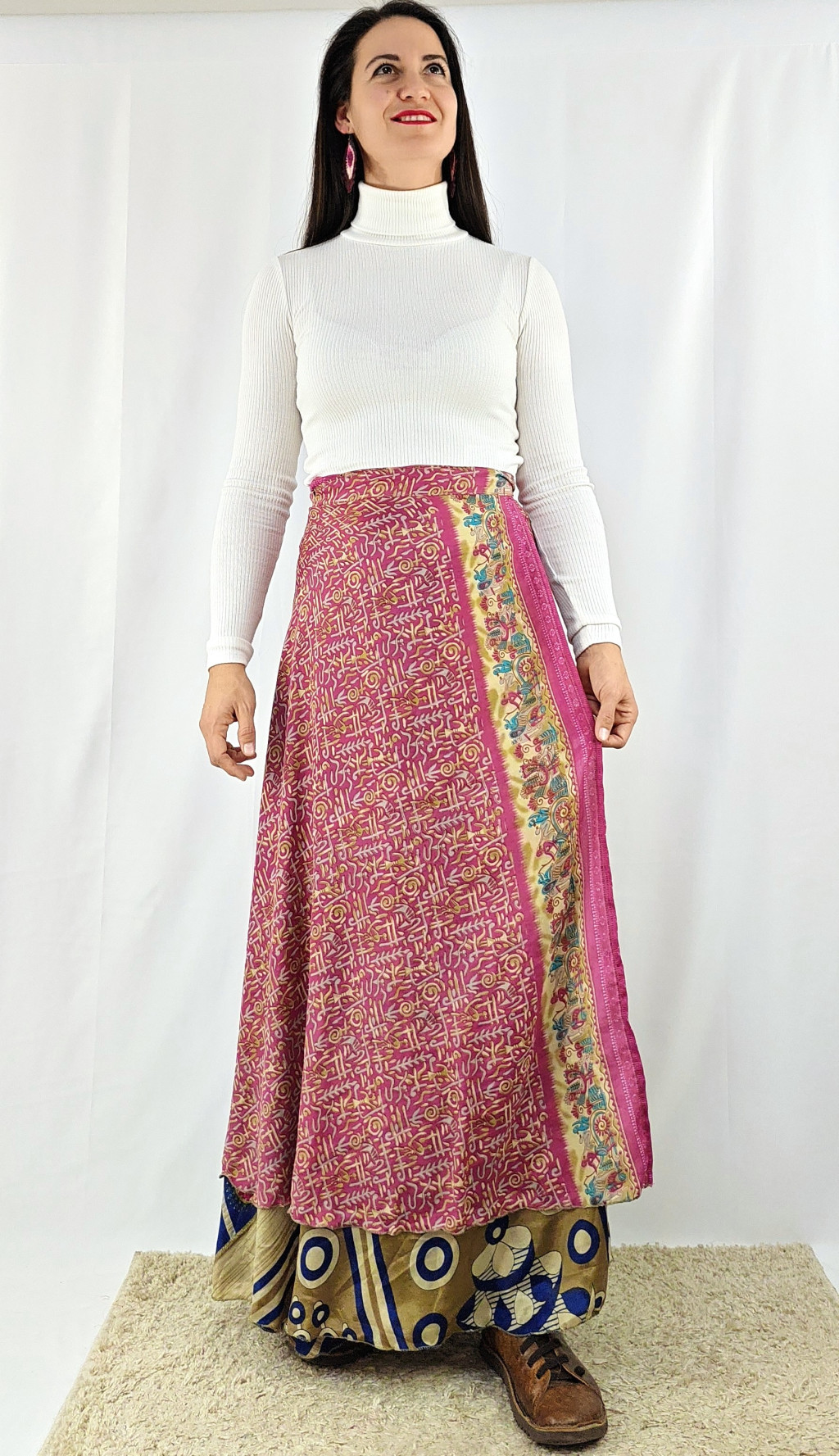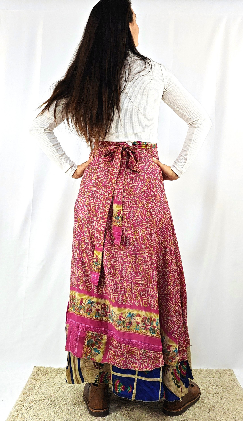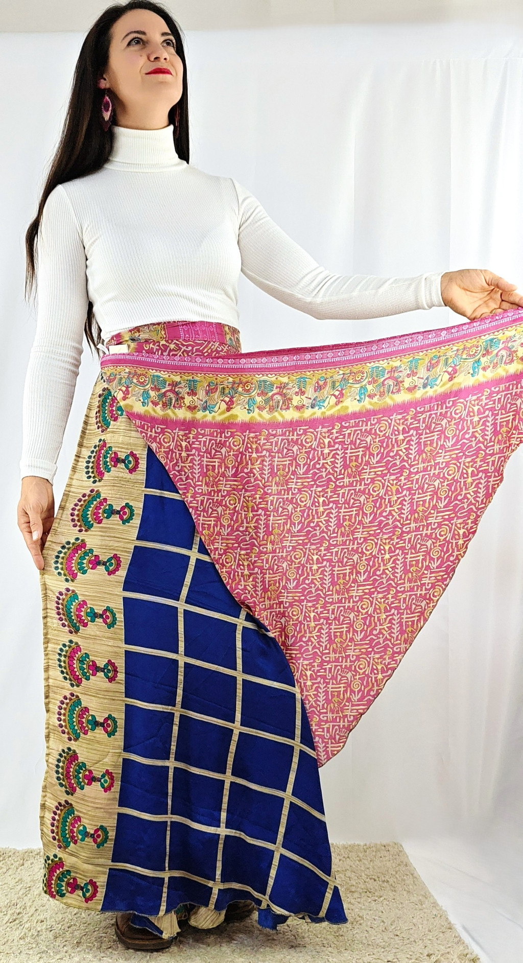 Lapszoknyáink újrahasznosított szárikból készülnek Indiában, egy hosszabb és egy rövidebb anyag derékban összevarrva! Két oldalú, kifordítható, mindkét oldala hordható, sokféleképpen köthető, variálható. Szoknyáinkból nincs két egyforma, mindegyikből csak EGY darab van, ha megtetszik, csapj le rá!