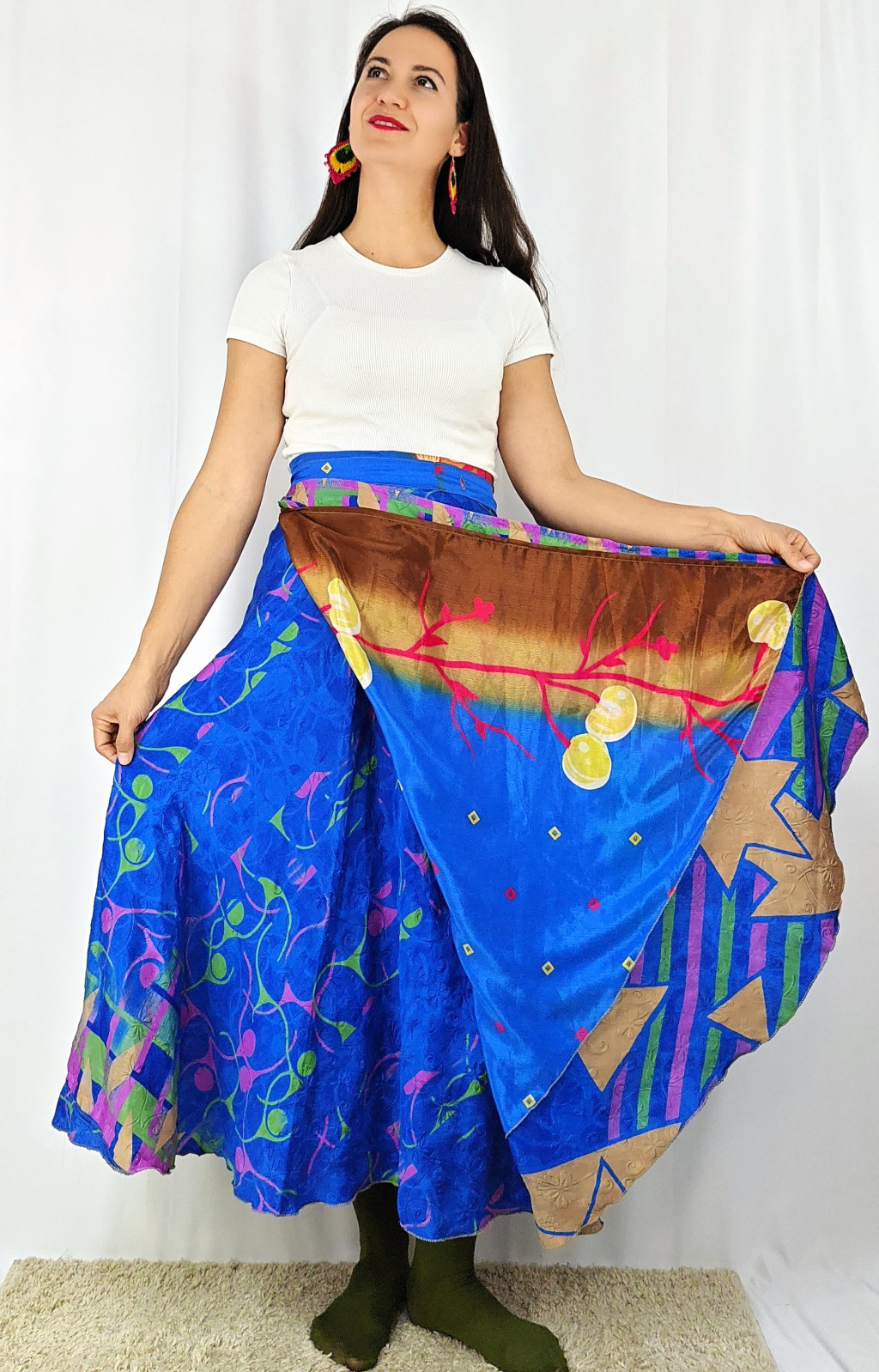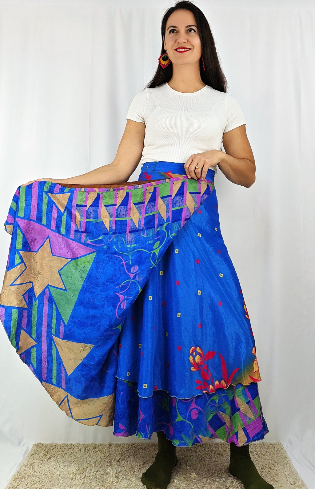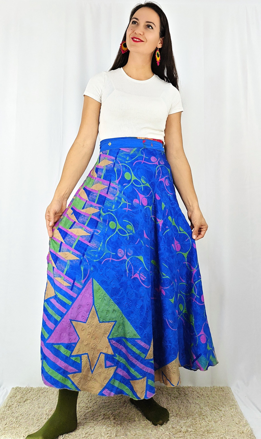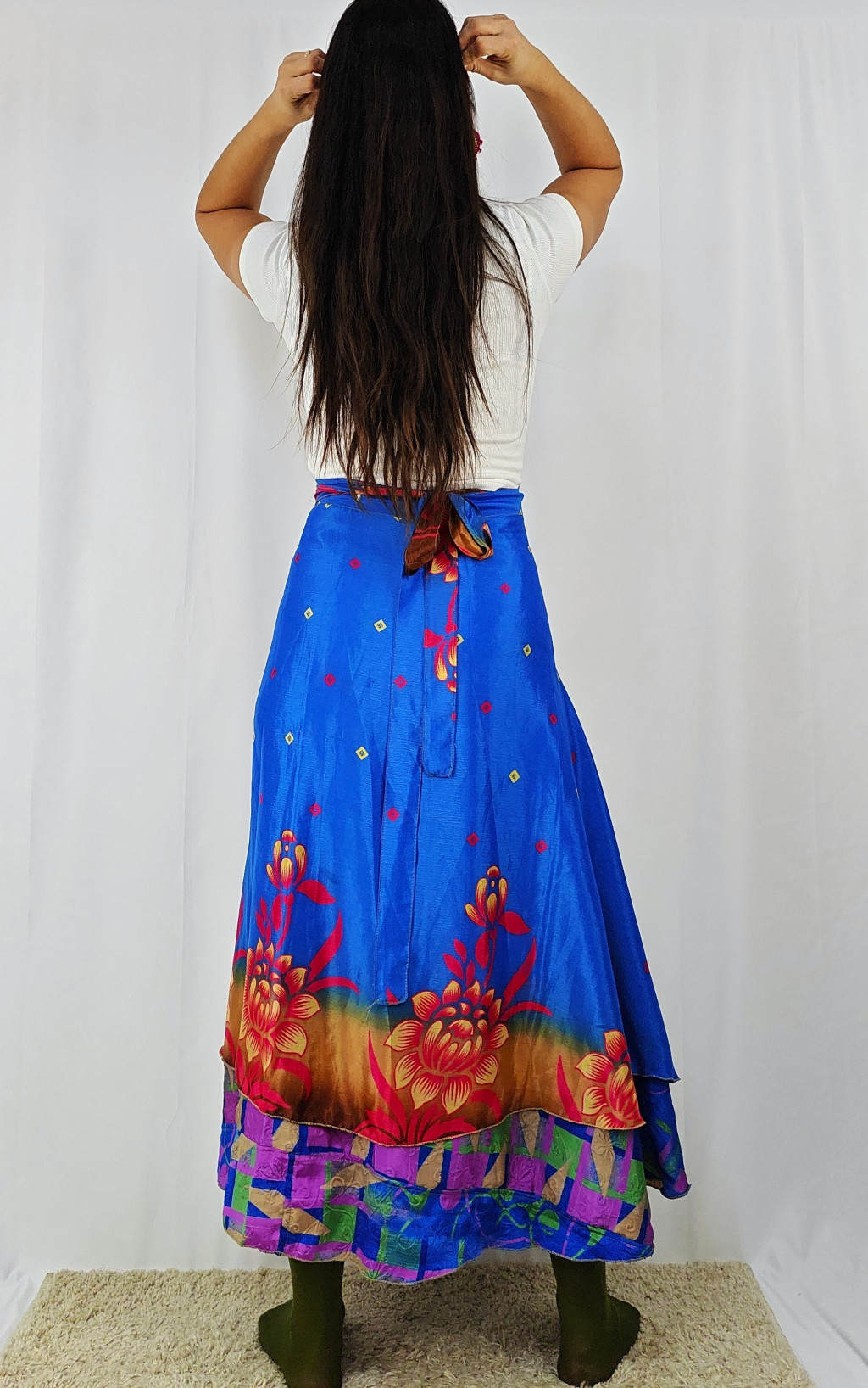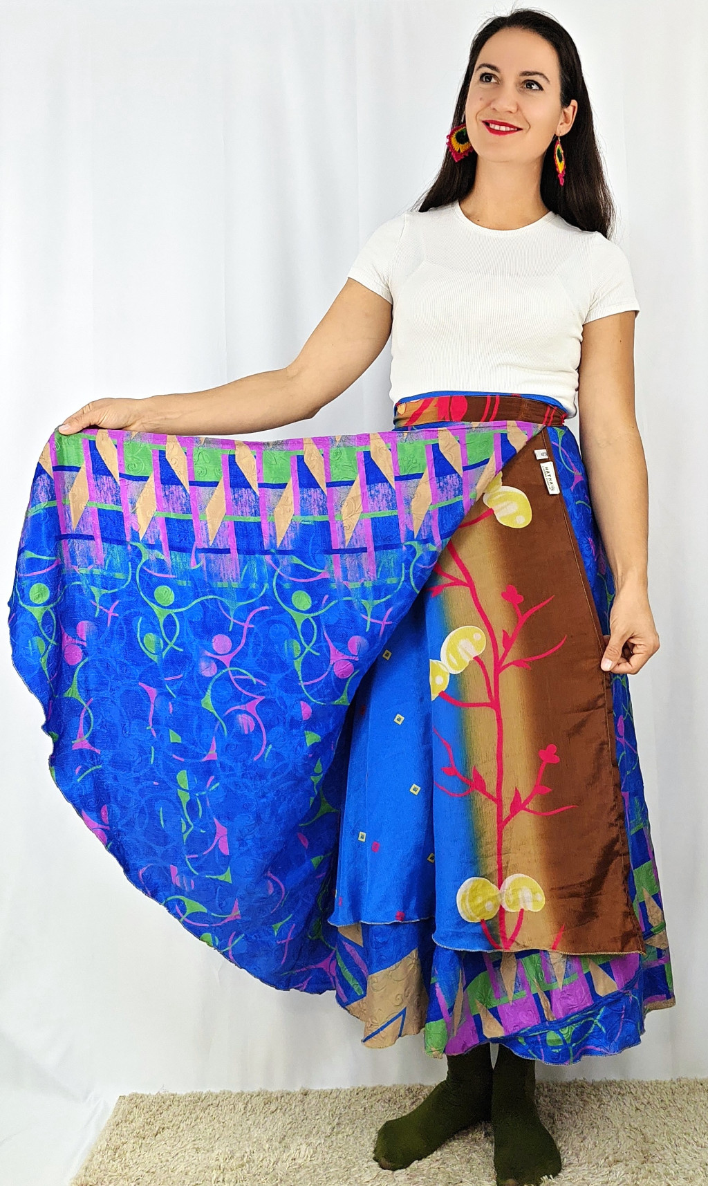 Lapszoknyáink újrahasznosított szárikból készülnek Indiában, egy hosszabb és egy rövidebb anyag derékban összevarrva! Két oldalú, kifordítható, mindkét oldala hordható, sokféleképpen köthető, variálható. Szoknyáinkból nincs két egyforma, mindegyikből csak EGY darab van, ha megtetszik, csapj le rá!