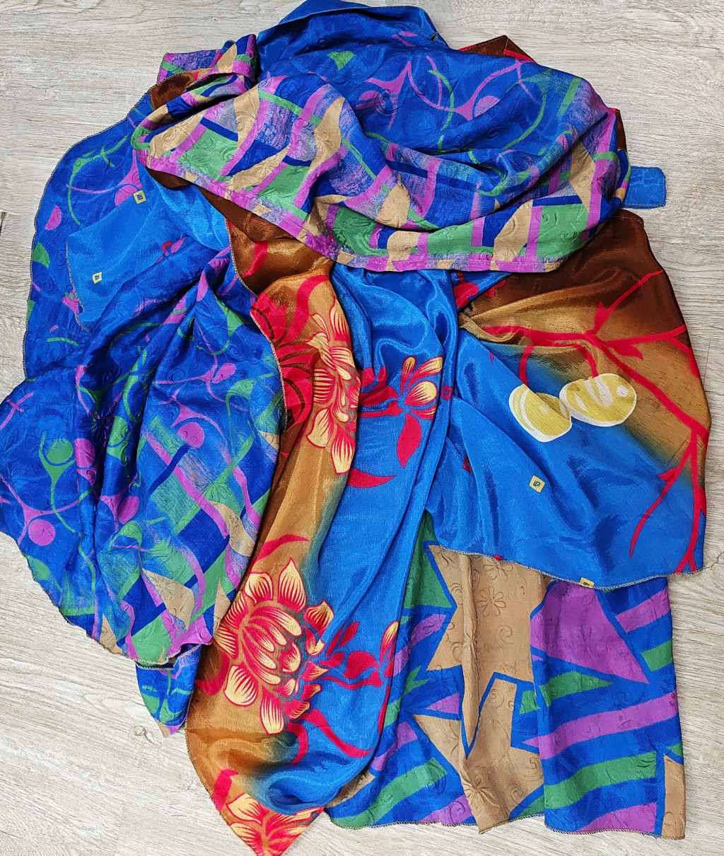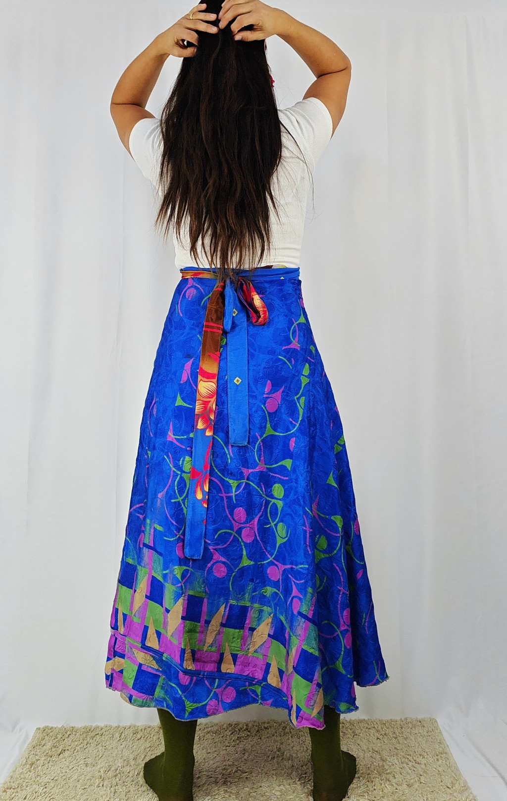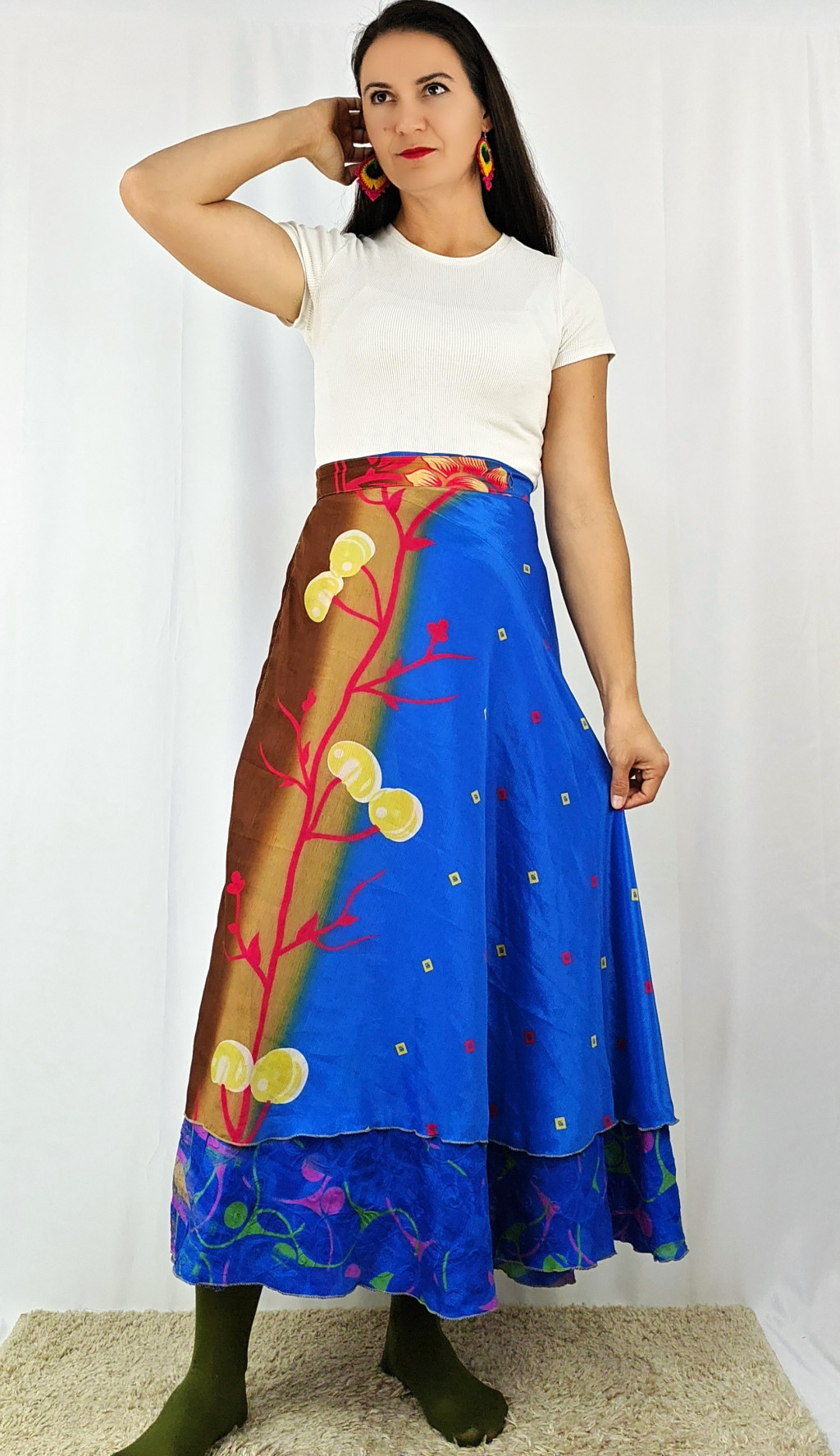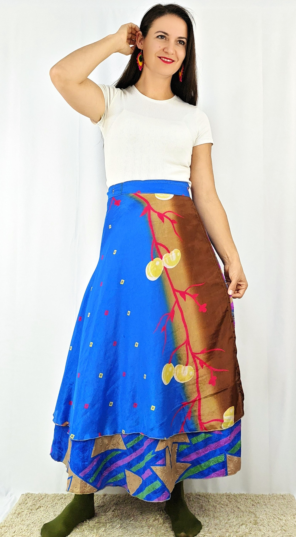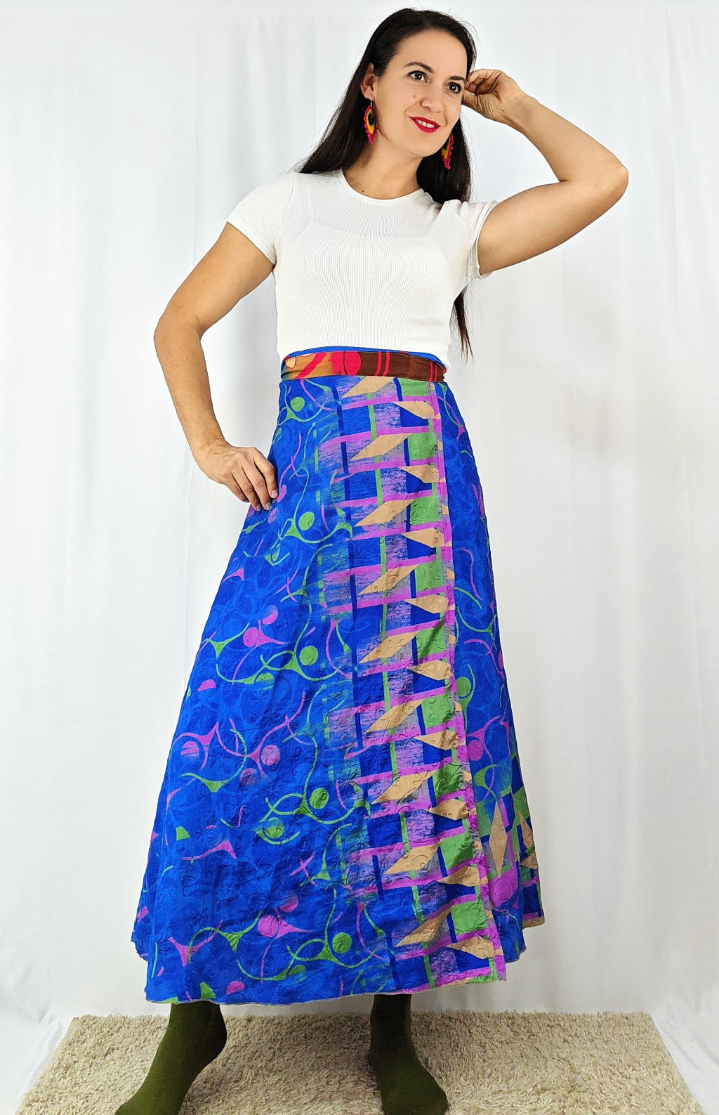 Lapszoknyáink újrahasznosított szárikból készülnek Indiában, egy hosszabb és egy rövidebb anyag derékban összevarrva! Két oldalú, kifordítható, mindkét oldala hordható, sokféleképpen köthető, variálható. Szoknyáinkból nincs két egyforma, mindegyikből csak EGY darab van, ha megtetszik, csapj le rá!