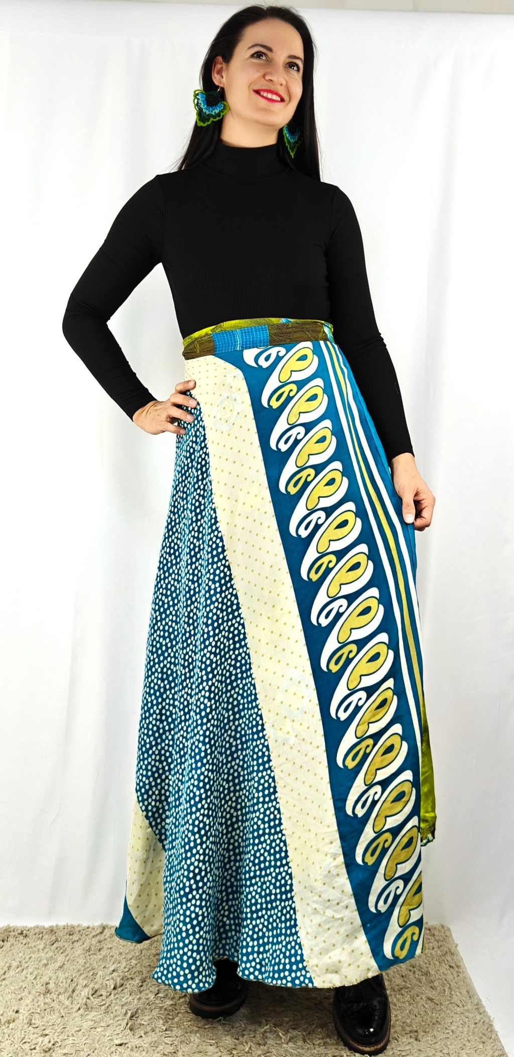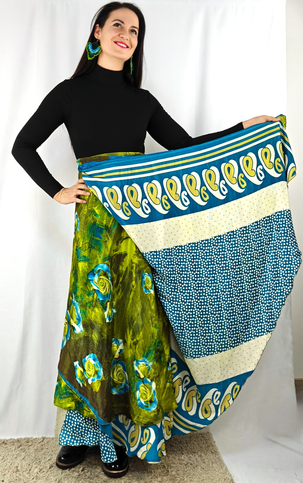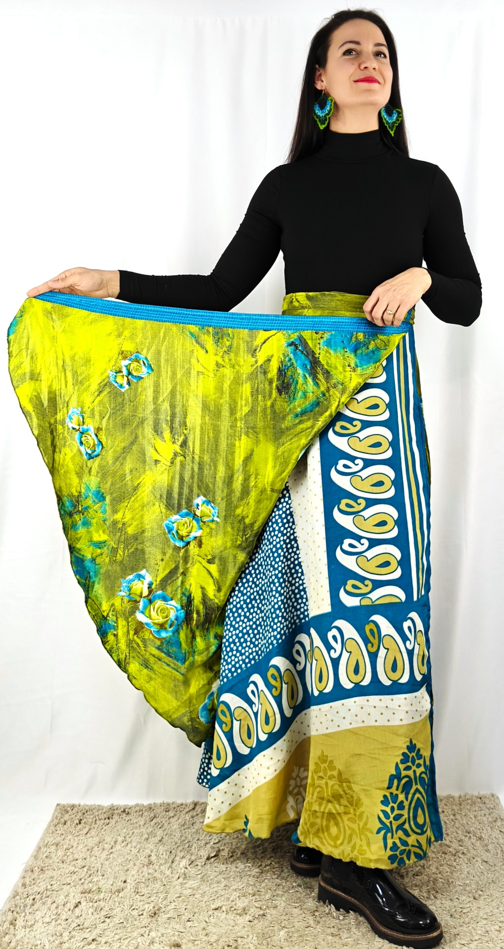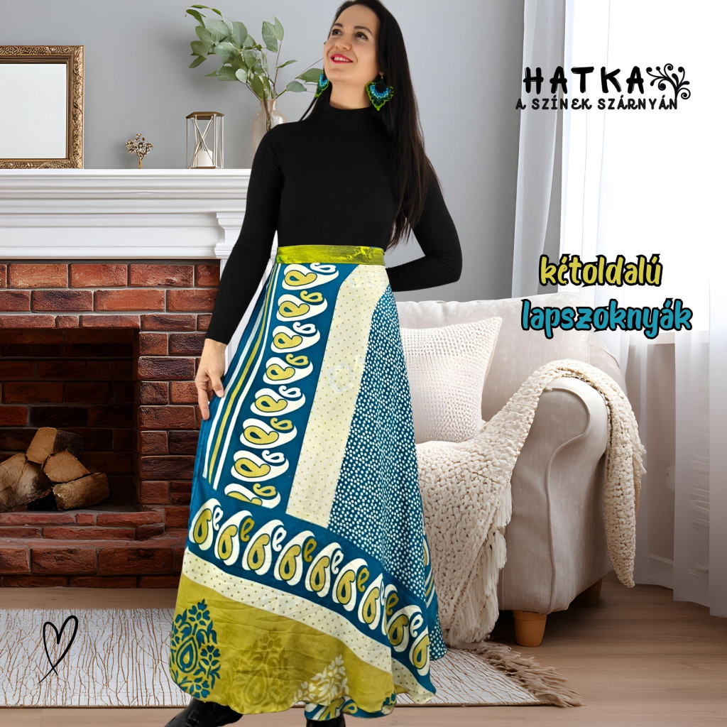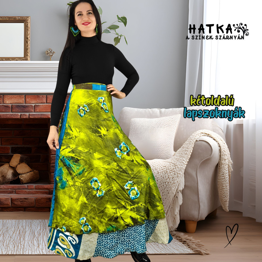 Lapszoknyáink újrahasznosított szárikból készülnek Indiában, egy hosszabb és egy rövidebb anyag derékban összevarrva! Két oldalú, kifordítható, mindkét oldala hordható, sokféleképpen köthető, variálható. Szoknyáinkból nincs két egyforma, mindegyikből csak EGY darab van, ha megtetszik, csapj le rá!
