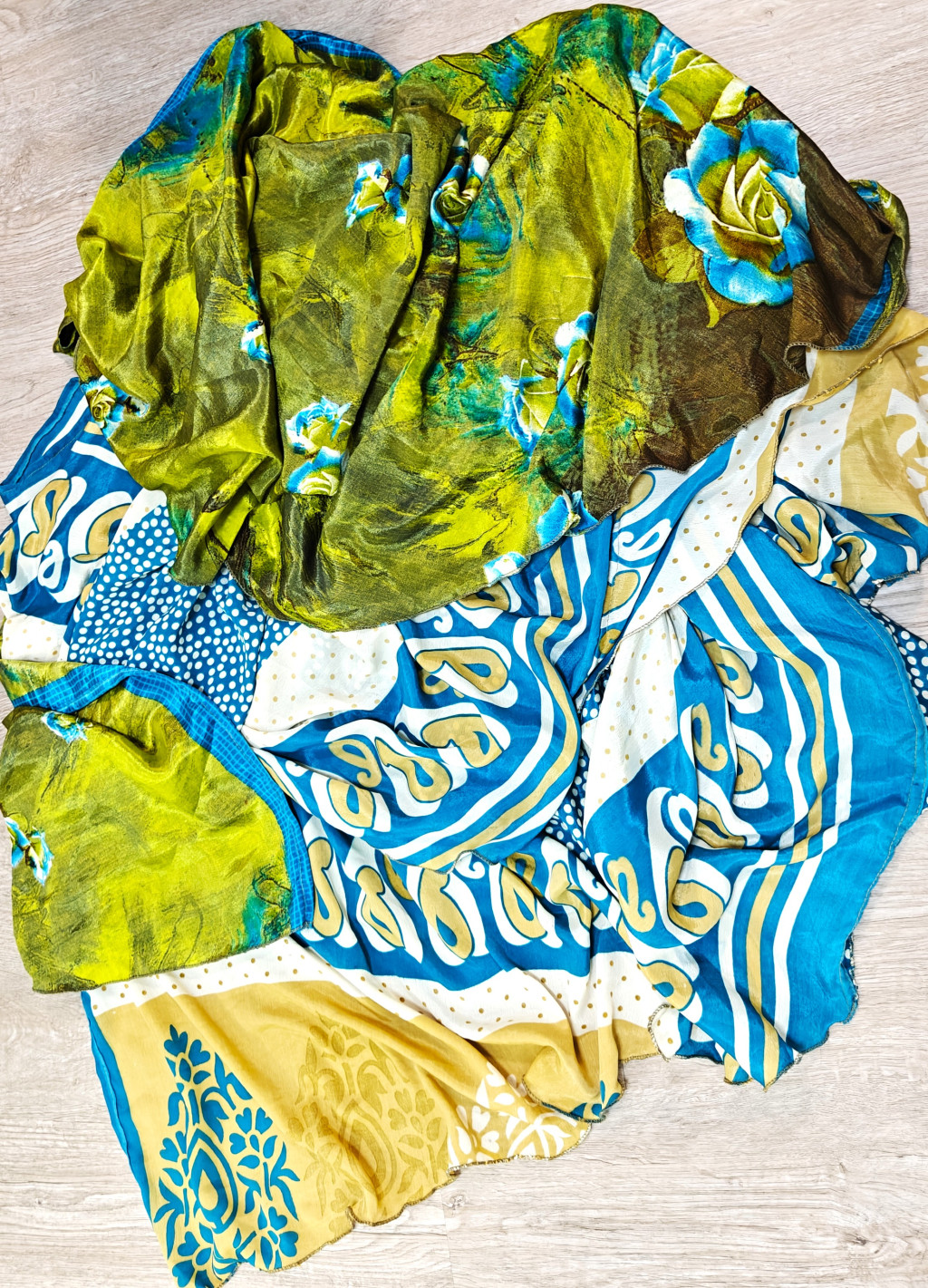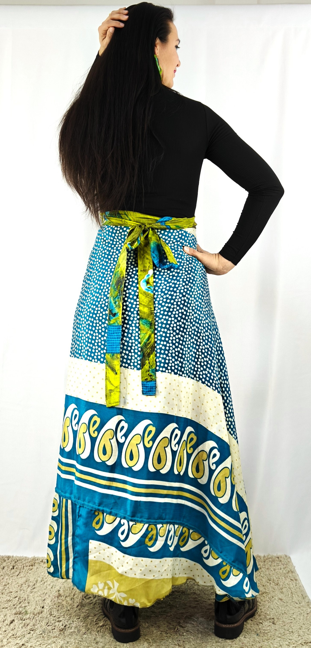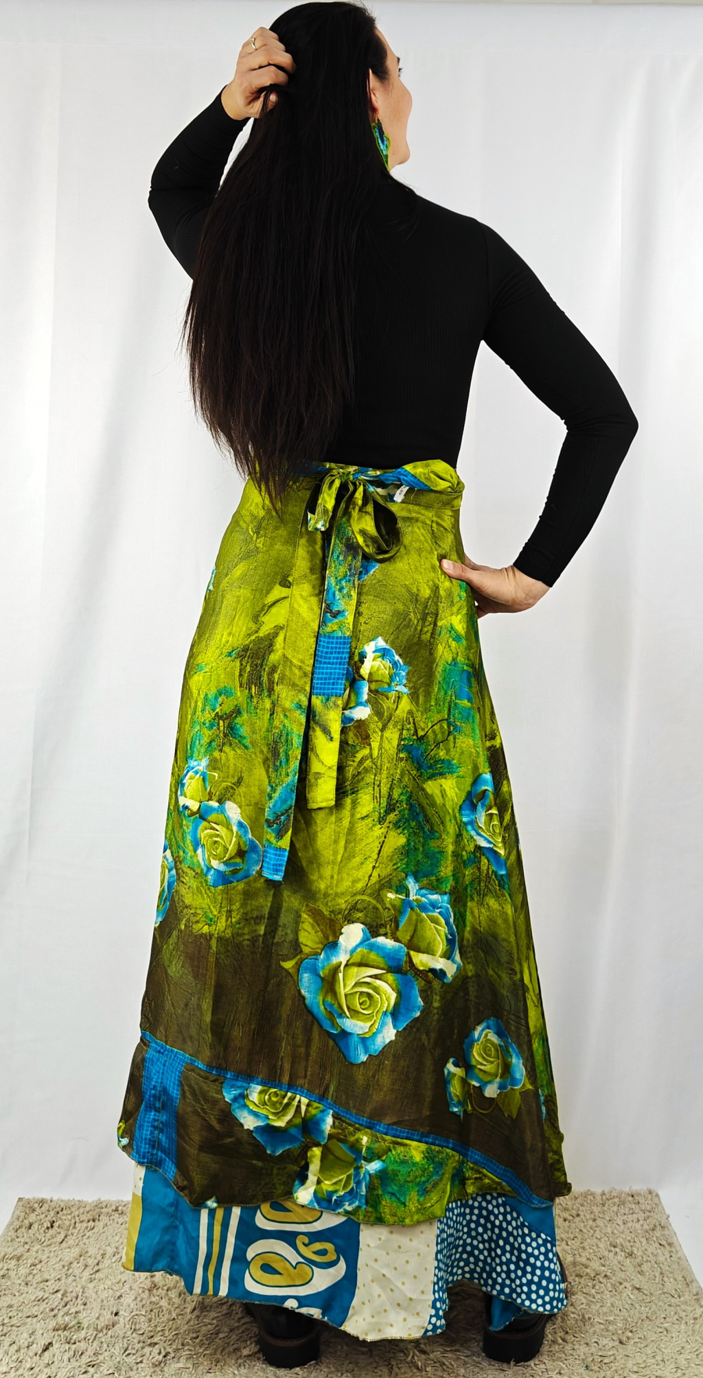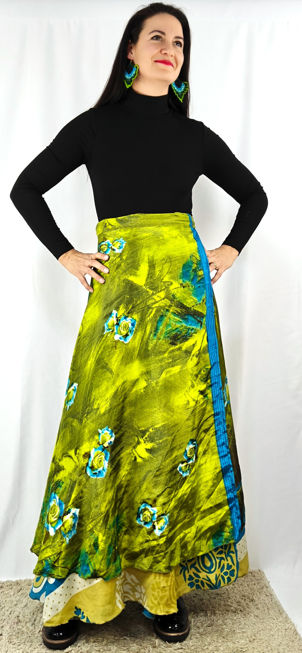 Lapszoknyáink újrahasznosított szárikból készülnek Indiában, egy hosszabb és egy rövidebb anyag derékban összevarrva! Két oldalú, kifordítható, mindkét oldala hordható, sokféleképpen köthető, variálható. Szoknyáinkból nincs két egyforma, mindegyikből csak EGY darab van, ha megtetszik, csapj le rá!
