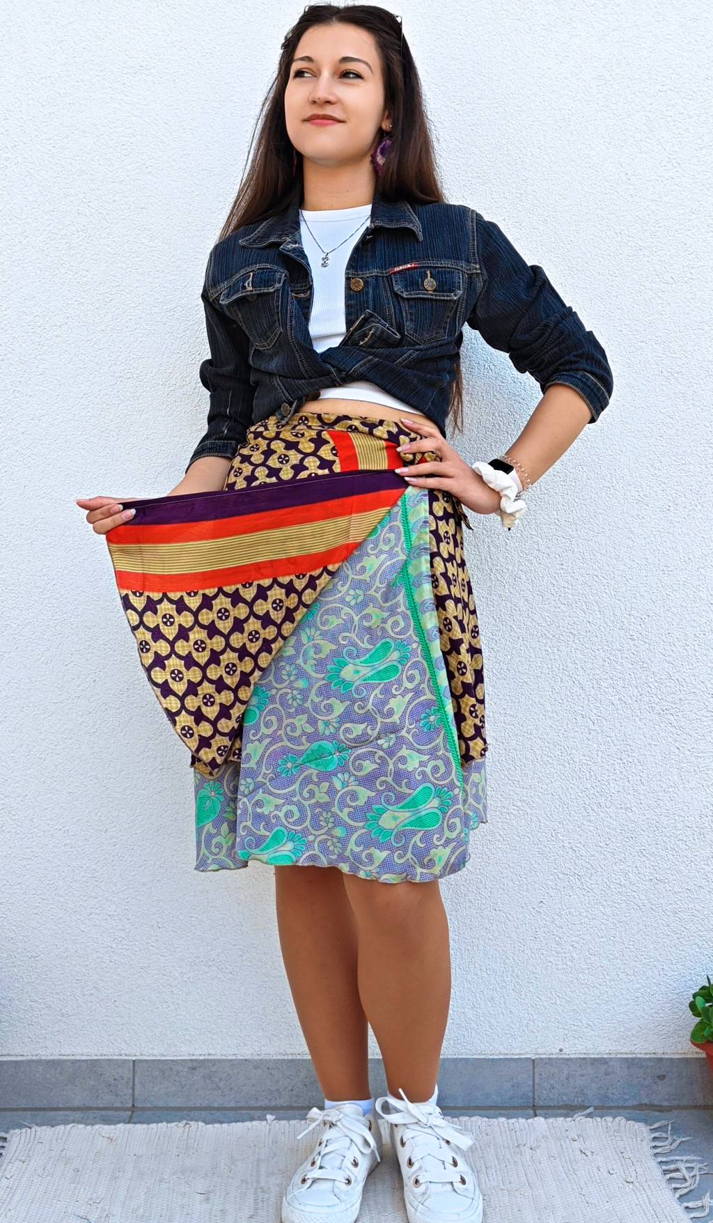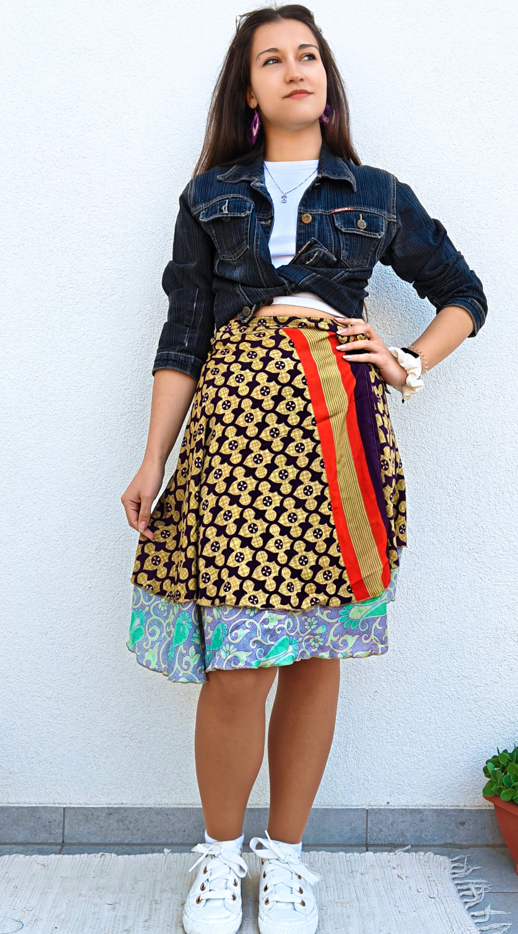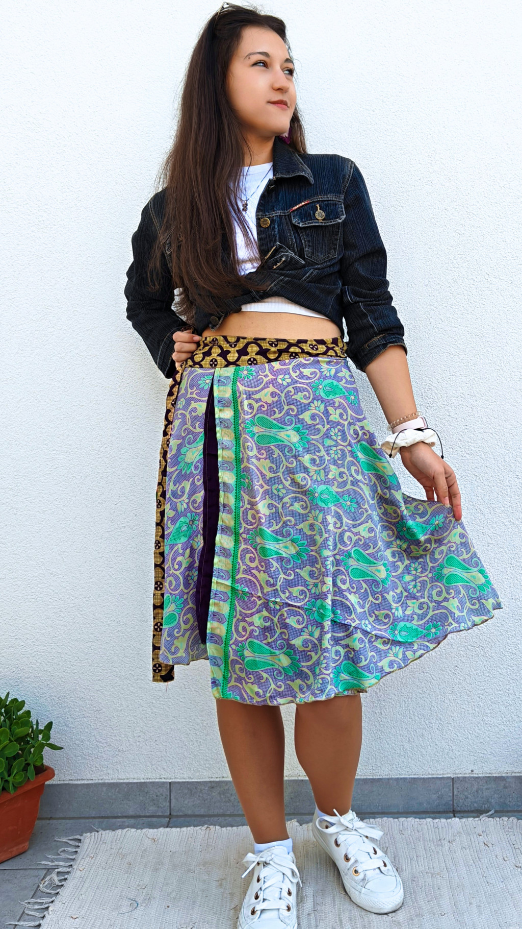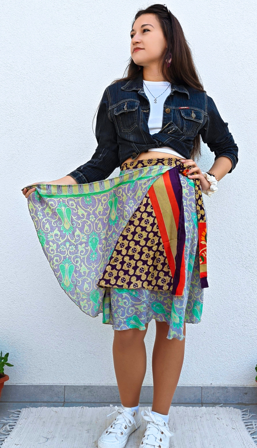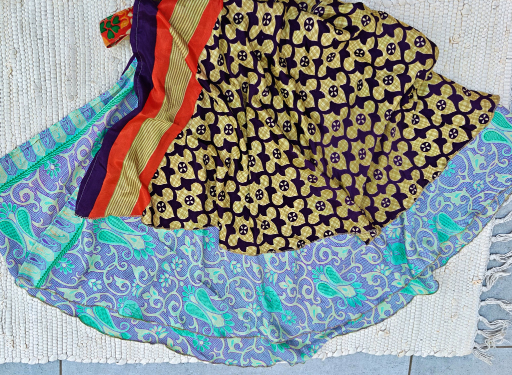 Lapszoknyáink újrahasznosított szárikból készülnek Indiában, egy hosszabb és egy rövidebb anyag derékban összevarrva! Két oldalú, kifordítható, mindkét oldala hordható, sokféleképpen köthető, variálható. Szoknyáinkból nincs két egyforma, mindegyikből csak EGY darab van, ha megtetszik, csapj le rá!