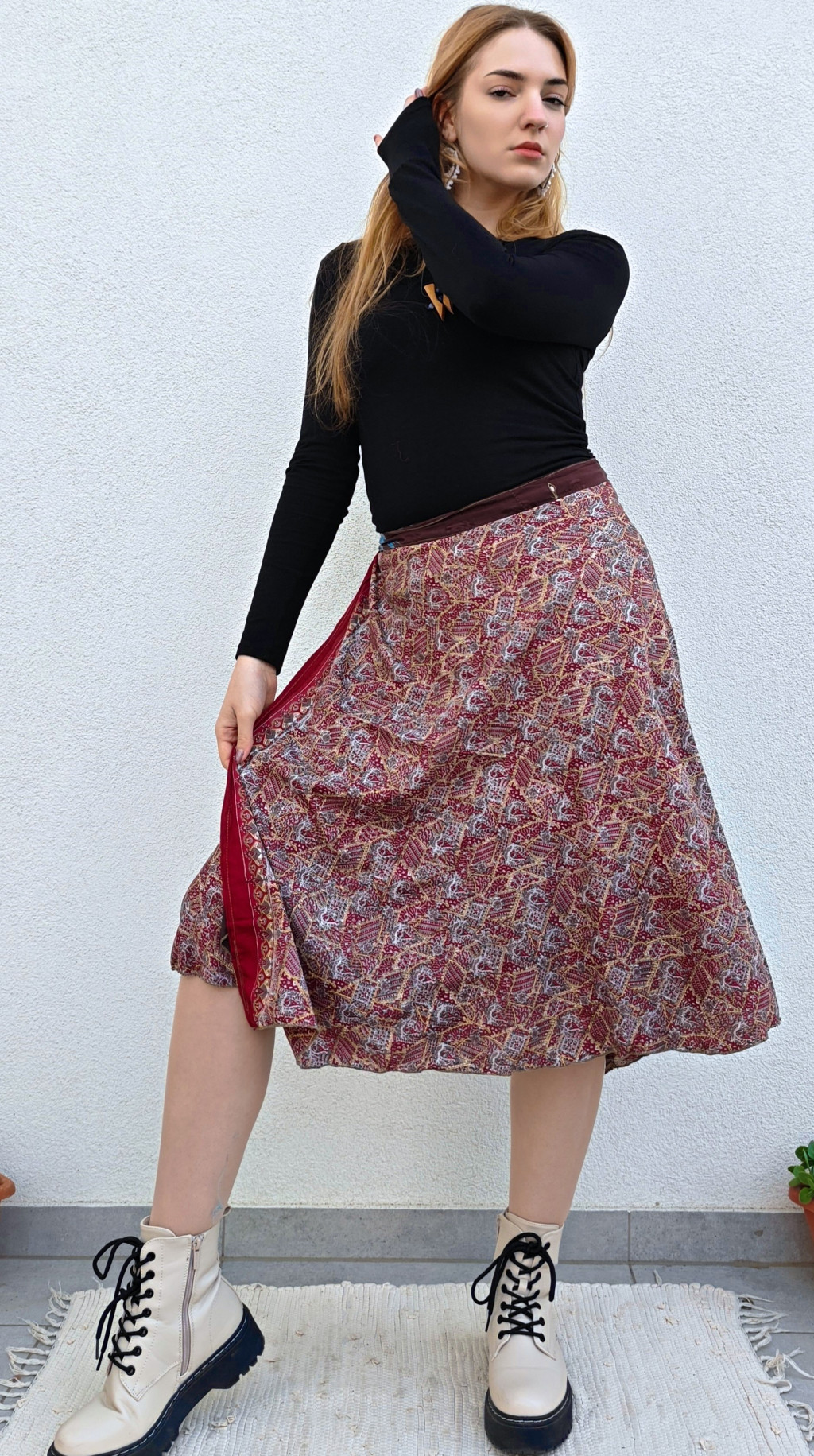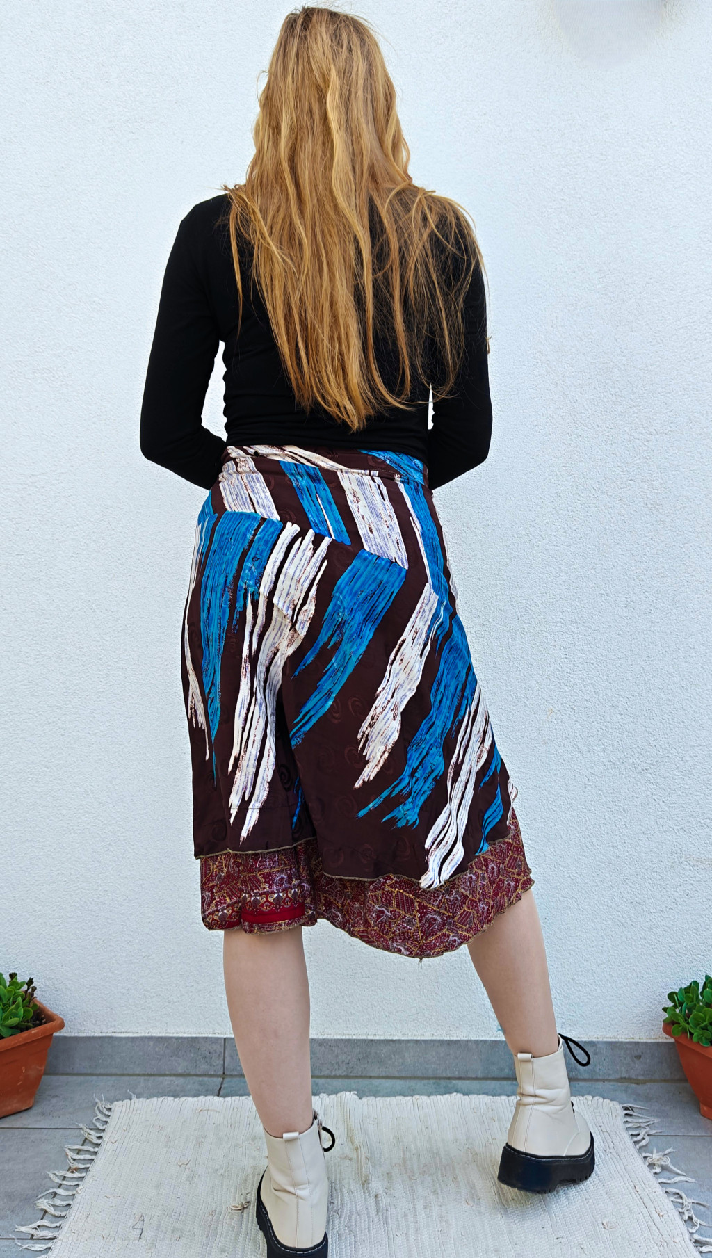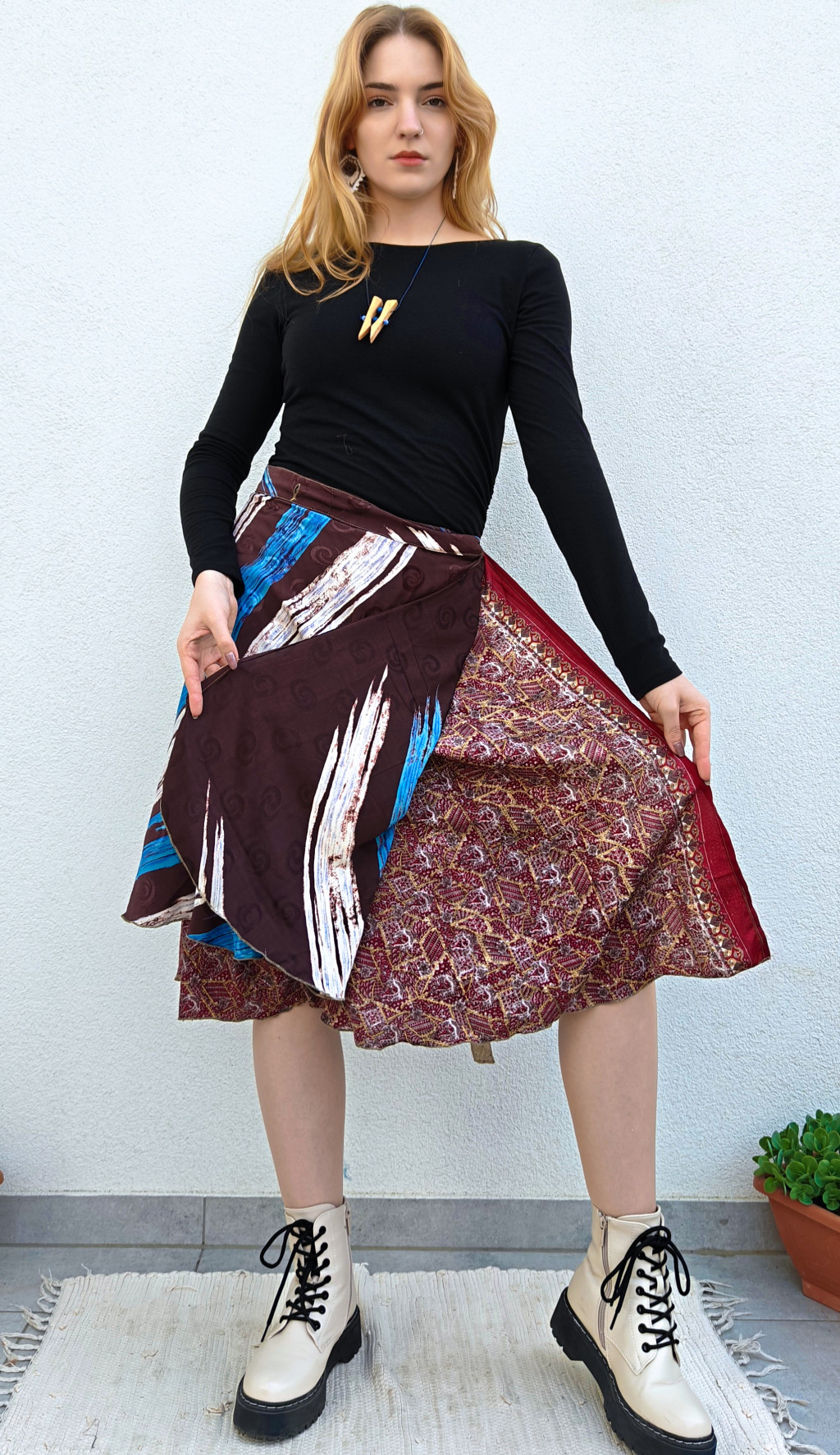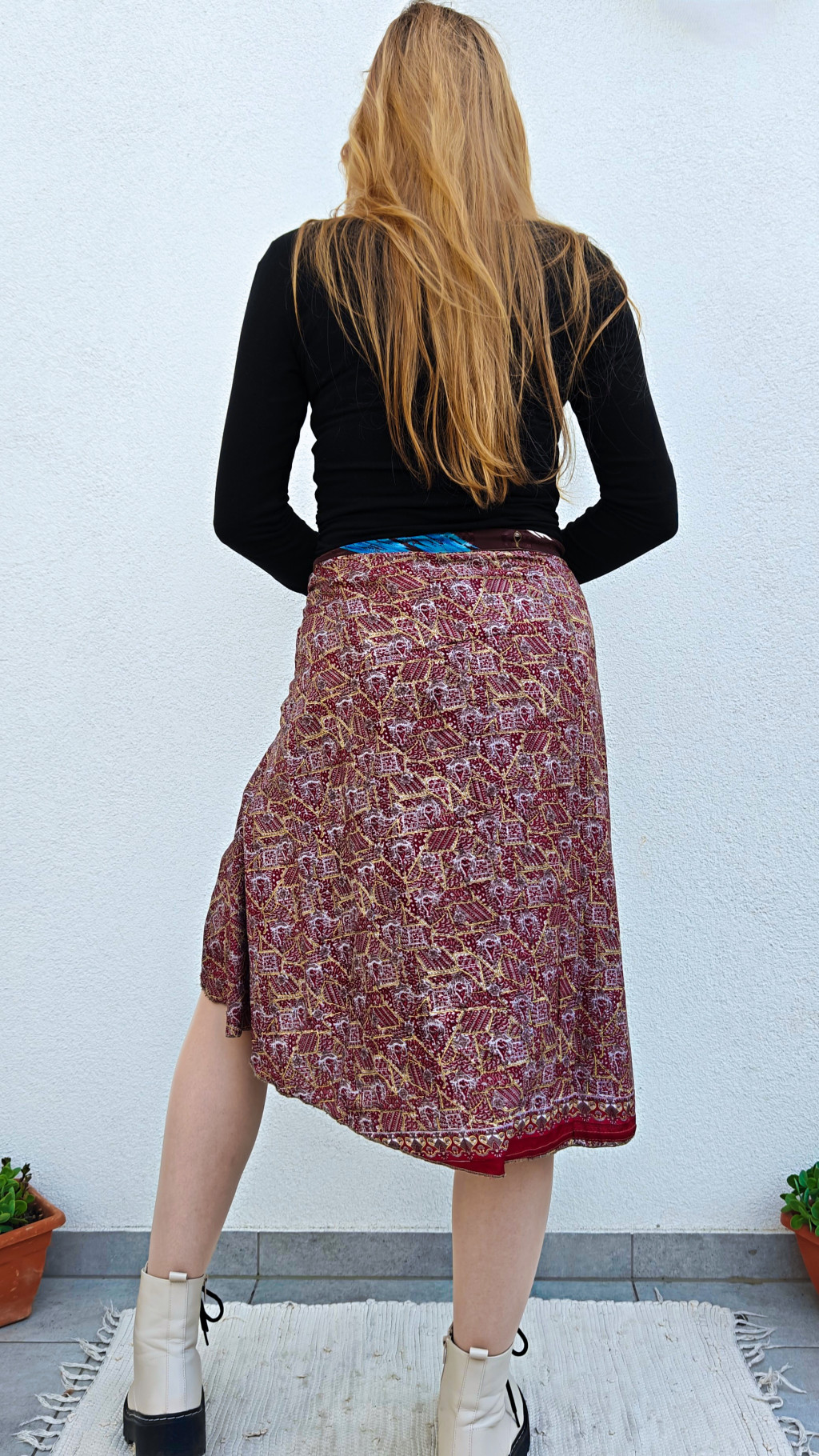 Lapszoknyáink újrahasznosított szárikból készülnek Indiában, egy hosszabb és egy rövidebb anyag derékban összevarrva! Két oldalú, kifordítható, mindkét oldala hordható, sokféleképpen köthető, variálható. Szoknyáinkból nincs két egyforma, mindegyikből csak EGY darab van, ha megtetszik, csapj le rá!
