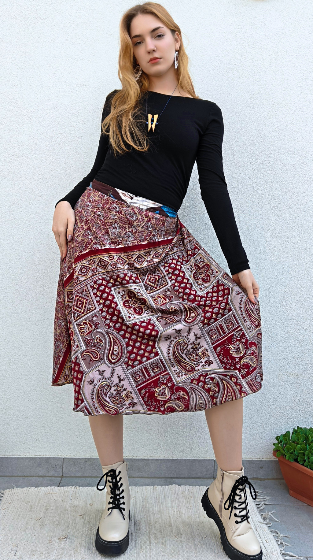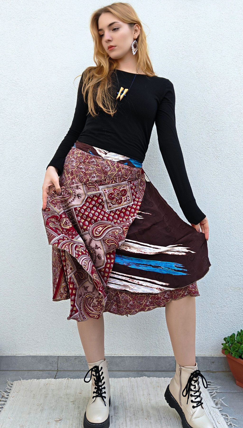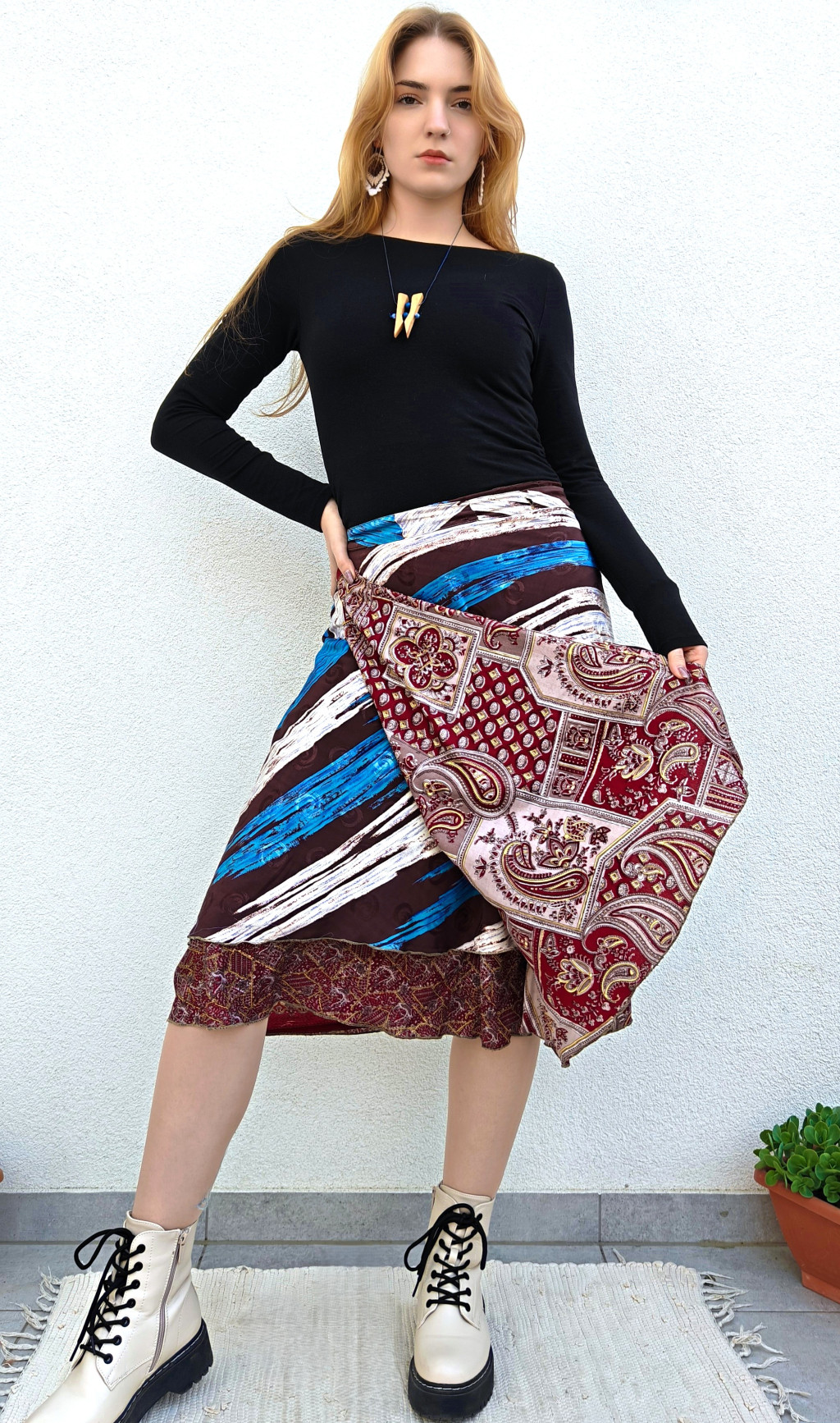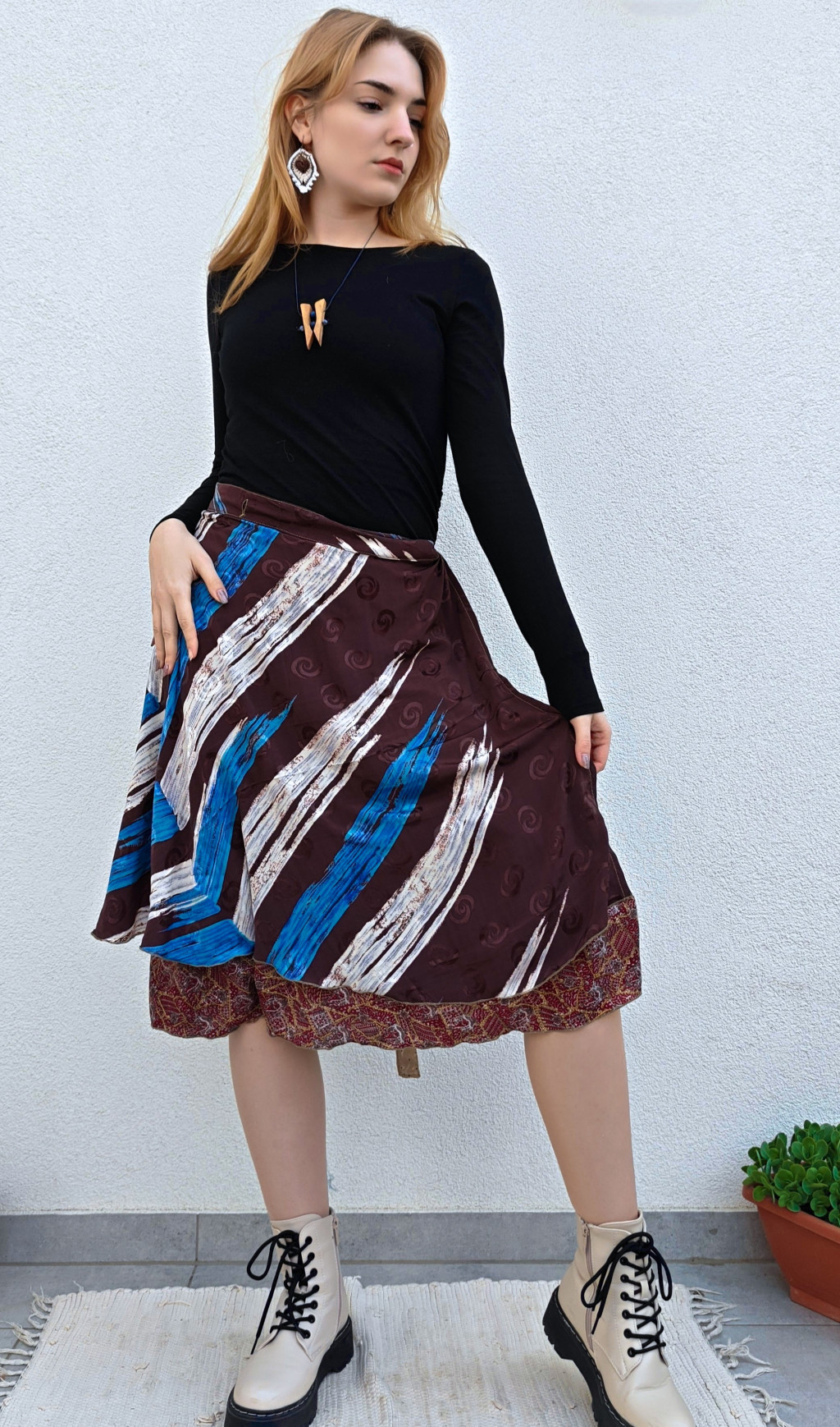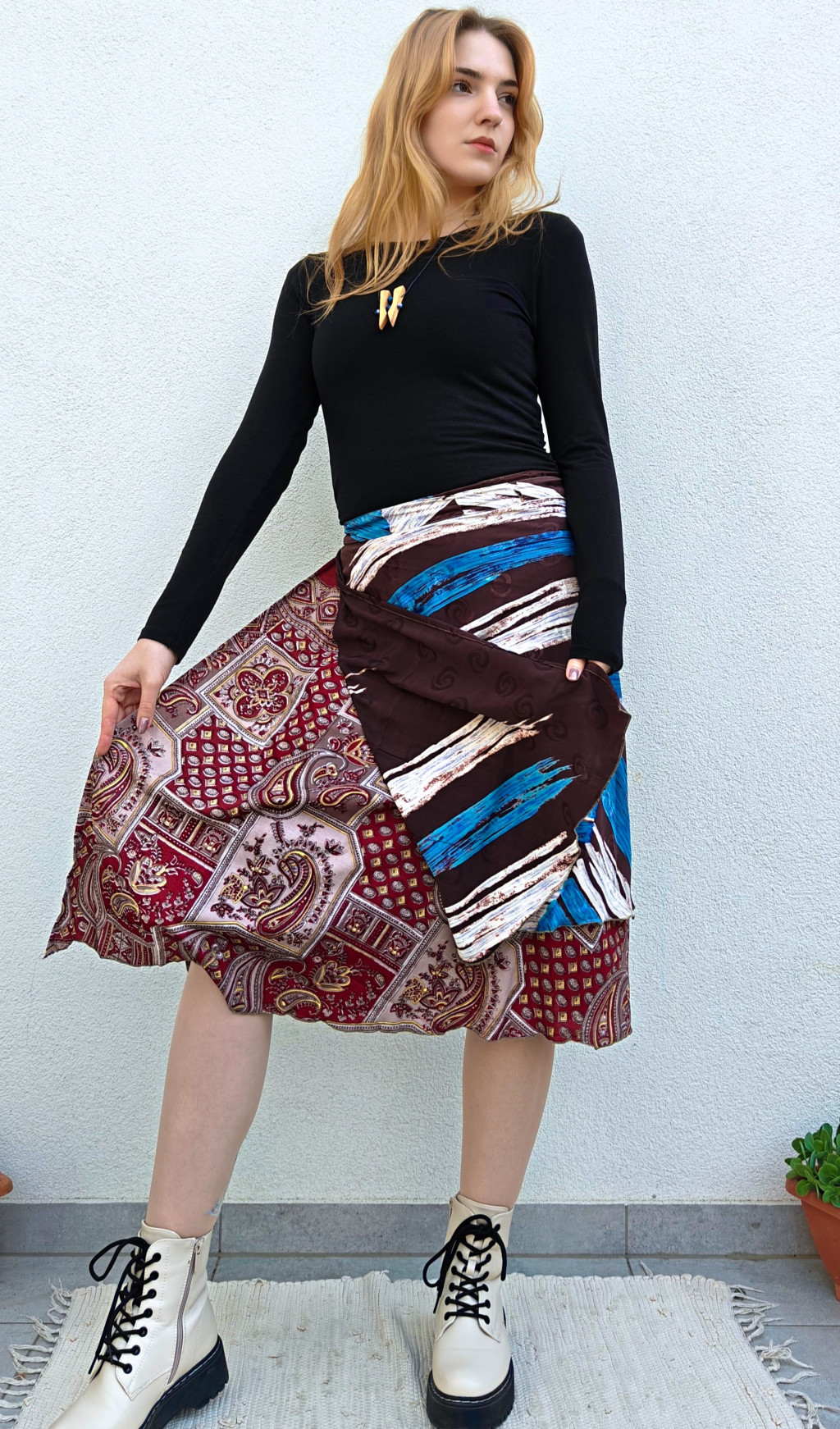 Lapszoknyáink újrahasznosított szárikból készülnek Indiában, egy hosszabb és egy rövidebb anyag derékban összevarrva! Két oldalú, kifordítható, mindkét oldala hordható, sokféleképpen köthető, variálható. Szoknyáinkból nincs két egyforma, mindegyikből csak EGY darab van, ha megtetszik, csapj le rá!