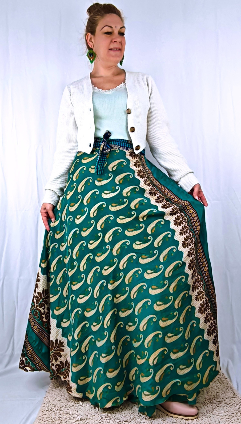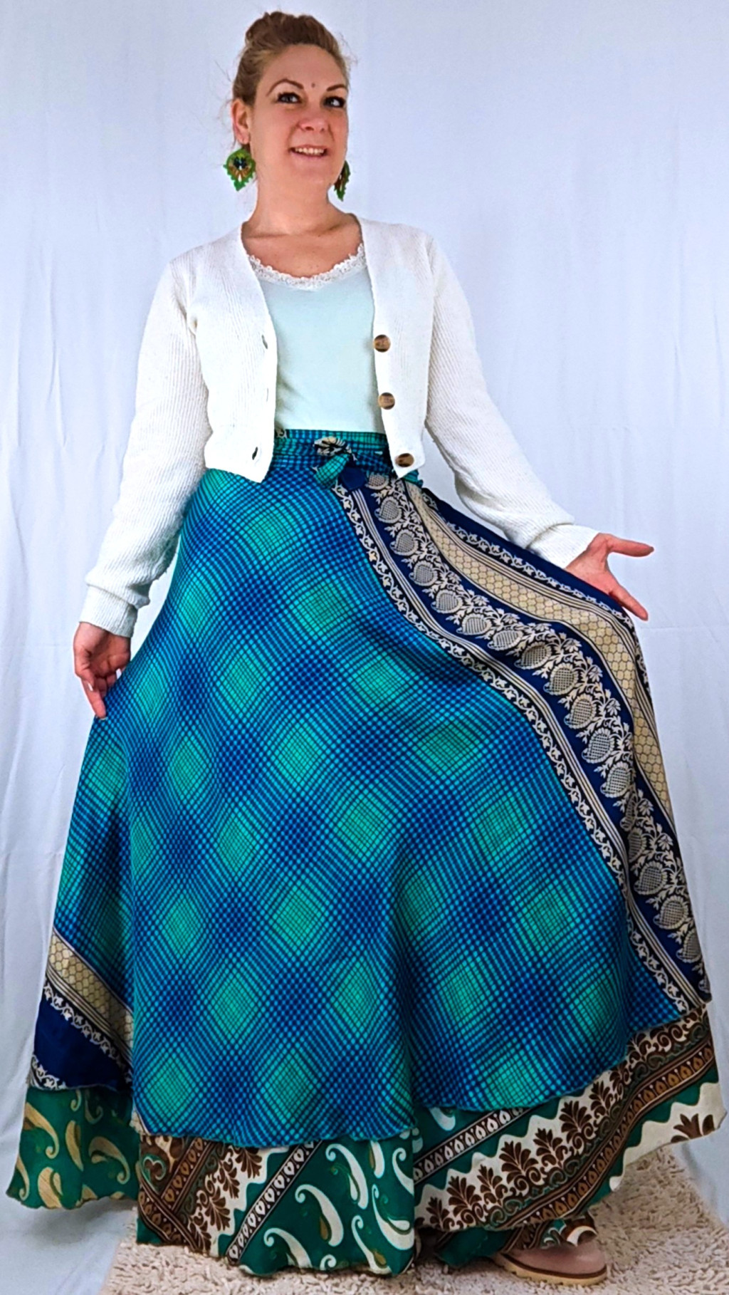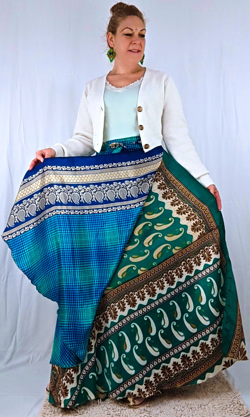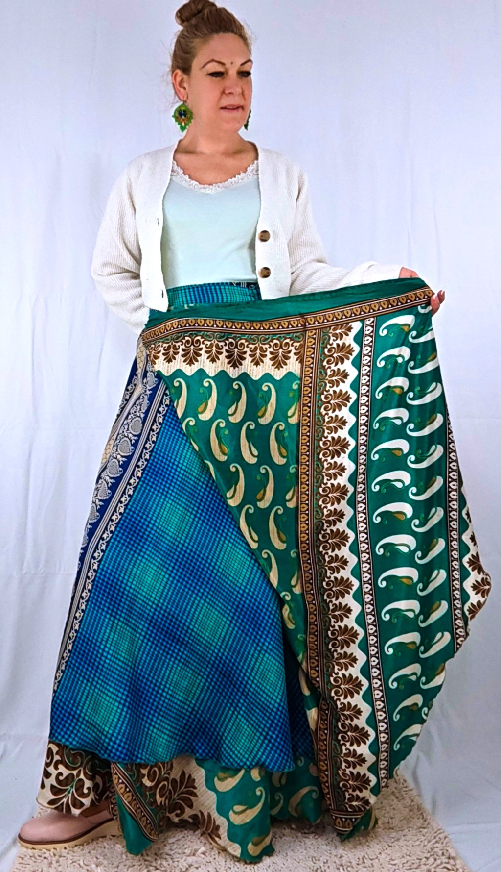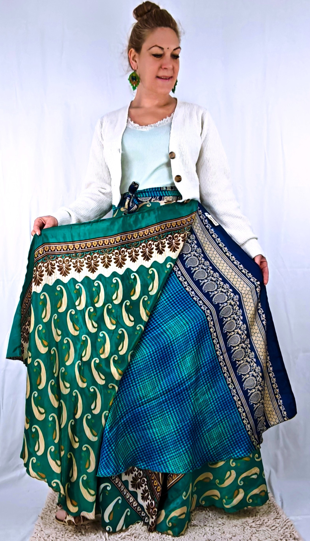 Lapszoknyáink újrahasznosított szárikból készülnek Indiában, egy hosszabb és egy rövidebb anyag derékban összevarrva! Két oldalú, kifordítható, mindkét oldala hordható, sokféleképpen köthető, variálható. Szoknyáinkból nincs két egyforma, mindegyikből csak EGY darab van, ha megtetszik, csapj le rá!