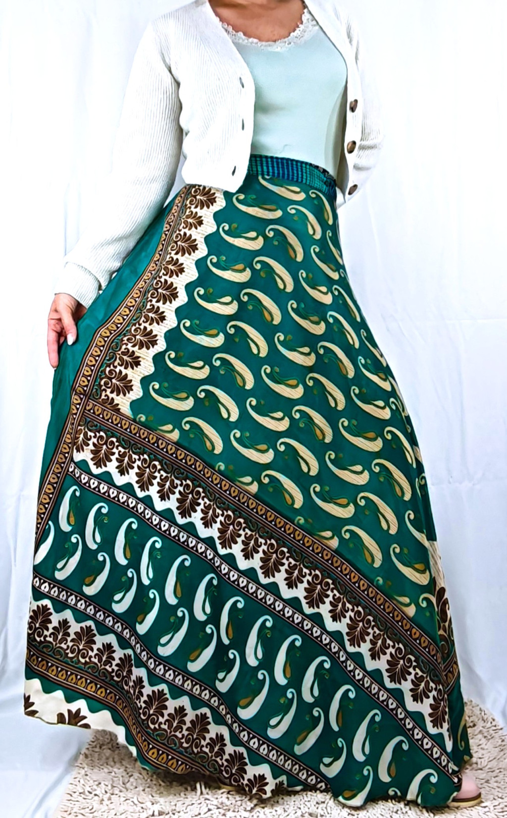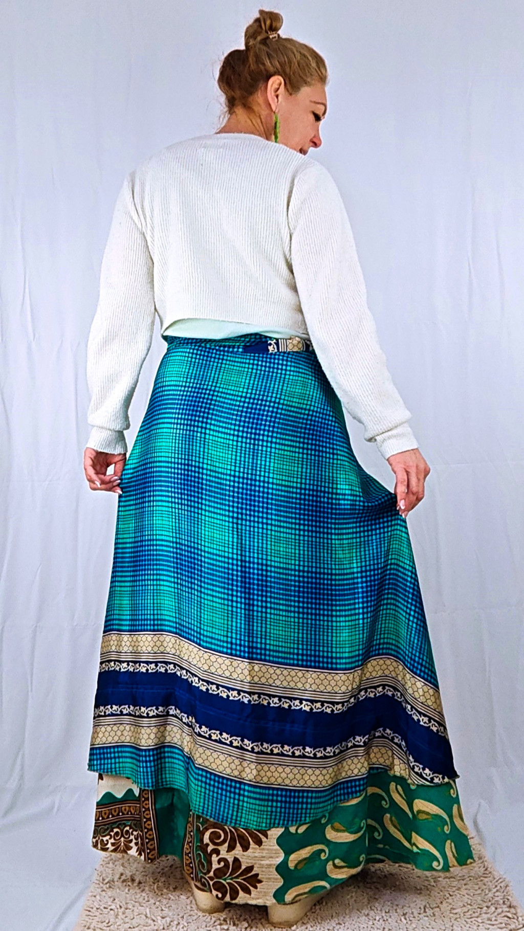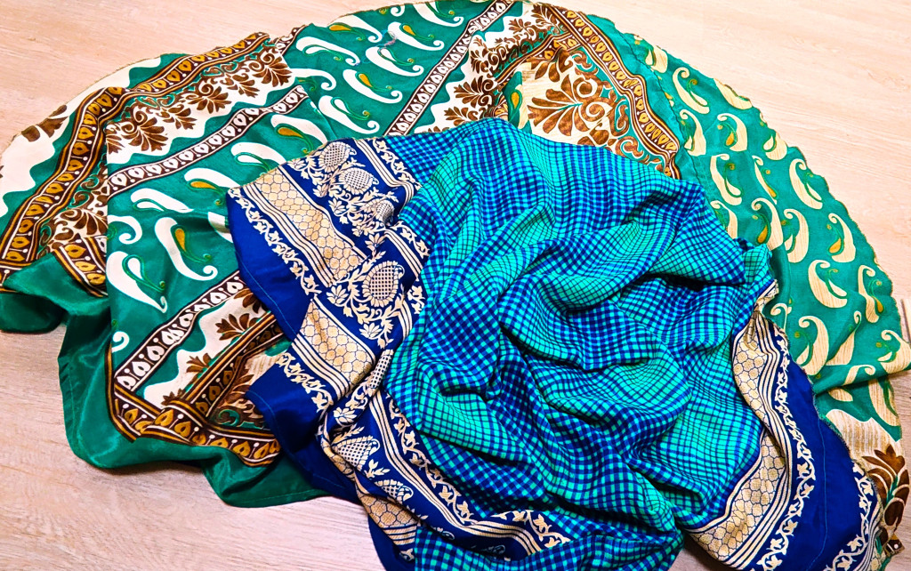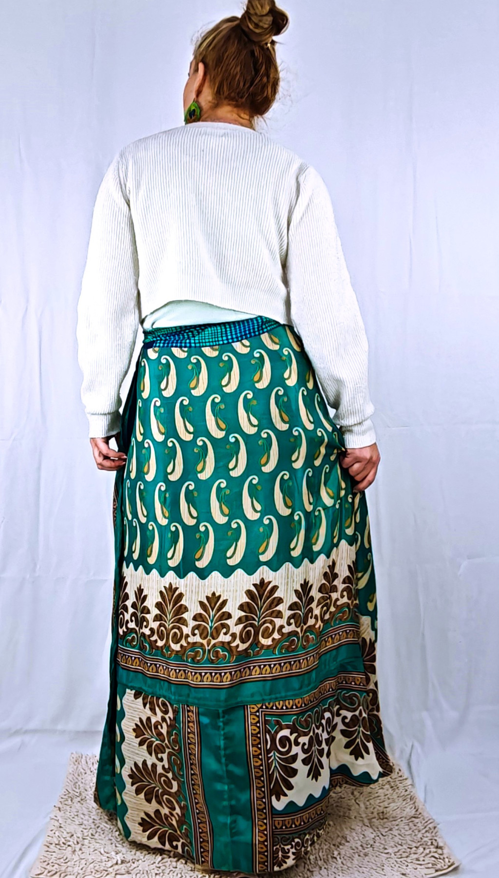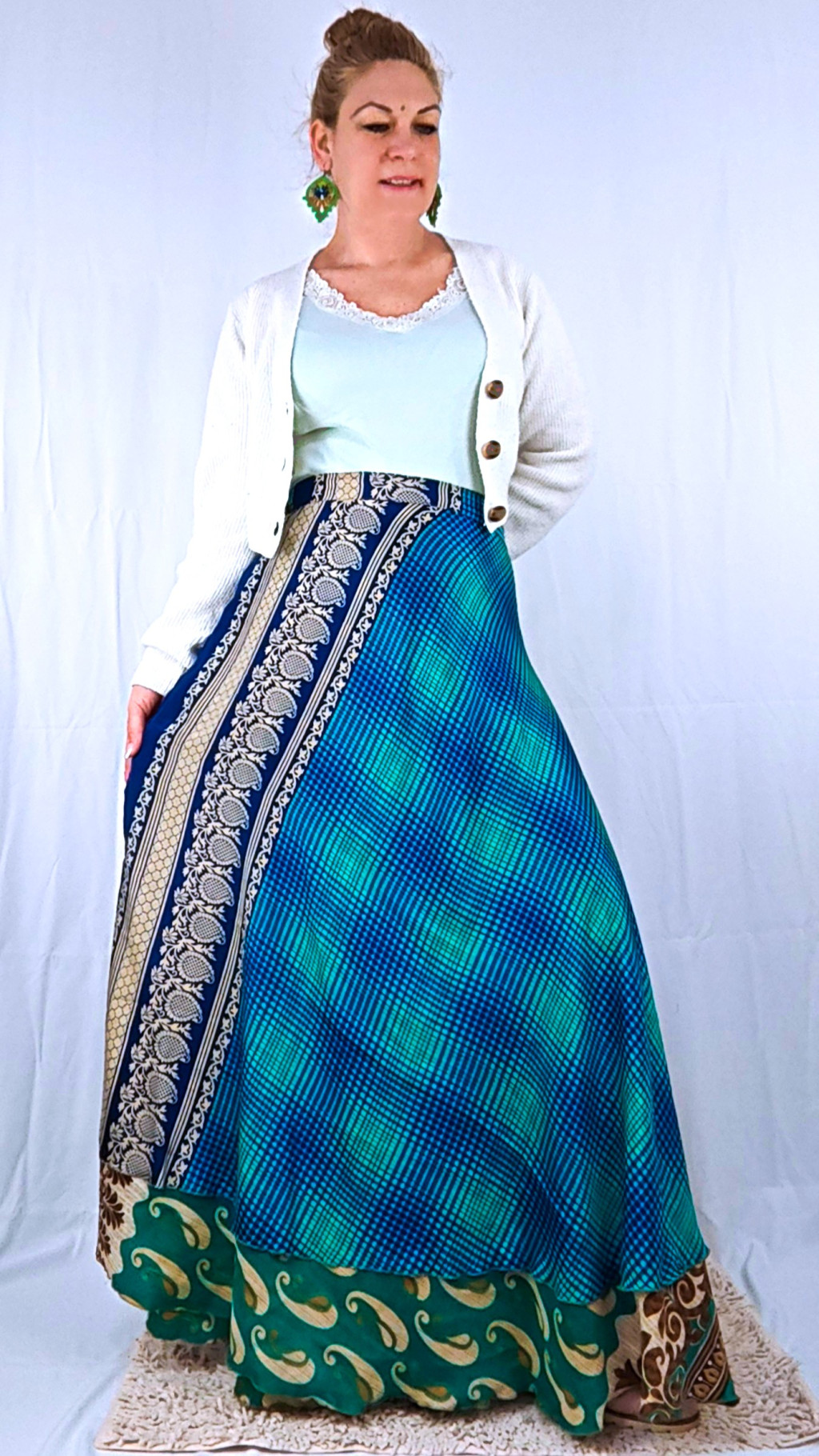 Lapszoknyáink újrahasznosított szárikból készülnek Indiában, egy hosszabb és egy rövidebb anyag derékban összevarrva! Két oldalú, kifordítható, mindkét oldala hordható, sokféleképpen köthető, variálható. Szoknyáinkból nincs két egyforma, mindegyikből csak EGY darab van, ha megtetszik, csapj le rá!