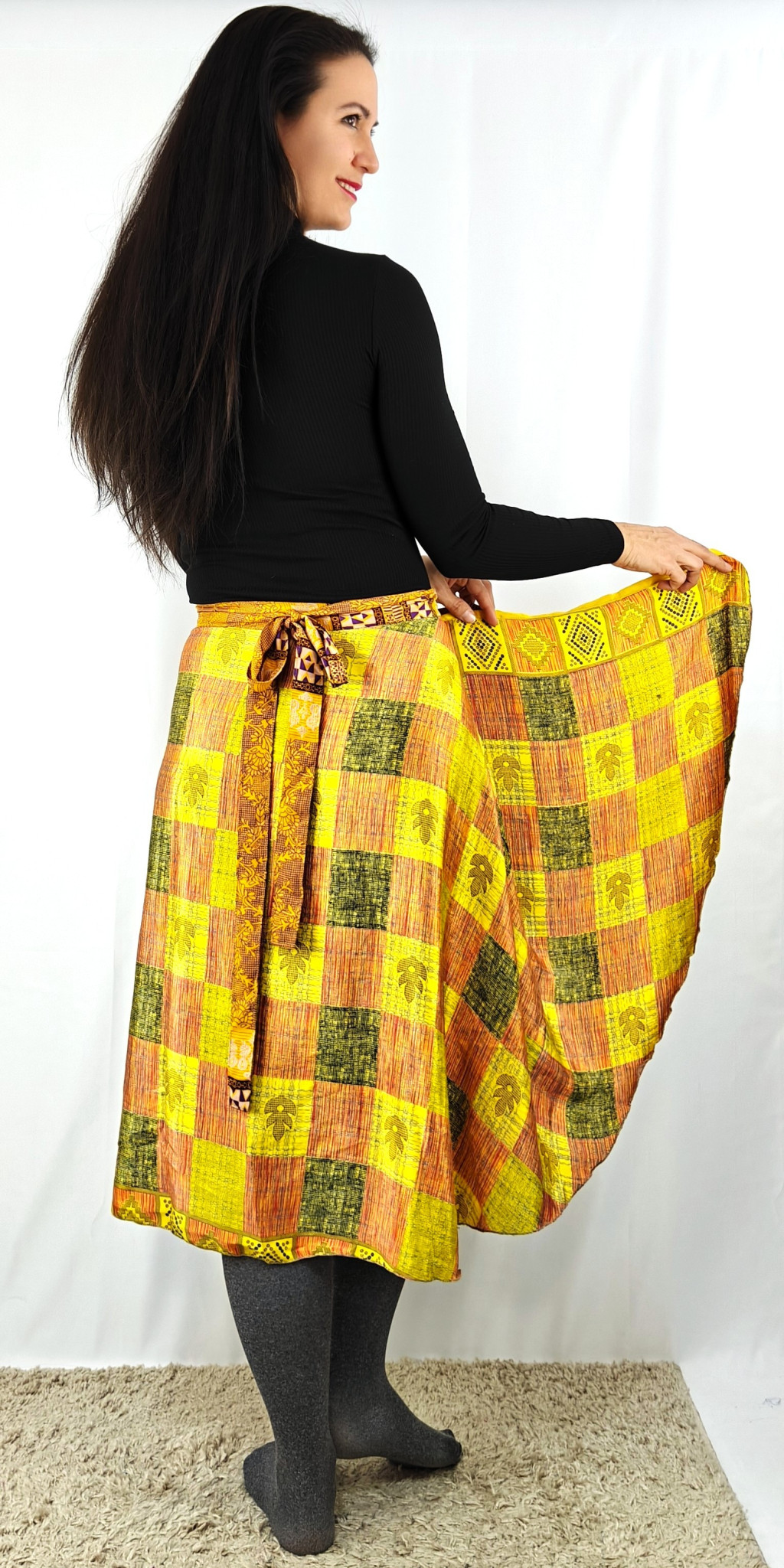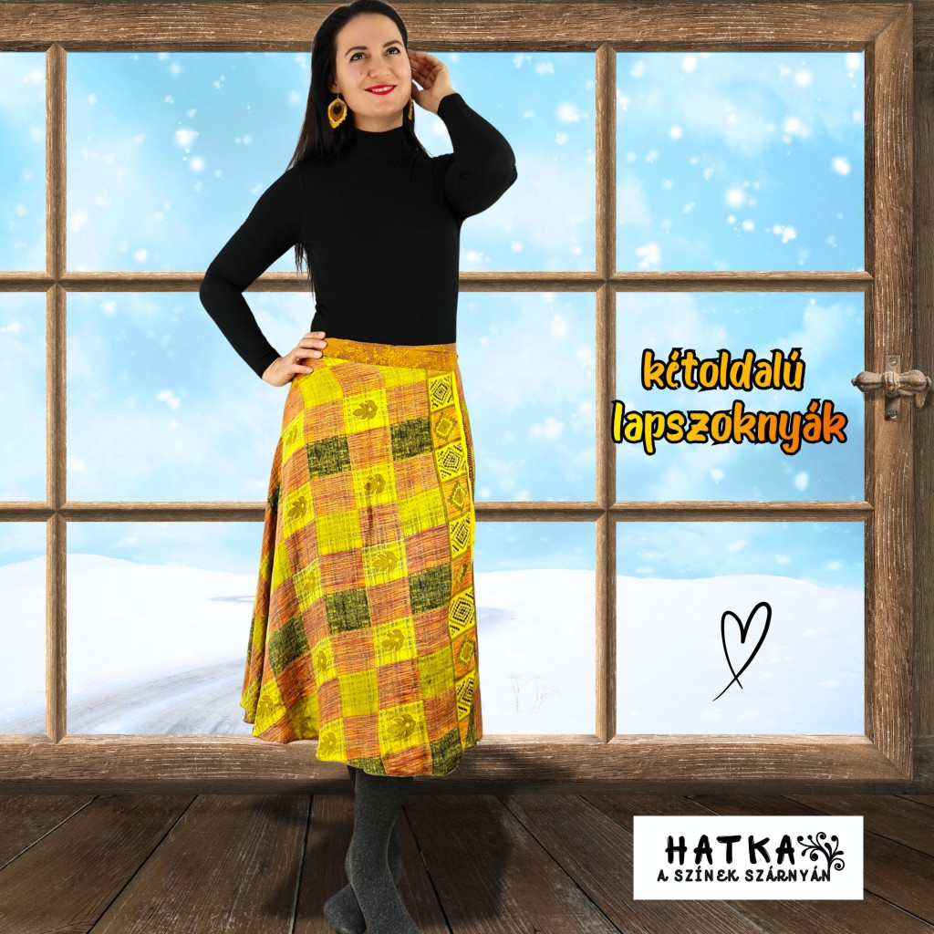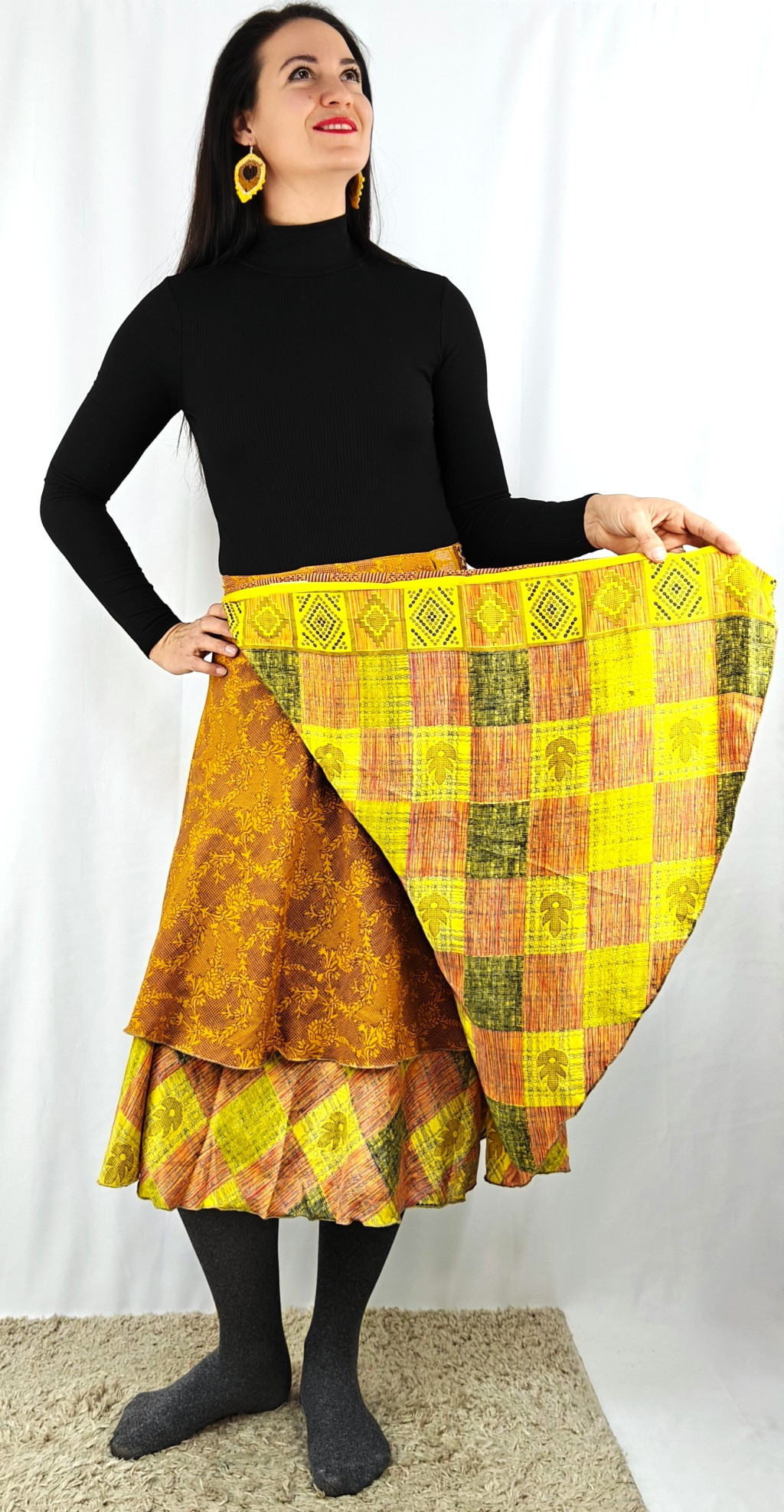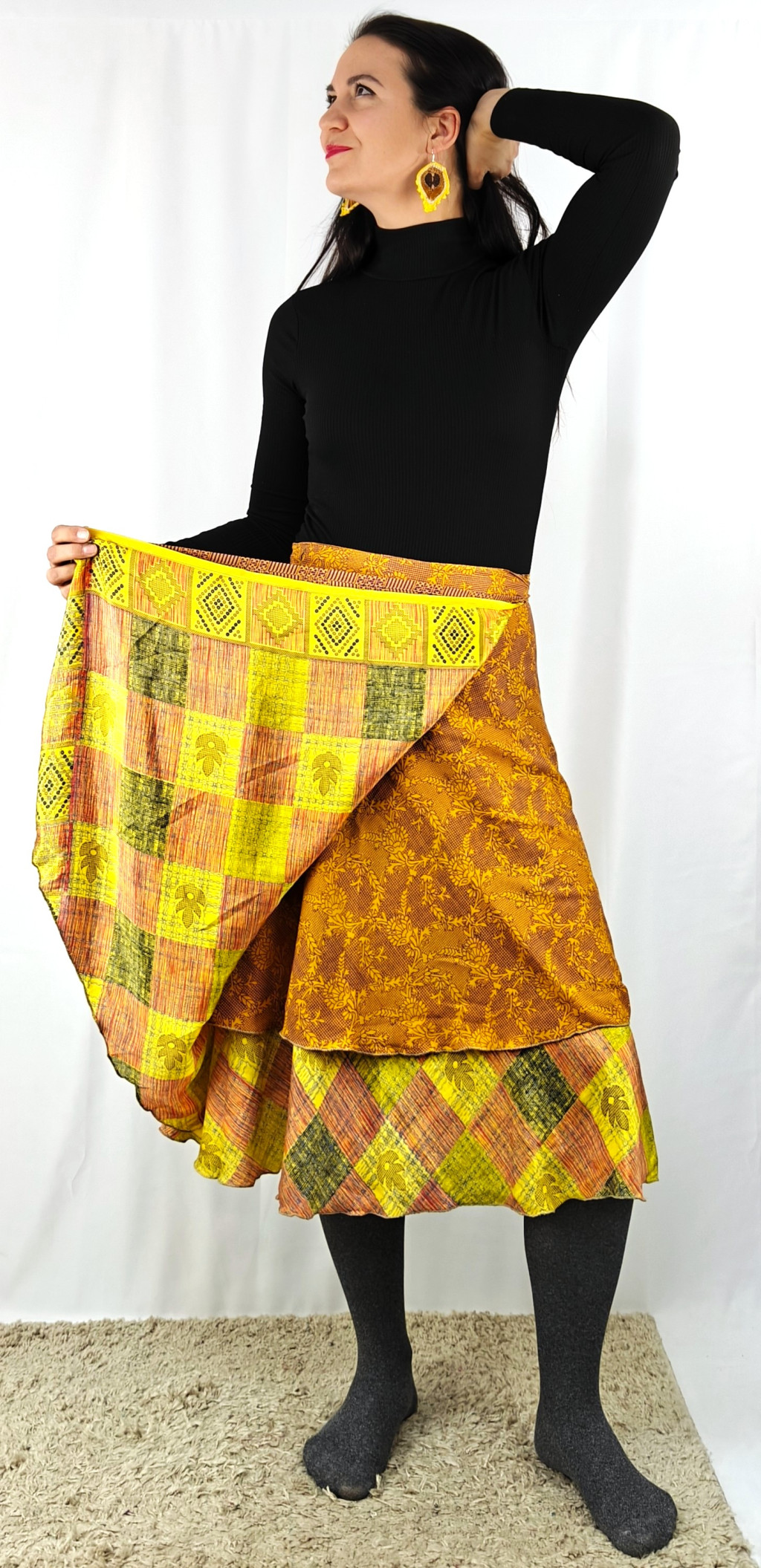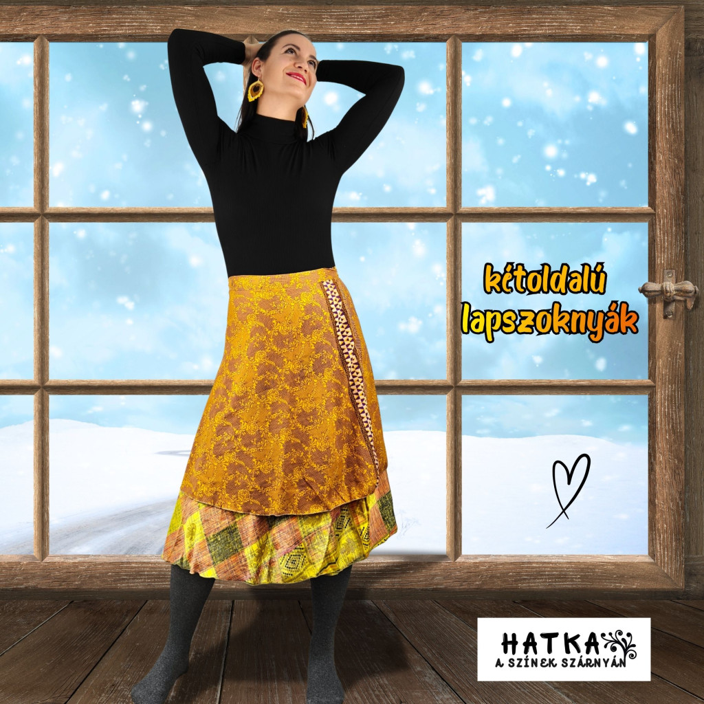 Lapszoknyáink újrahasznosított szárikból készülnek Indiában, egy hosszabb és egy rövidebb anyag derékban összevarrva! Két oldalú, kifordítható, mindkét oldala hordható, sokféleképpen köthető, variálható. Szoknyáinkból nincs két egyforma, mindegyikből csak EGY darab van, ha megtetszik, csapj le rá!