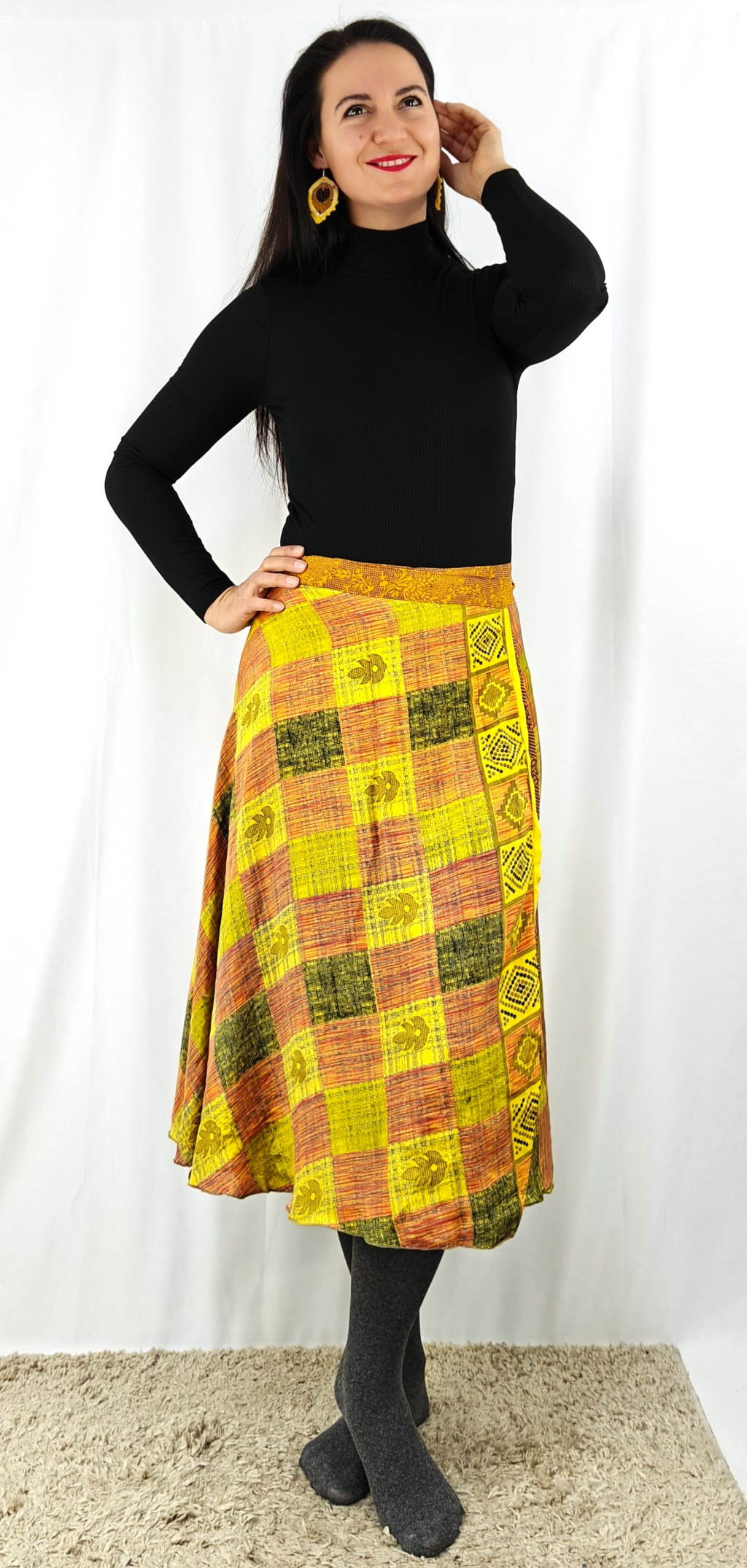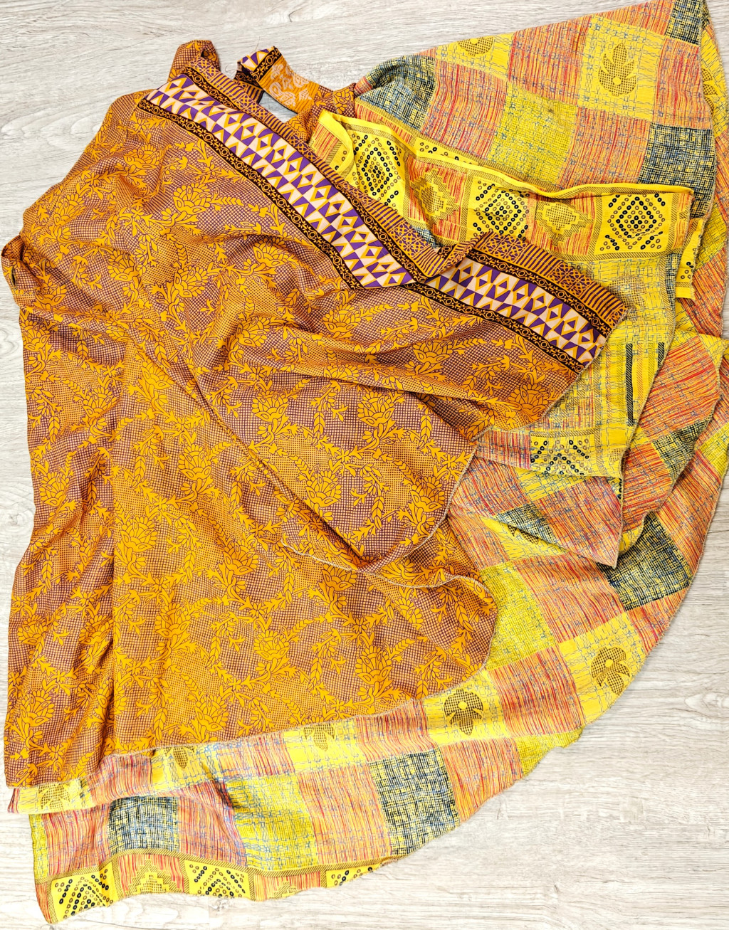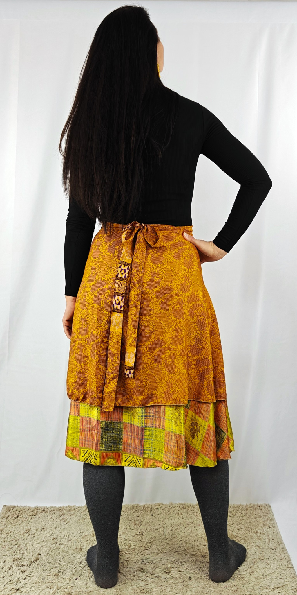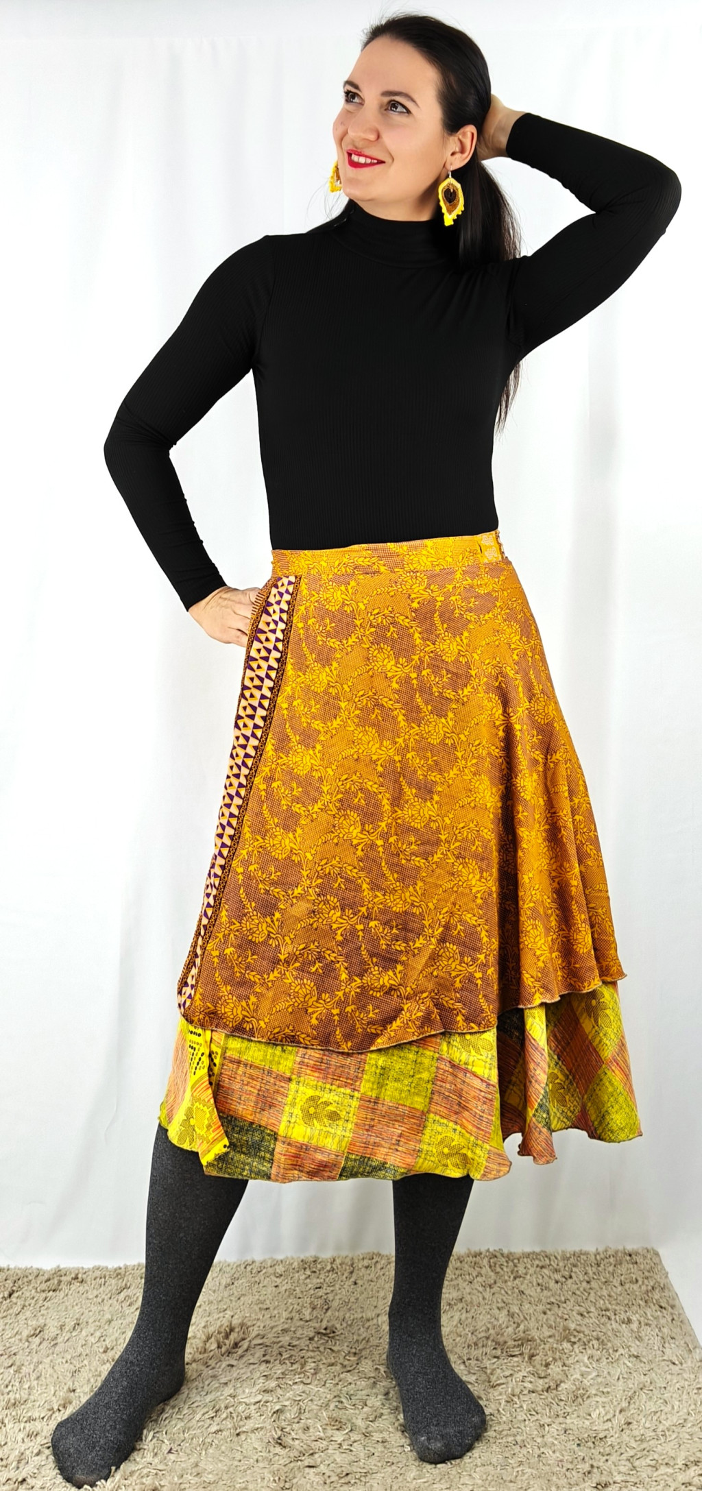 Lapszoknyáink újrahasznosított szárikból készülnek Indiában, egy hosszabb és egy rövidebb anyag derékban összevarrva! Két oldalú, kifordítható, mindkét oldala hordható, sokféleképpen köthető, variálható. Szoknyáinkból nincs két egyforma, mindegyikből csak EGY darab van, ha megtetszik, csapj le rá!