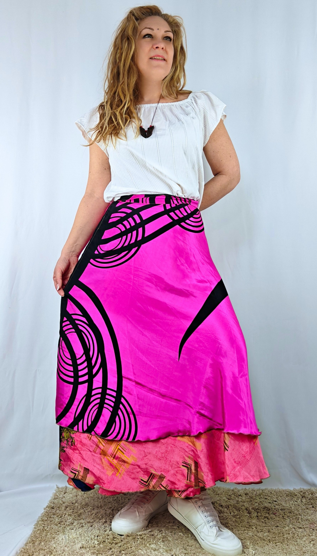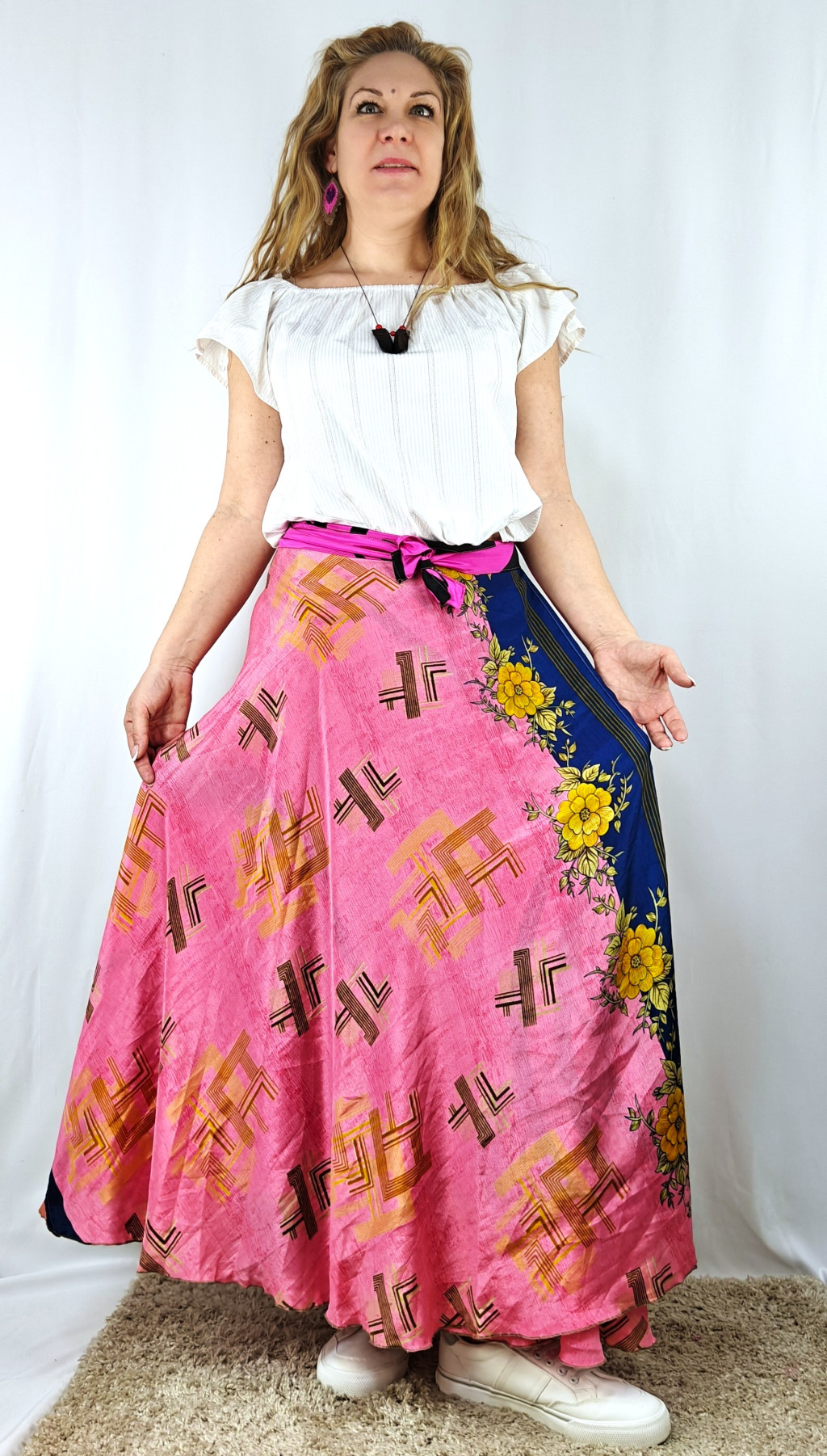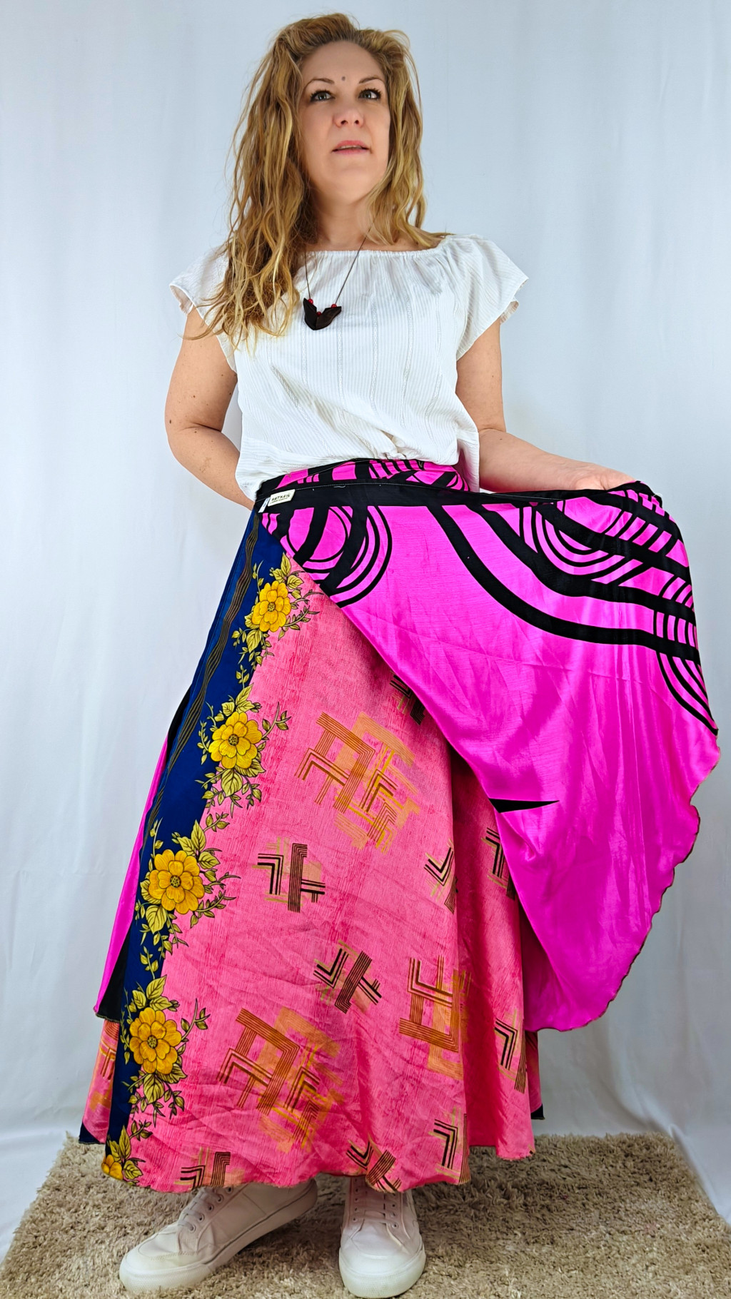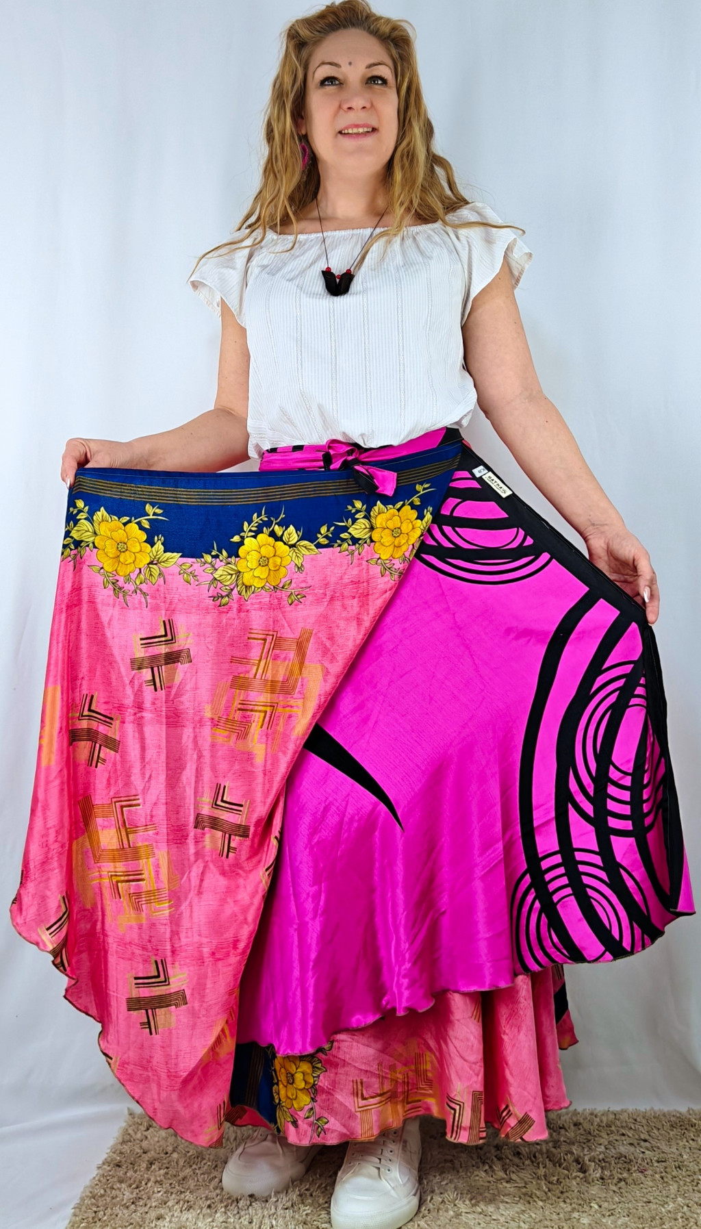 Lapszoknyáink újrahasznosított szárikból készülnek Indiában, egy hosszabb és egy rövidebb anyag derékban összevarrva! Két oldalú, kifordítható, mindkét oldala hordható, sokféleképpen köthető, variálható. Szoknyáinkból nincs két egyforma, mindegyikből csak EGY darab van, ha megtetszik, csapj le rá!