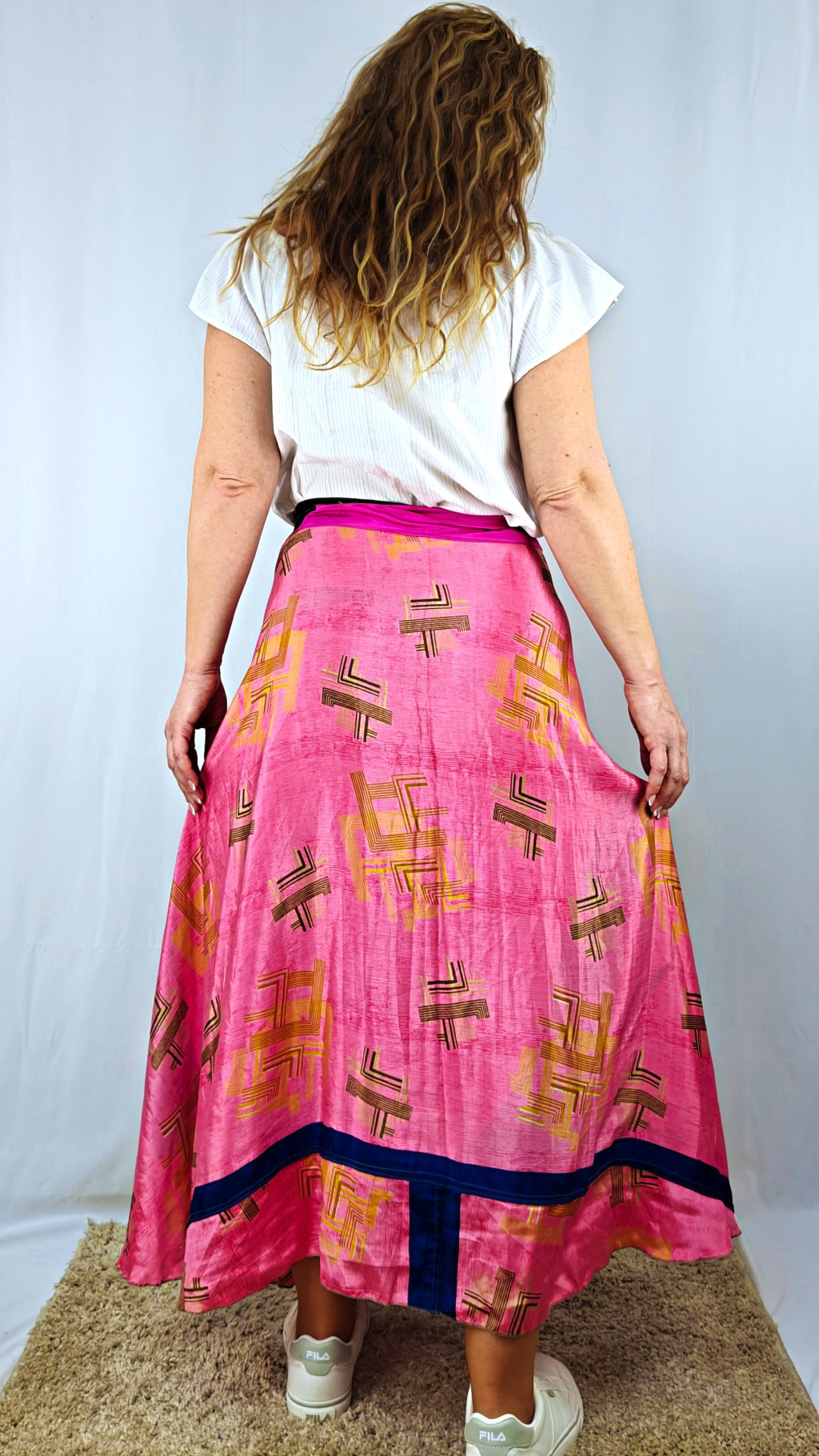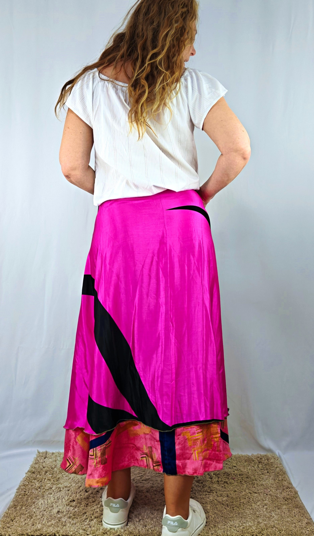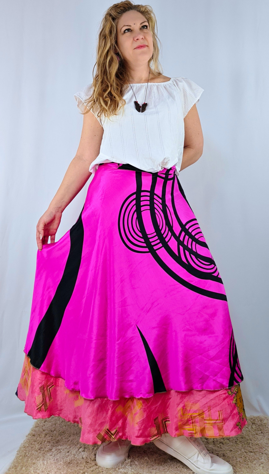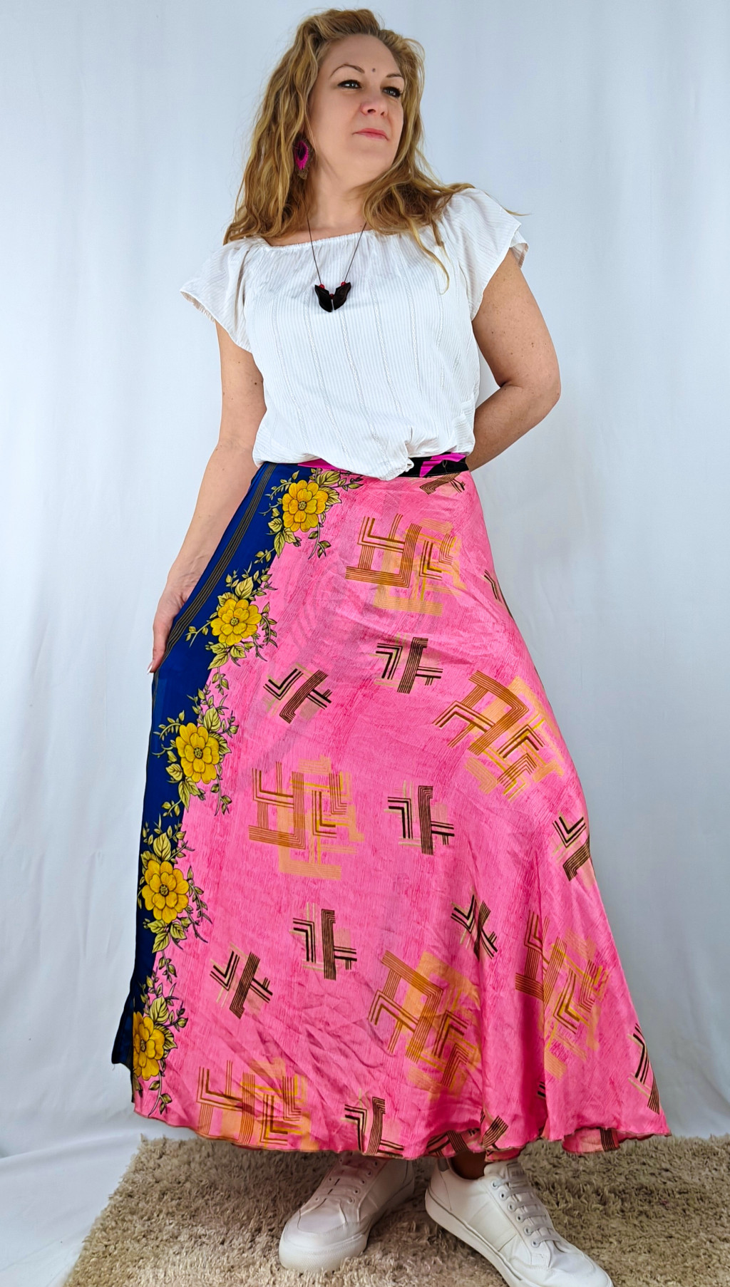 Lapszoknyáink újrahasznosított szárikból készülnek Indiában, egy hosszabb és egy rövidebb anyag derékban összevarrva! Két oldalú, kifordítható, mindkét oldala hordható, sokféleképpen köthető, variálható. Szoknyáinkból nincs két egyforma, mindegyikből csak EGY darab van, ha megtetszik, csapj le rá!