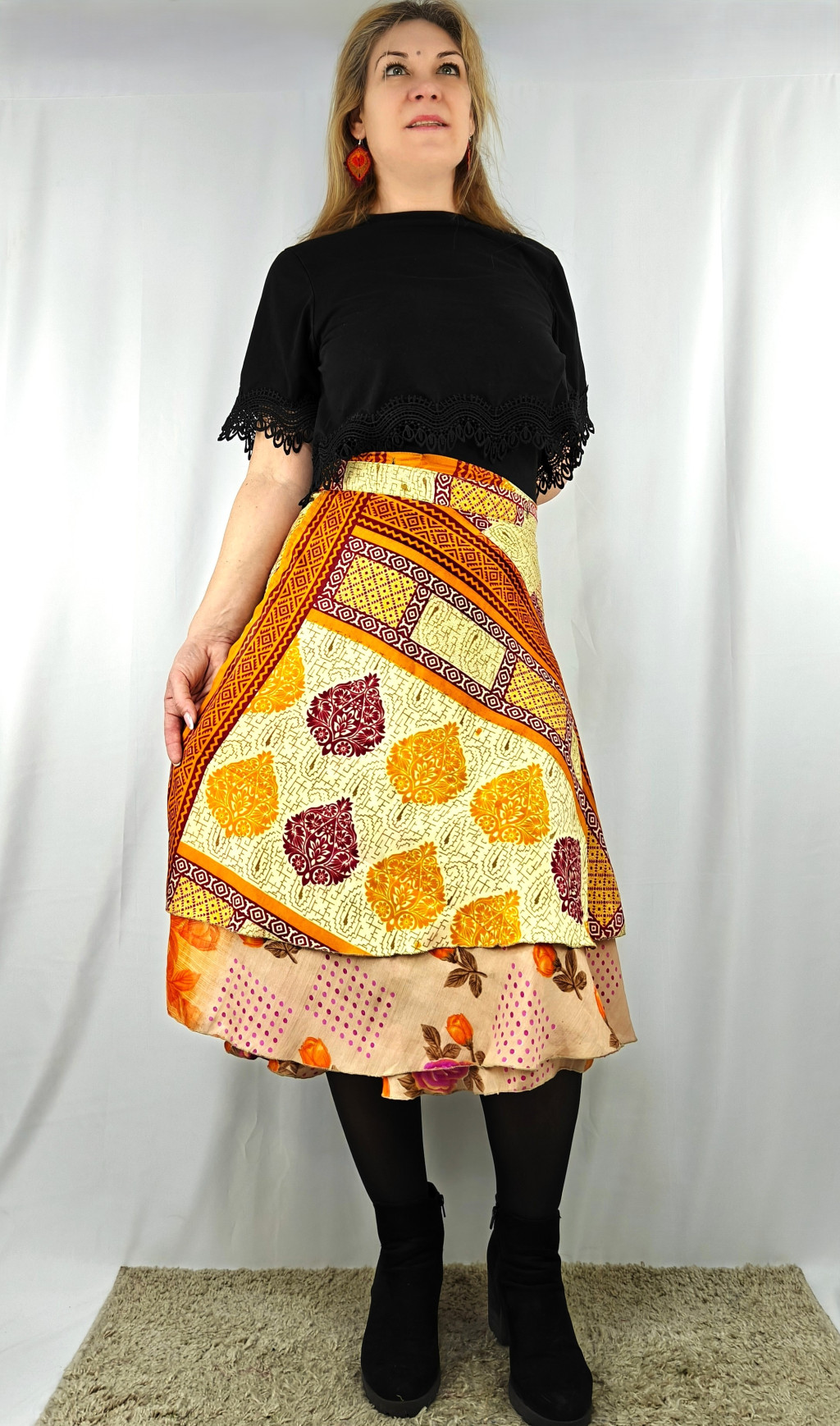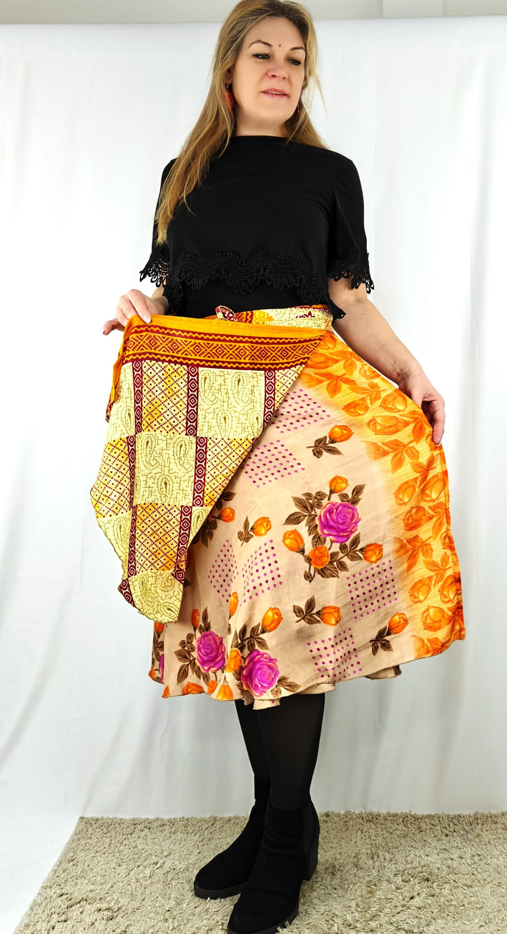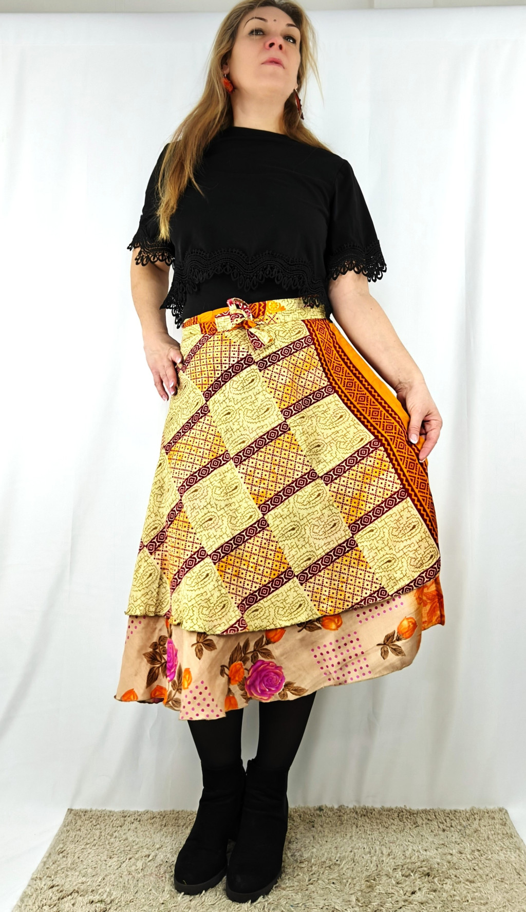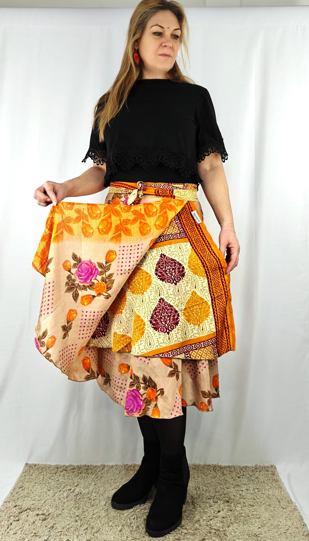 Lapszoknyáink újrahasznosított szárikból készülnek Indiában, egy hosszabb és egy rövidebb anyag derékban összevarrva! Két oldalú, kifordítható, mindkét oldala hordható, sokféleképpen köthető, variálható. Szoknyáinkból nincs két egyforma, mindegyikből csak EGY darab van, ha megtetszik, csapj le rá!