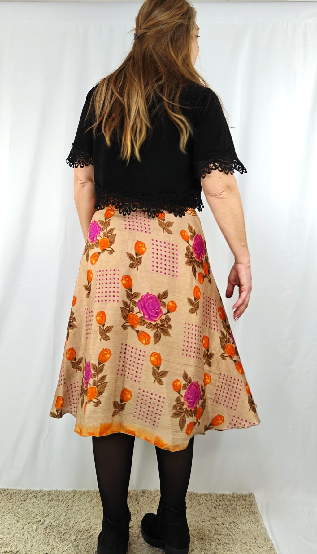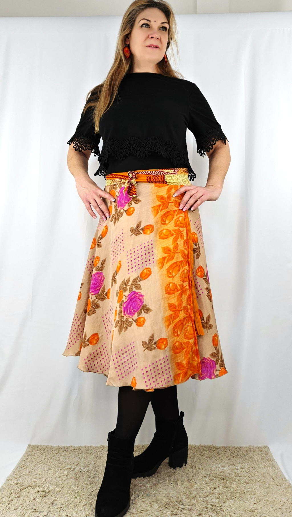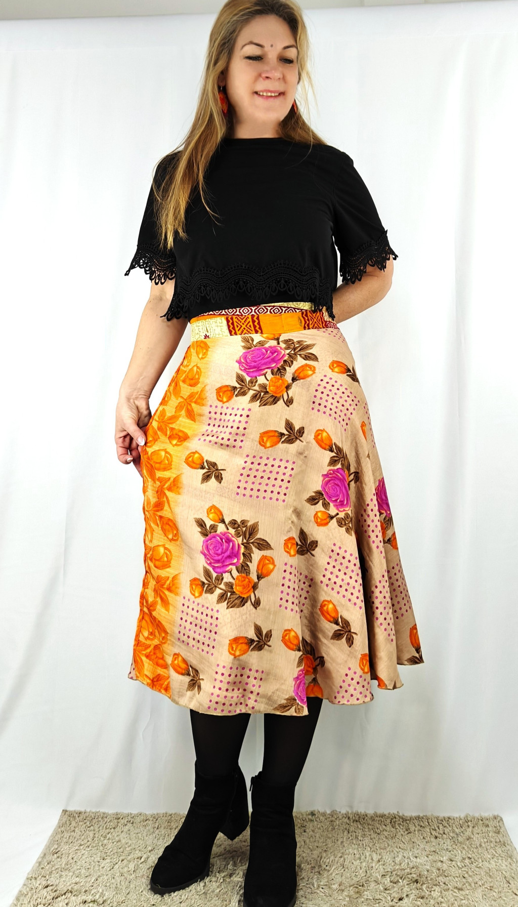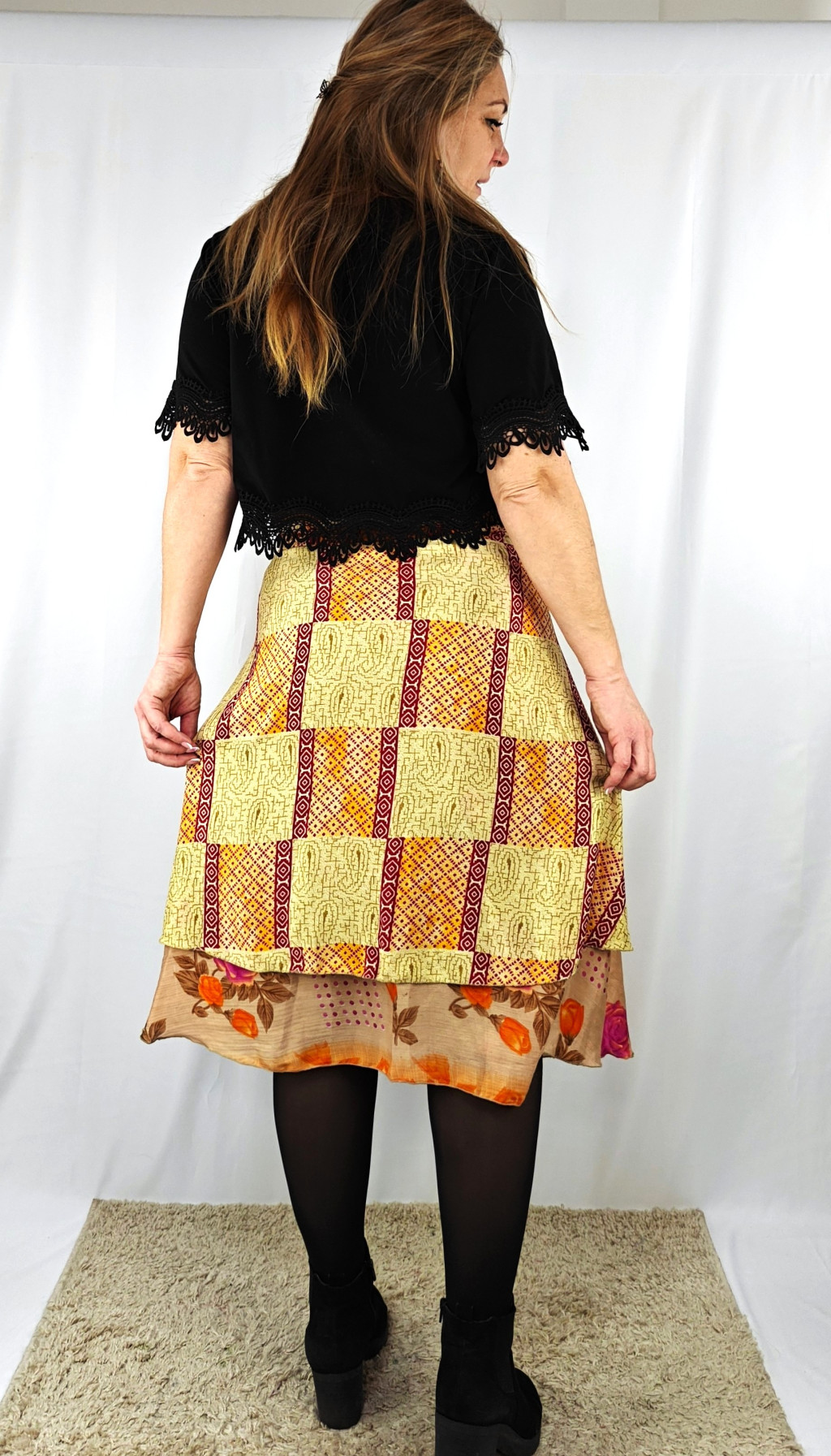 Lapszoknyáink újrahasznosított szárikból készülnek Indiában, egy hosszabb és egy rövidebb anyag derékban összevarrva! Két oldalú, kifordítható, mindkét oldala hordható, sokféleképpen köthető, variálható. Szoknyáinkból nincs két egyforma, mindegyikből csak EGY darab van, ha megtetszik, csapj le rá!