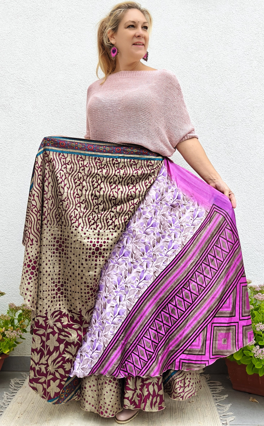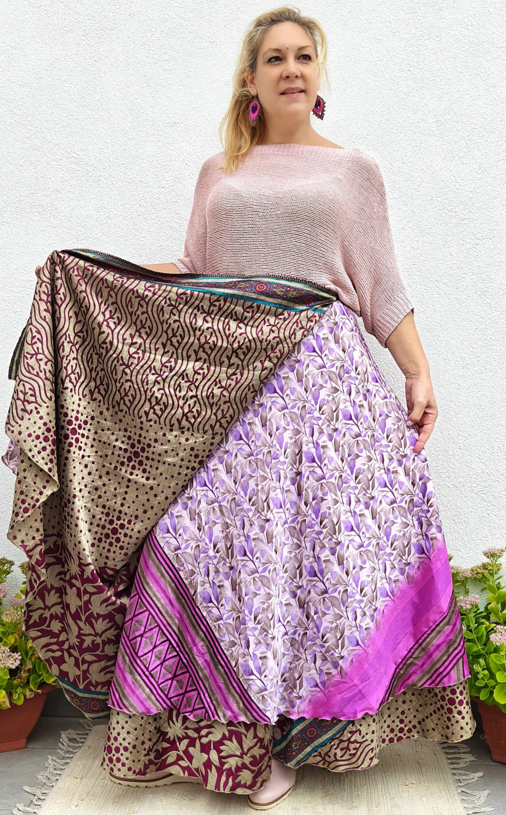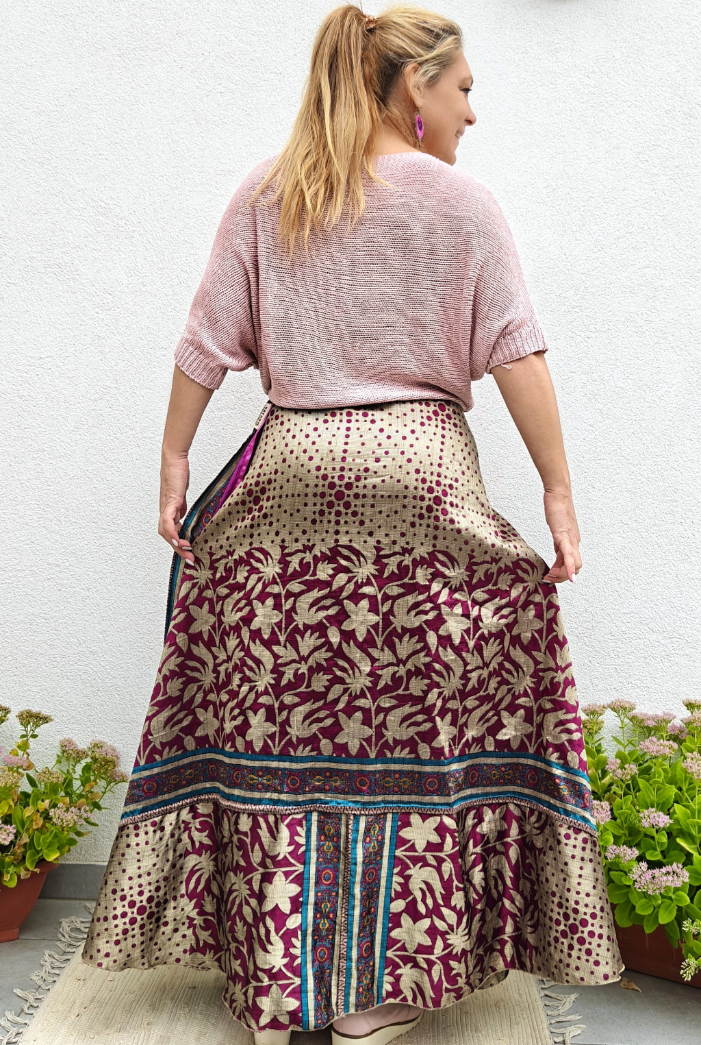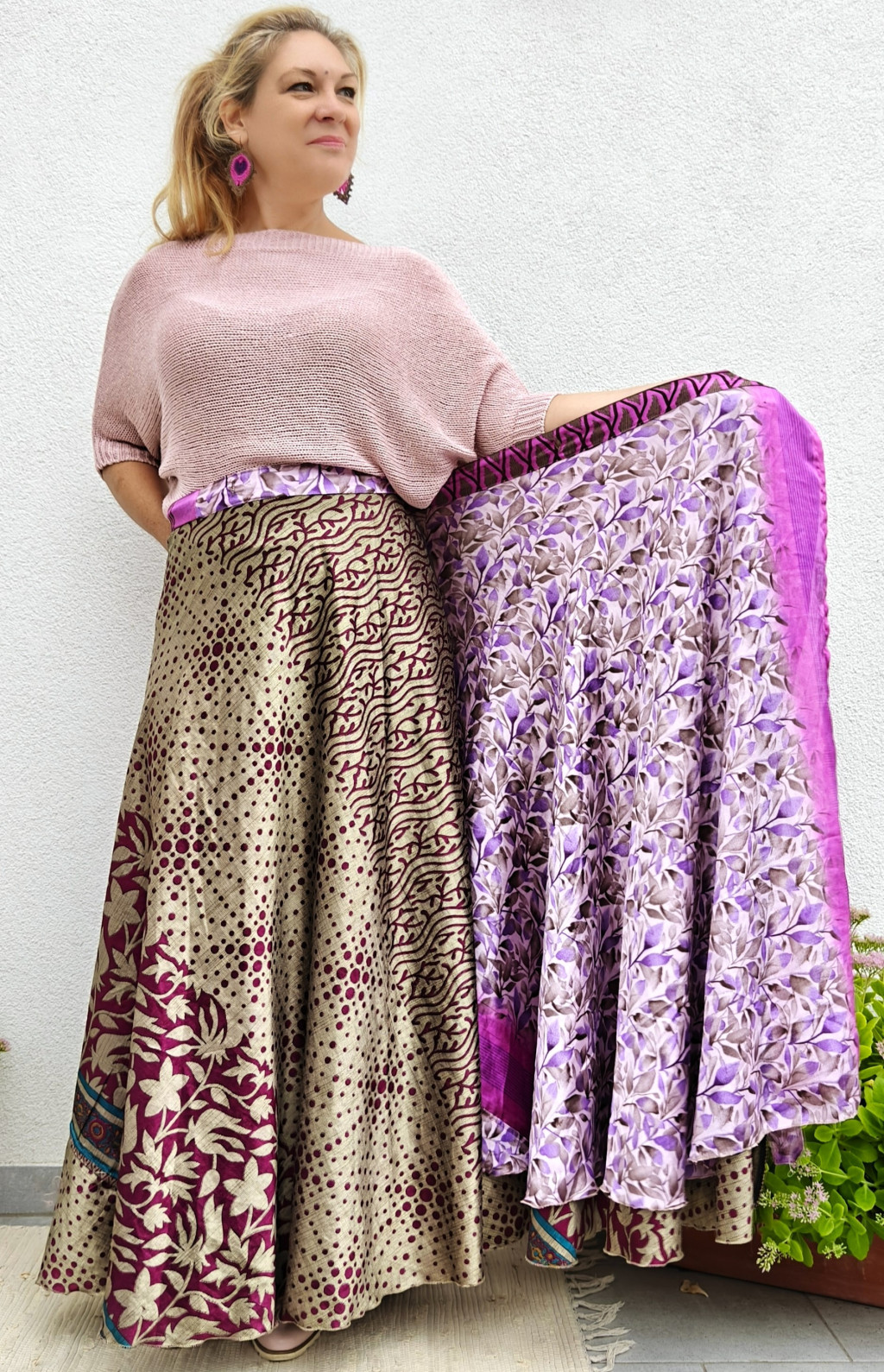 Lapszoknyáink újrahasznosított szárikból készülnek Indiában, egy hosszabb és egy rövidebb anyag derékban összevarrva! Két oldalú, kifordítható, mindkét oldala hordható, sokféleképpen köthető, variálható. Szoknyáinkból nincs két egyforma, mindegyikből csak EGY darab van, ha megtetszik, csapj le rá!