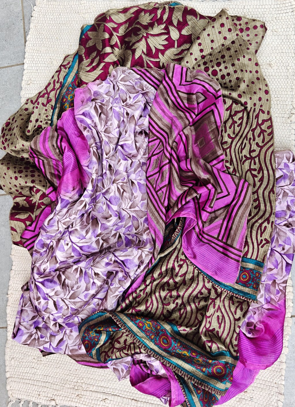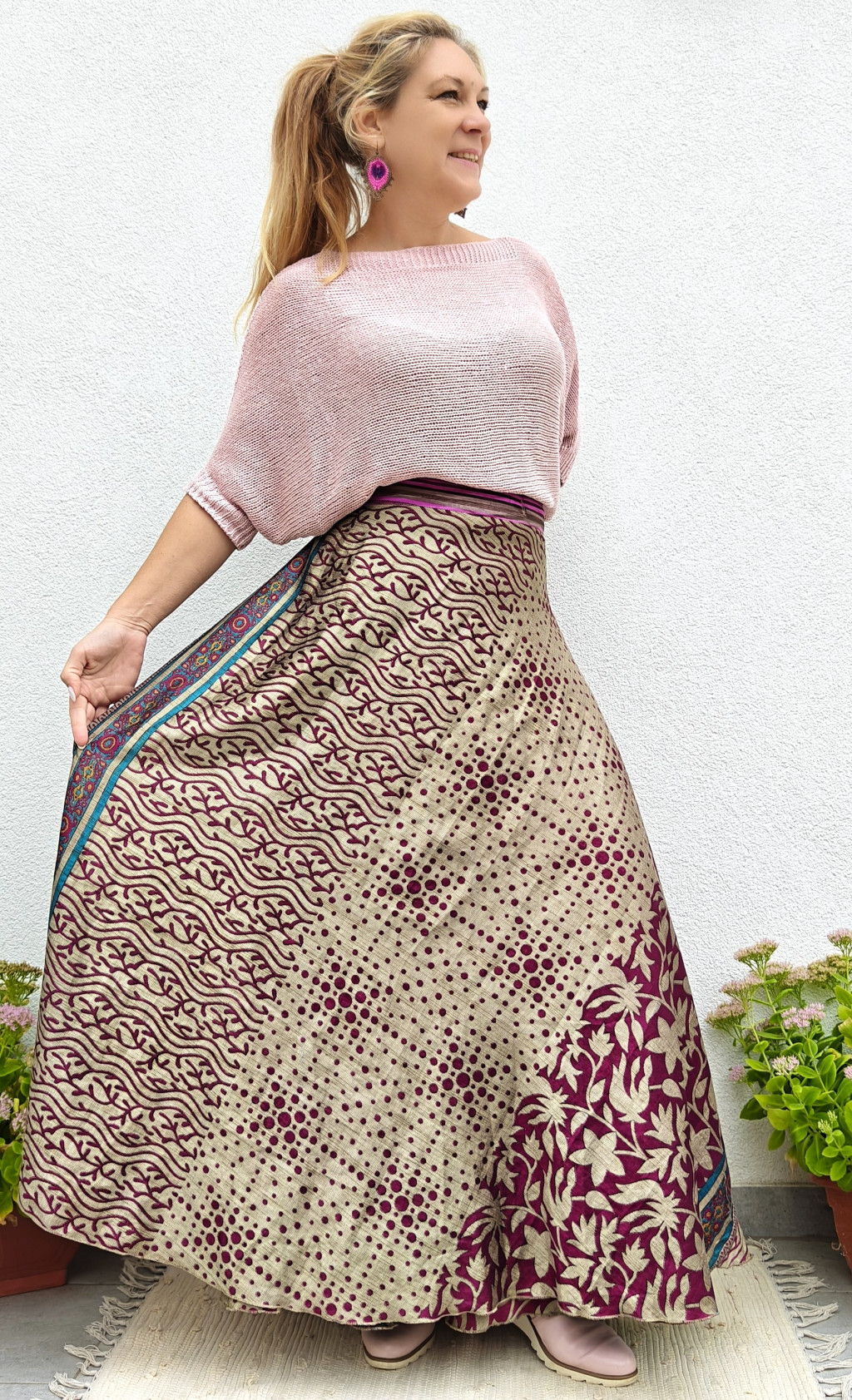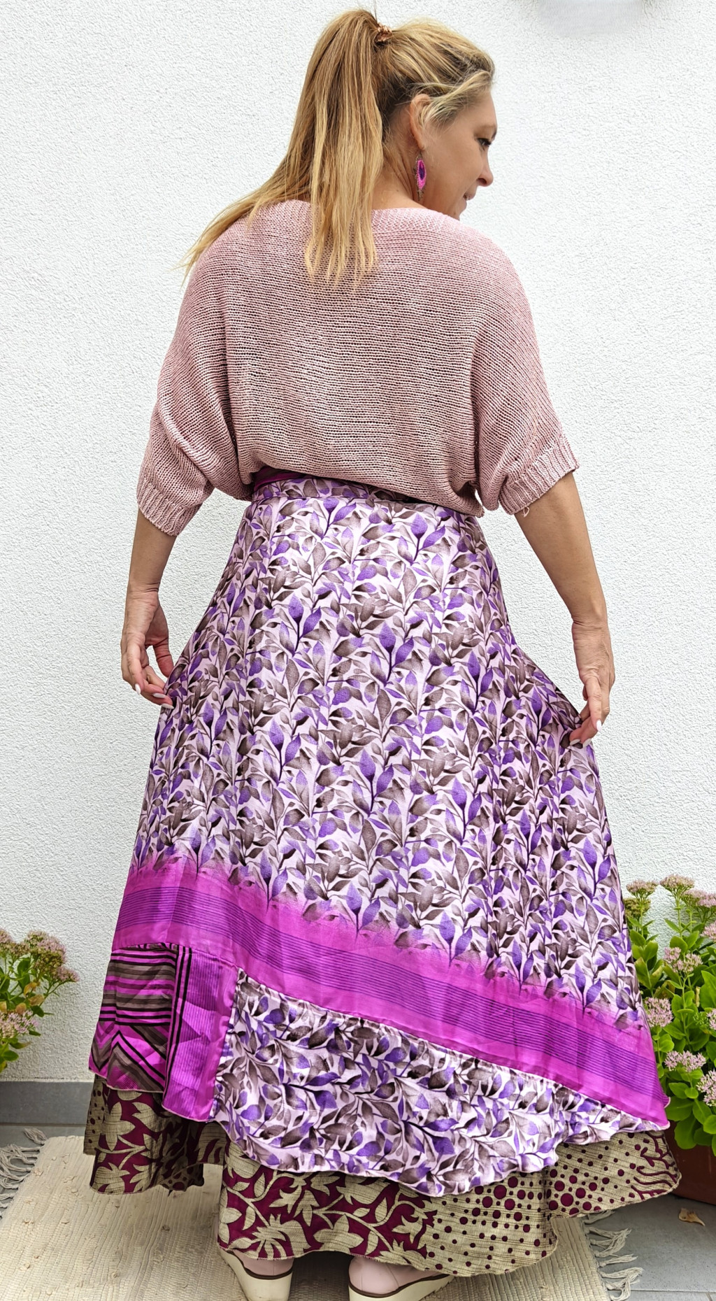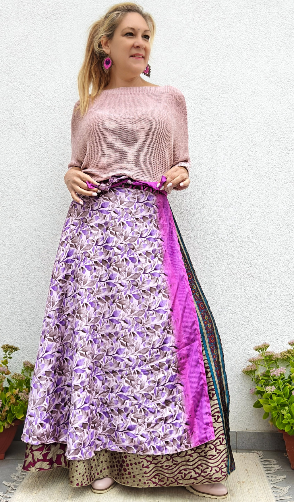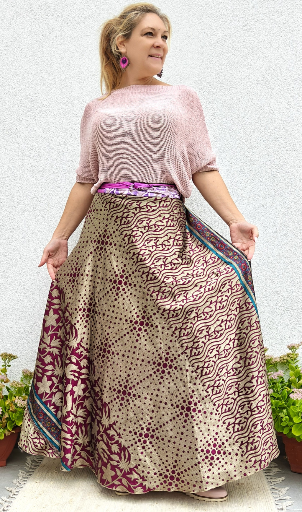 Lapszoknyáink újrahasznosított szárikból készülnek Indiában, egy hosszabb és egy rövidebb anyag derékban összevarrva! Két oldalú, kifordítható, mindkét oldala hordható, sokféleképpen köthető, variálható. Szoknyáinkból nincs két egyforma, mindegyikből csak EGY darab van, ha megtetszik, csapj le rá!