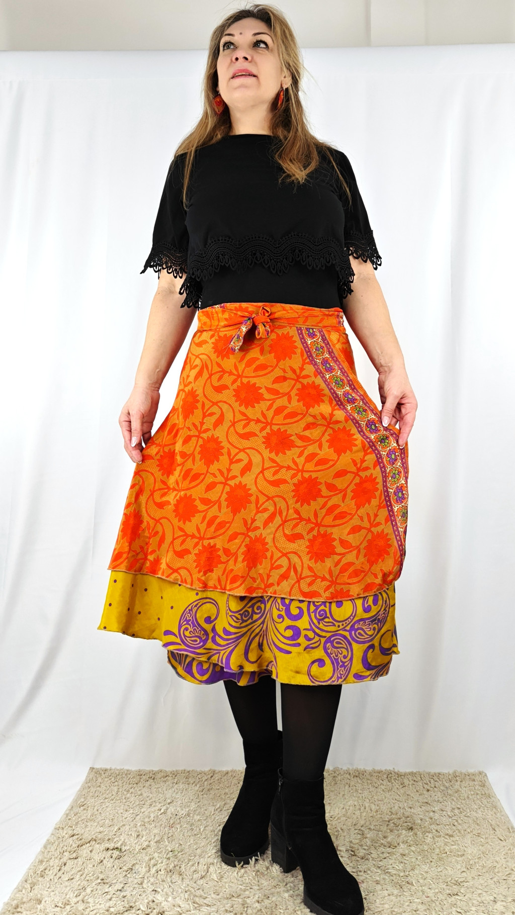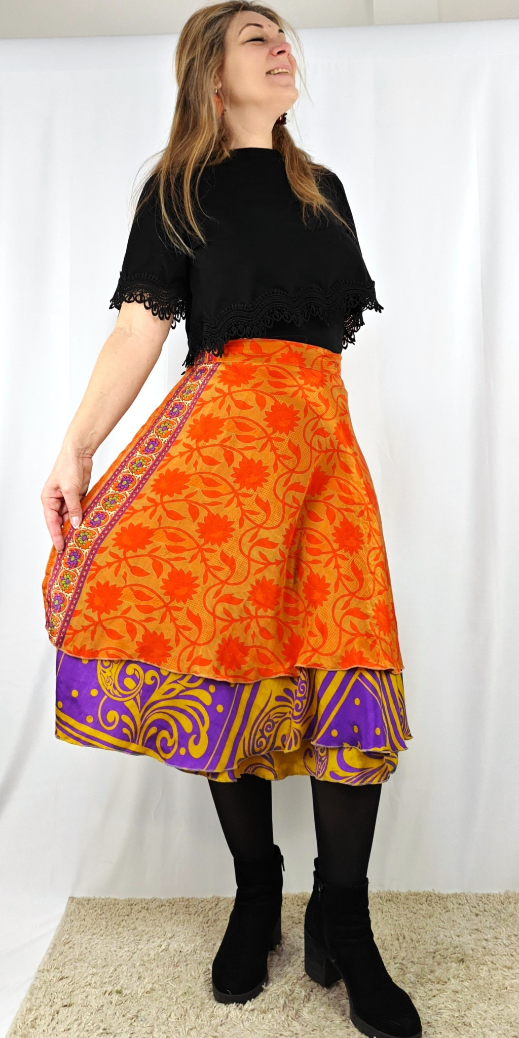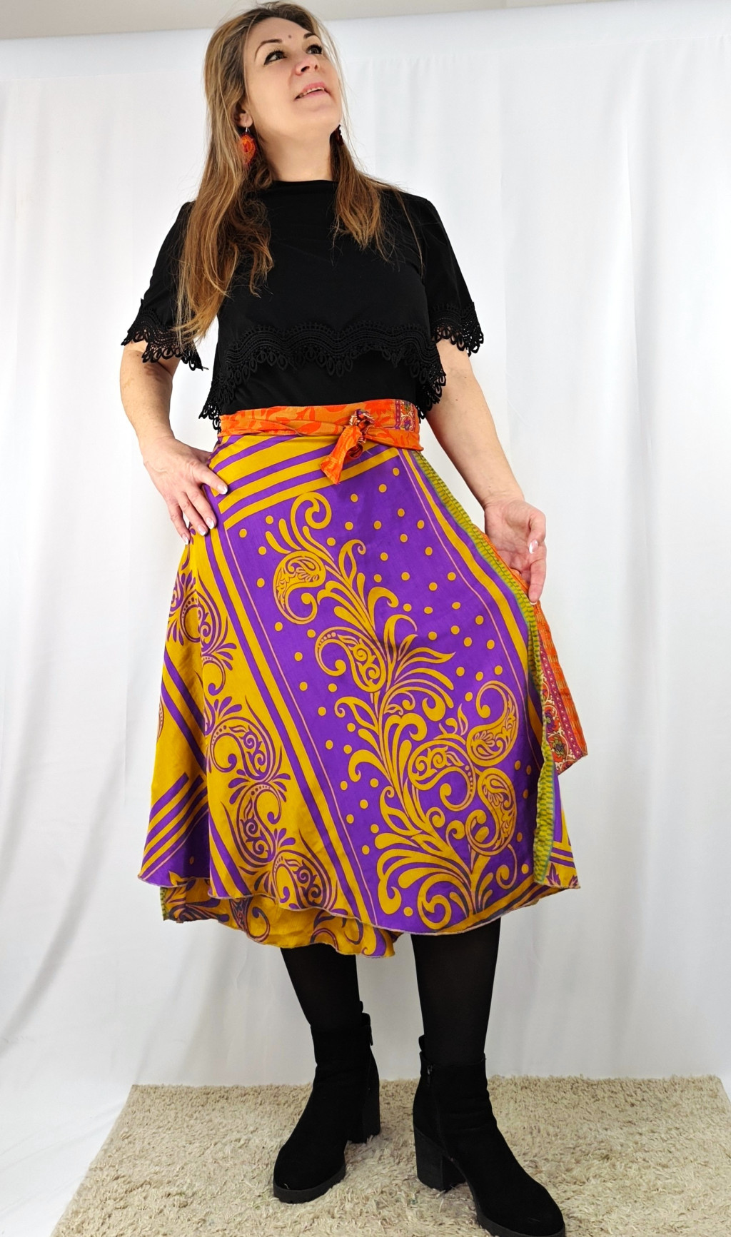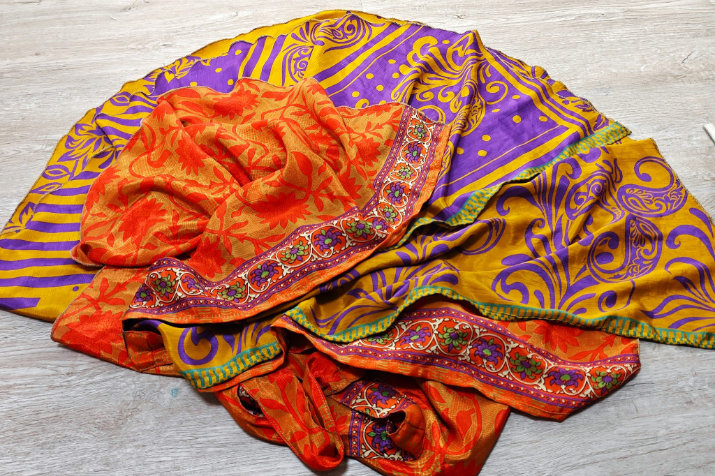 Lapszoknyáink újrahasznosított szárikból készülnek Indiában, egy hosszabb és egy rövidebb anyag derékban összevarrva! Két oldalú, kifordítható, mindkét oldala hordható, sokféleképpen köthető, variálható. Szoknyáinkból nincs két egyforma, mindegyikből csak EGY darab van, ha megtetszik, csapj le rá!