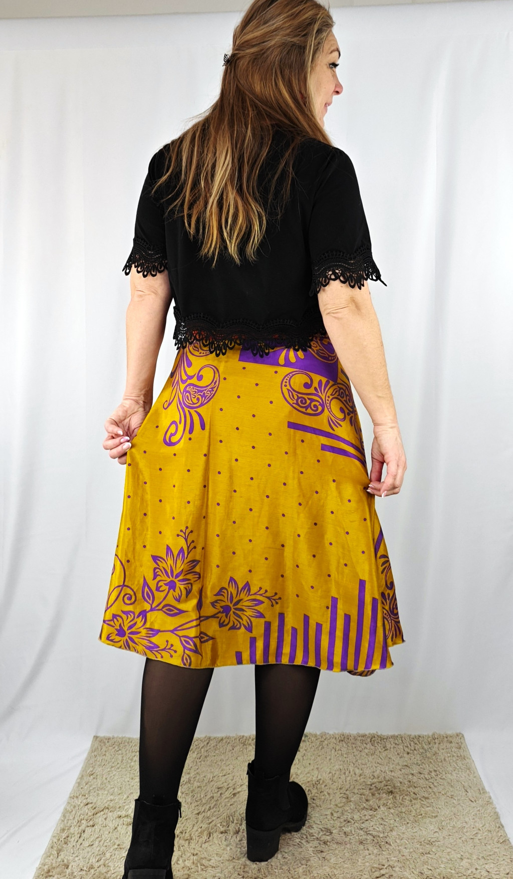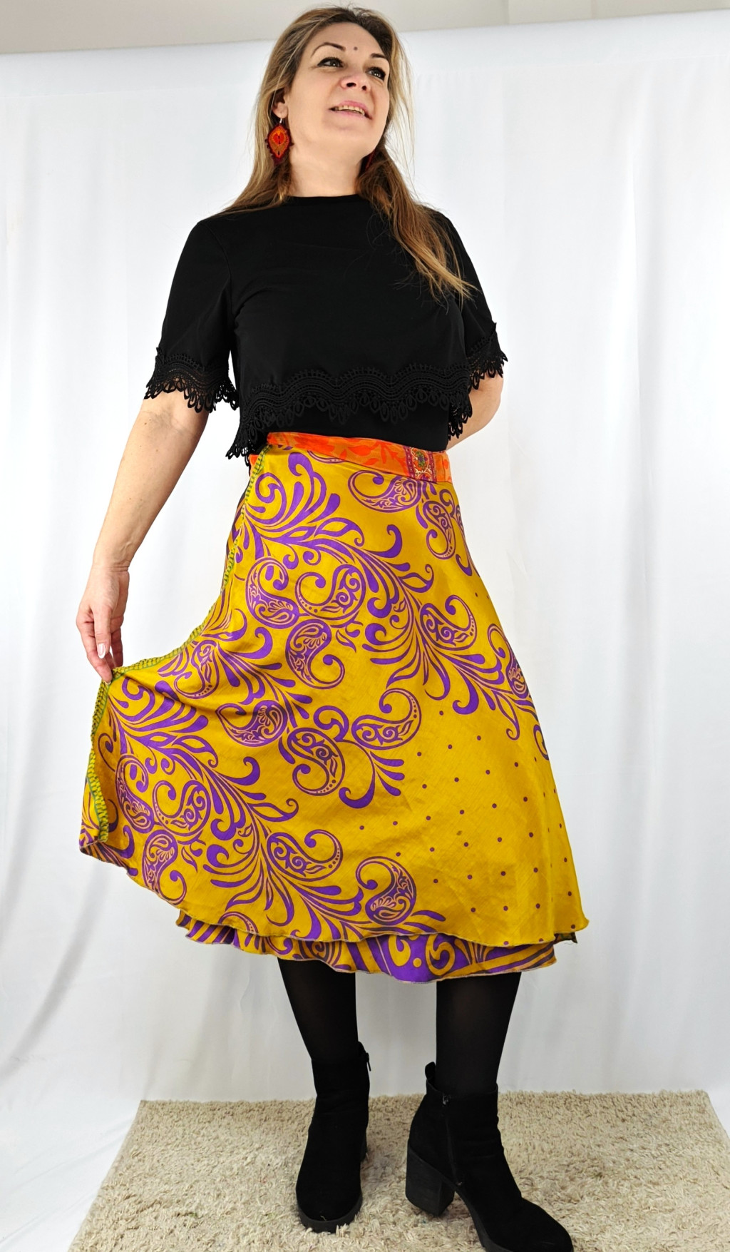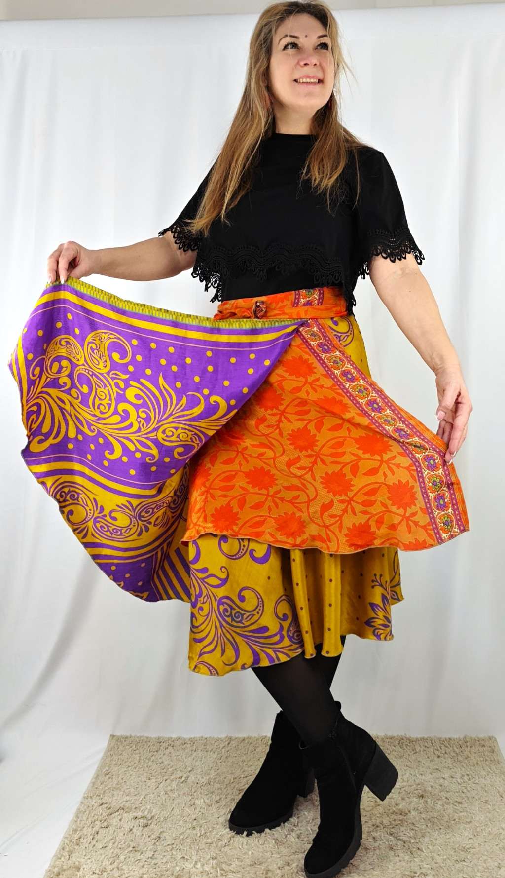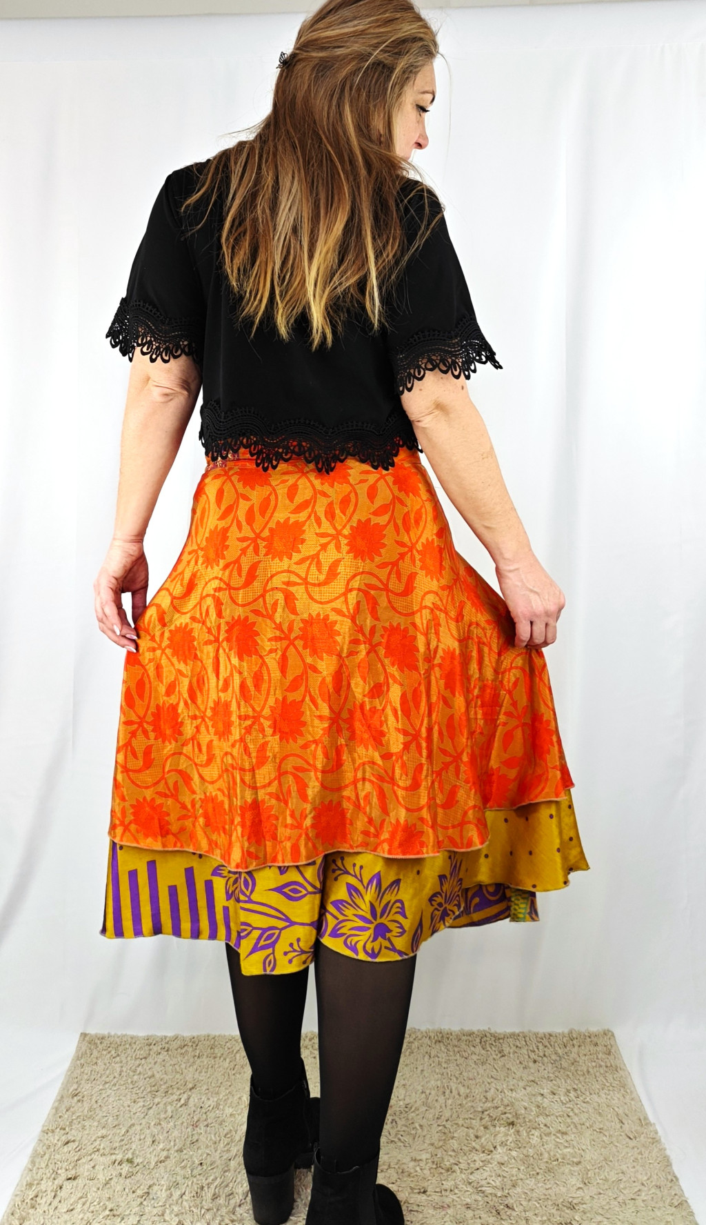 Lapszoknyáink újrahasznosított szárikból készülnek Indiában, egy hosszabb és egy rövidebb anyag derékban összevarrva! Két oldalú, kifordítható, mindkét oldala hordható, sokféleképpen köthető, variálható. Szoknyáinkból nincs két egyforma, mindegyikből csak EGY darab van, ha megtetszik, csapj le rá!