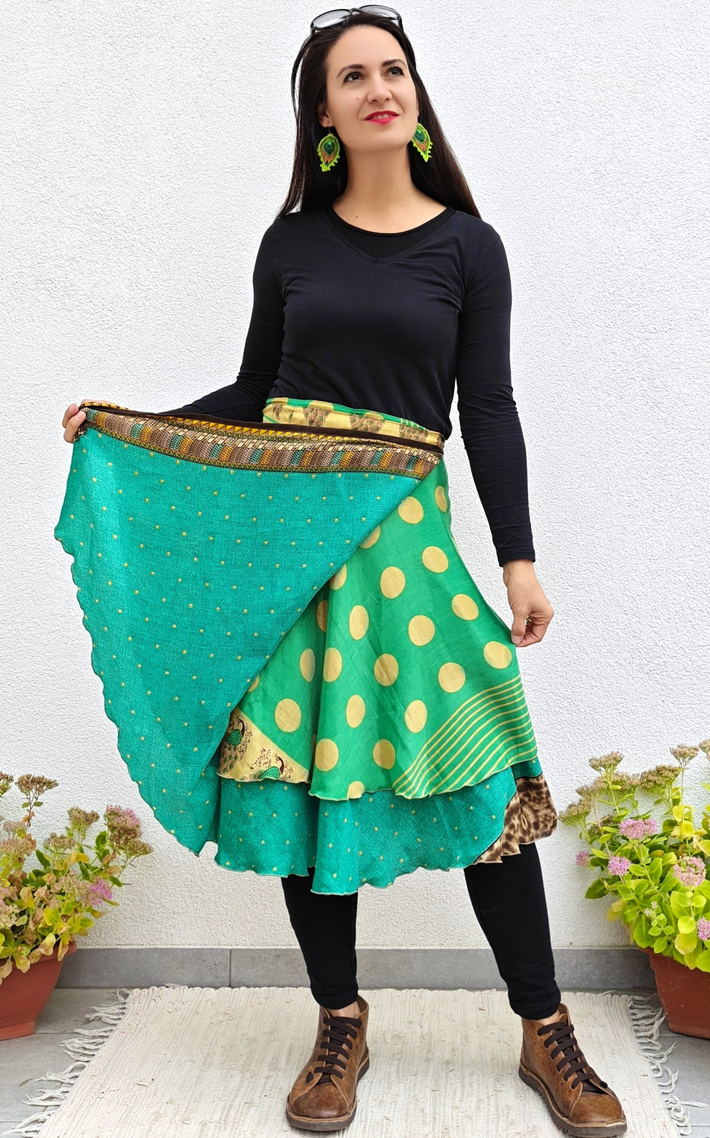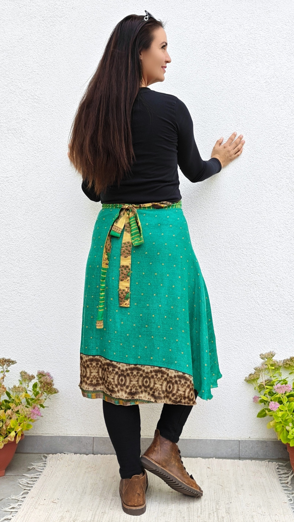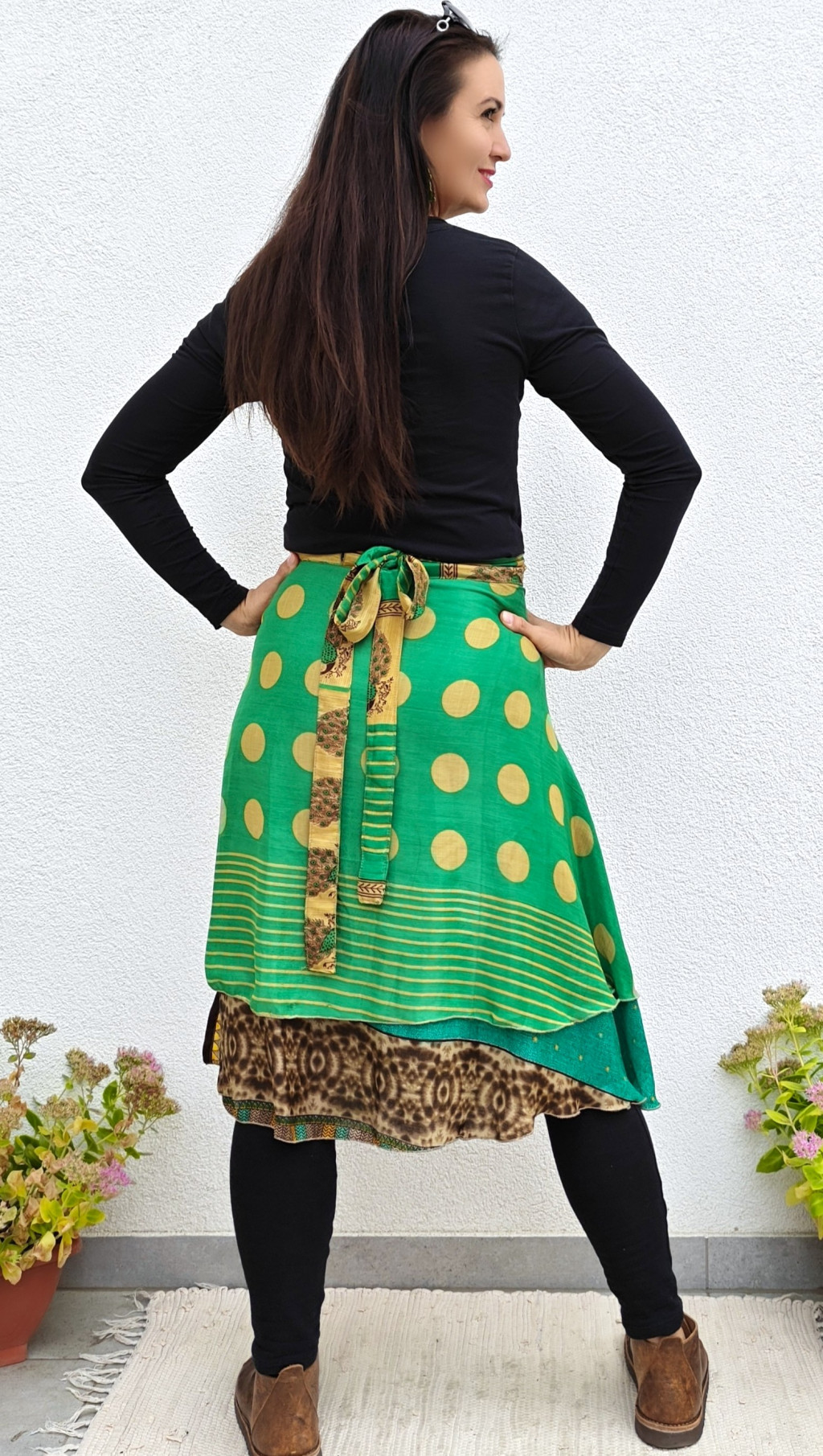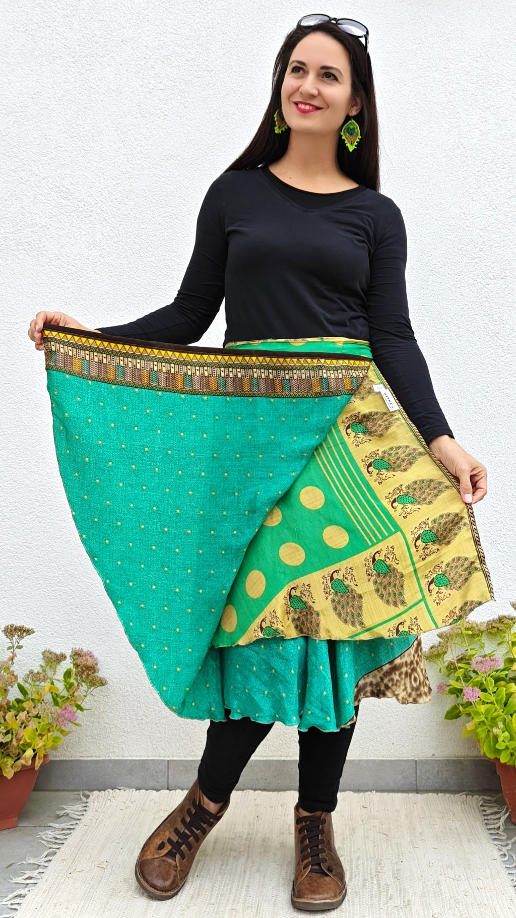 Lapszoknyáink újrahasznosított szárikból készülnek Indiában, egy hosszabb és egy rövidebb anyag derékban összevarrva! Két oldalú, kifordítható, mindkét oldala hordható, sokféleképpen köthető, variálható. Szoknyáinkból nincs két egyforma, mindegyikből csak EGY darab van, ha megtetszik, csapj le rá!