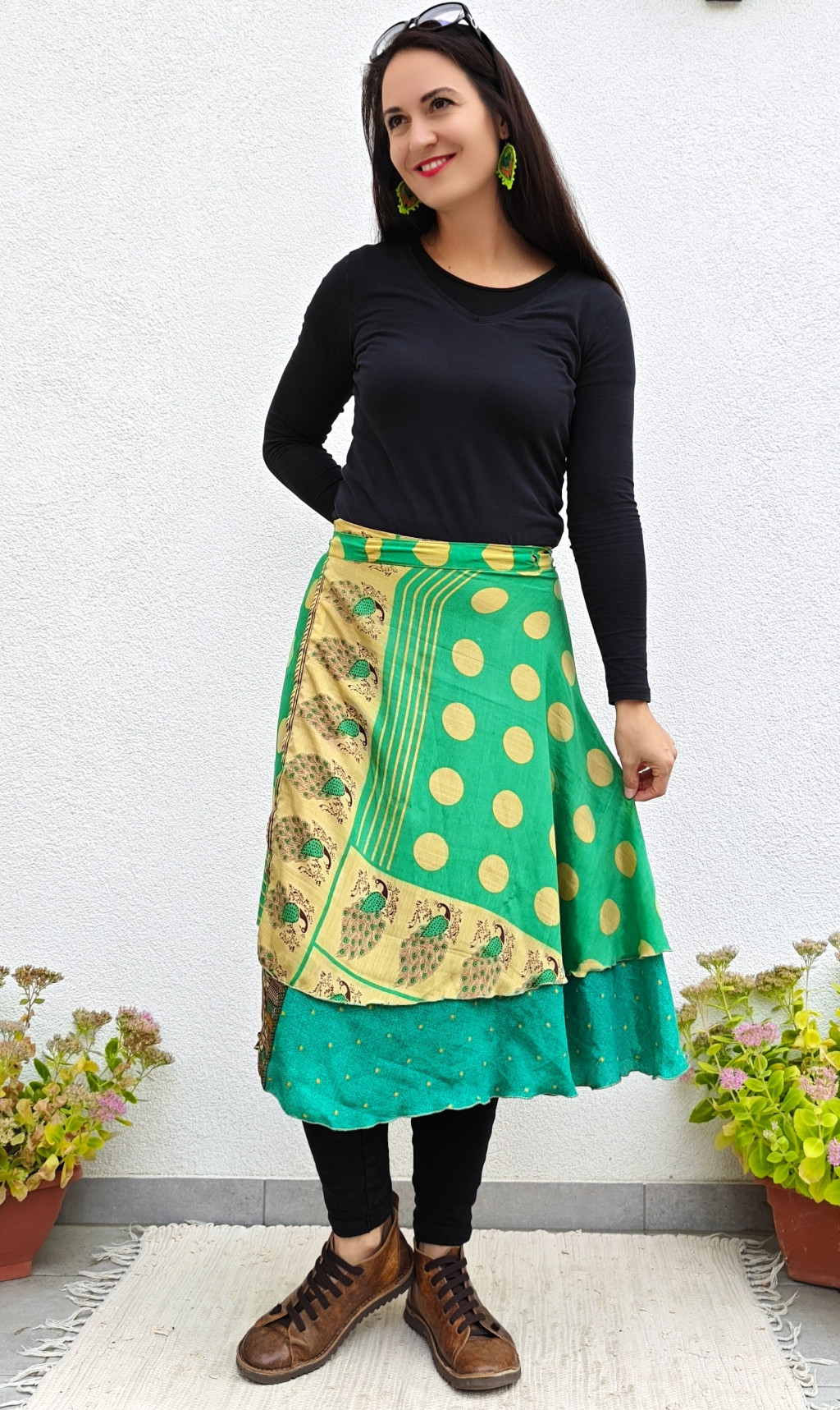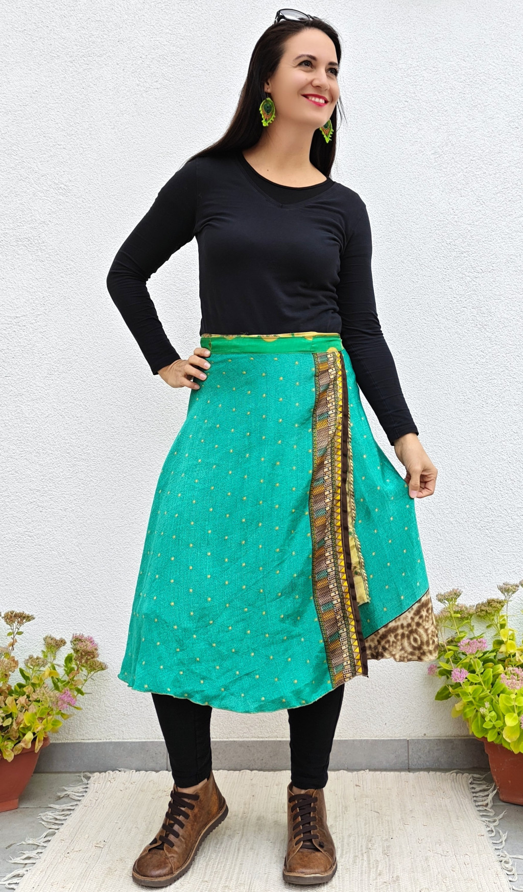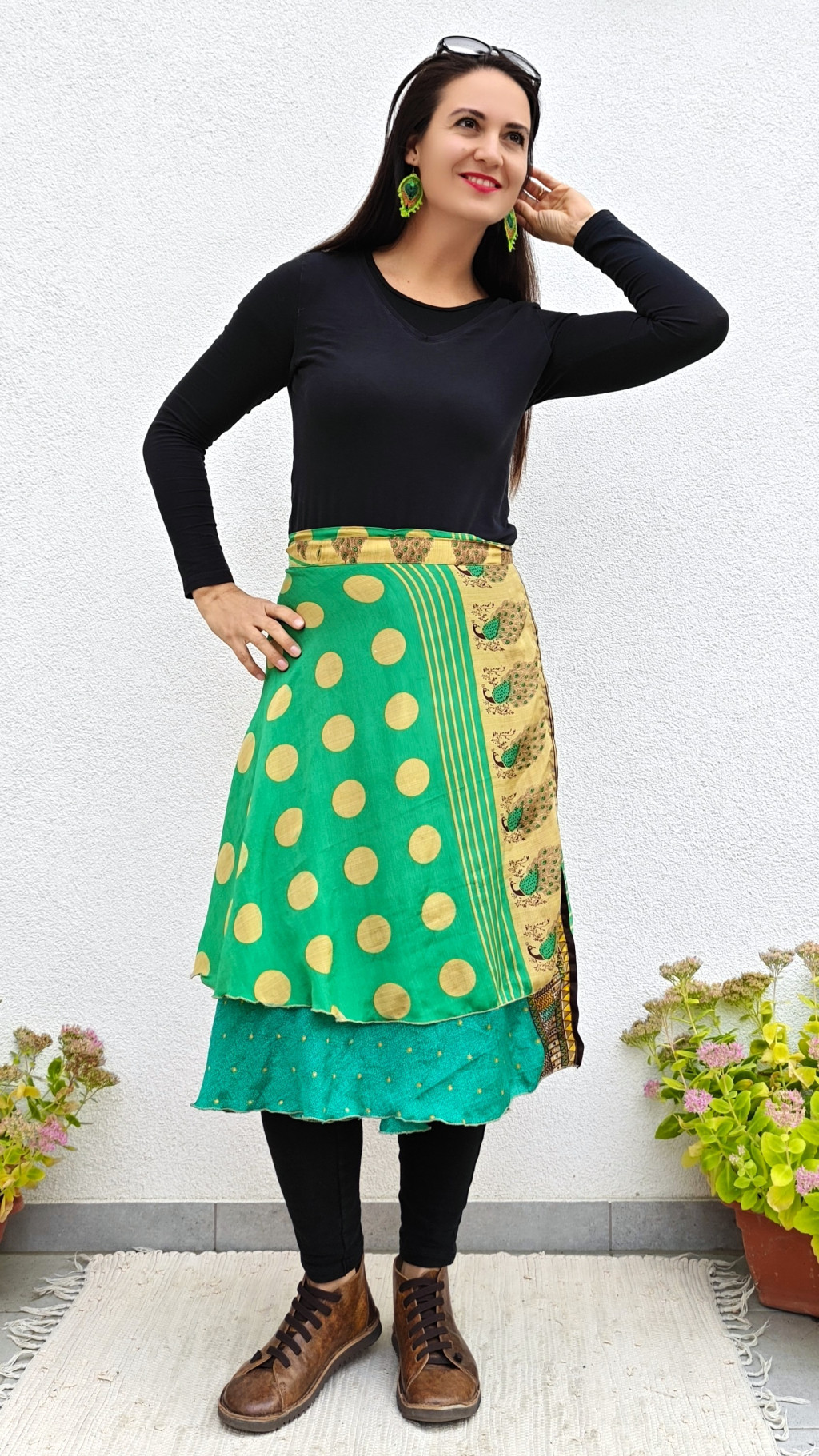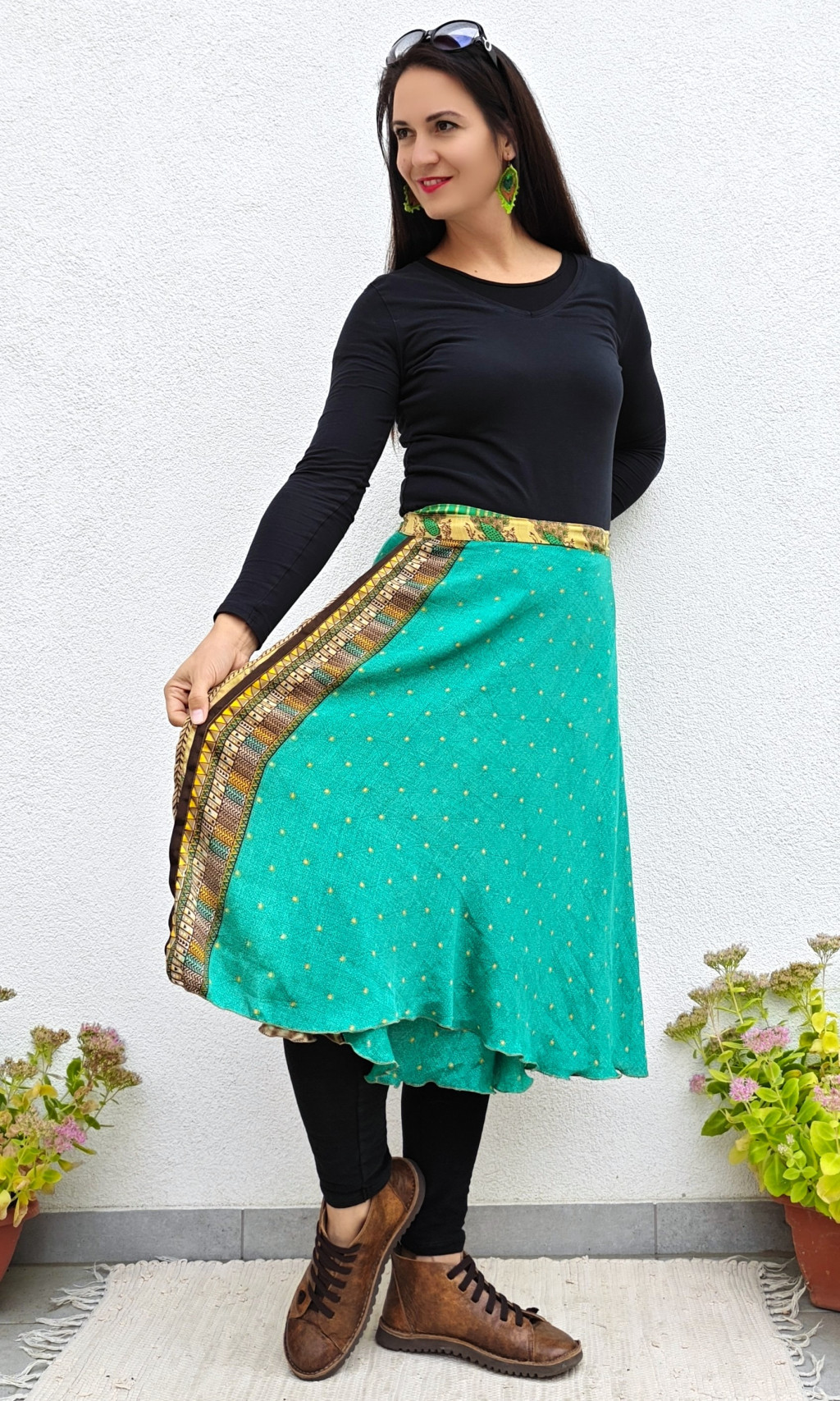 Lapszoknyáink újrahasznosított szárikból készülnek Indiában, egy hosszabb és egy rövidebb anyag derékban összevarrva! Két oldalú, kifordítható, mindkét oldala hordható, sokféleképpen köthető, variálható. Szoknyáinkból nincs két egyforma, mindegyikből csak EGY darab van, ha megtetszik, csapj le rá!