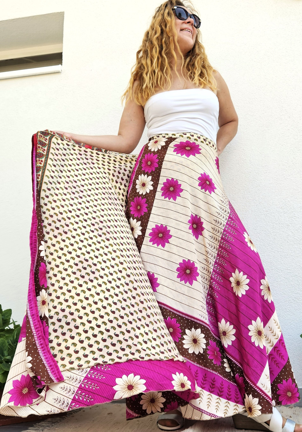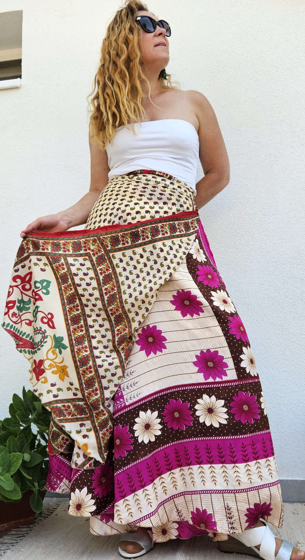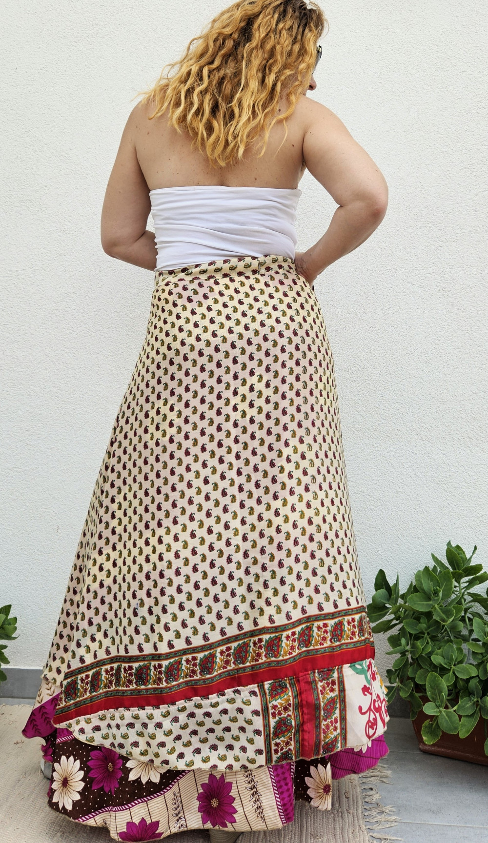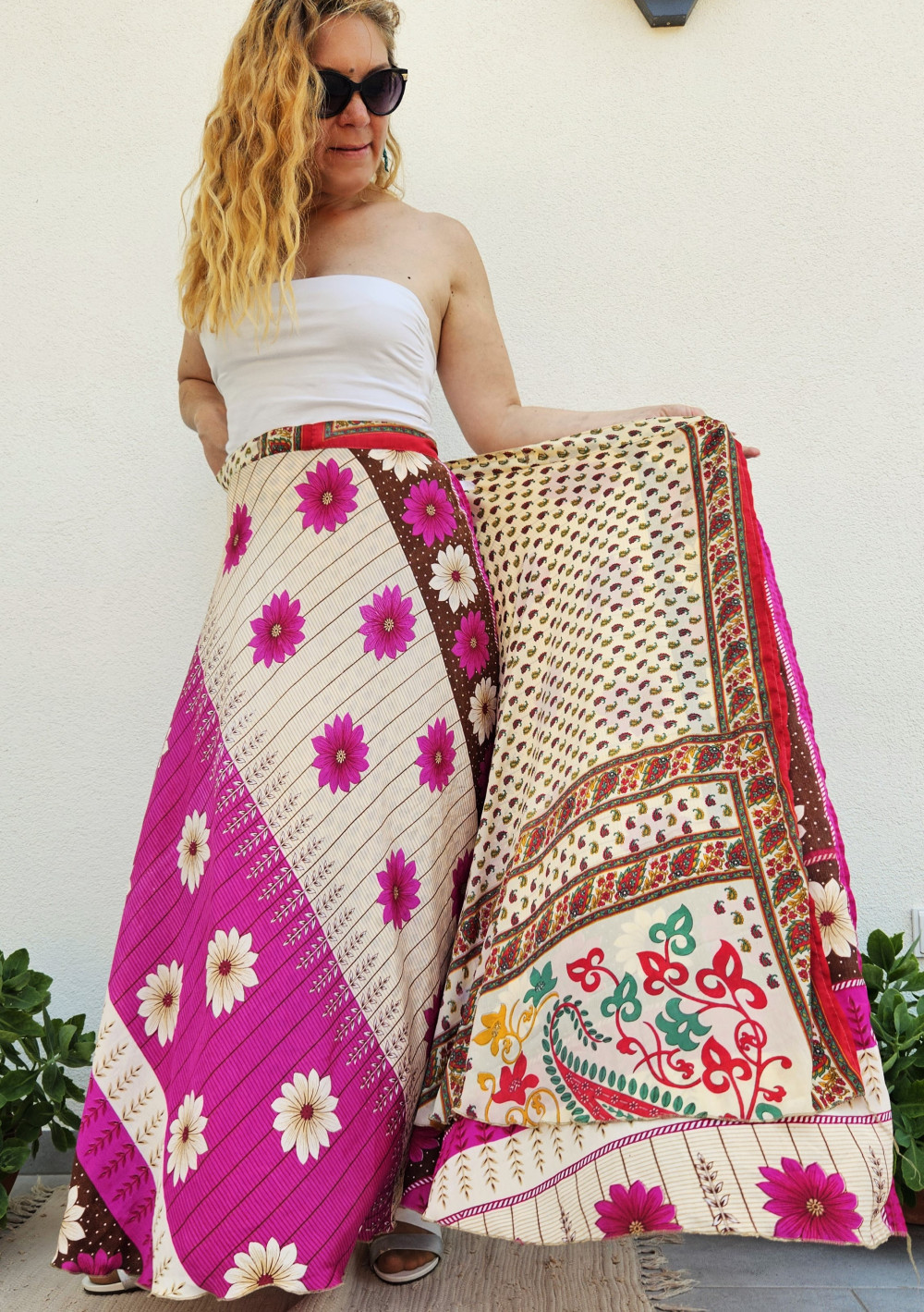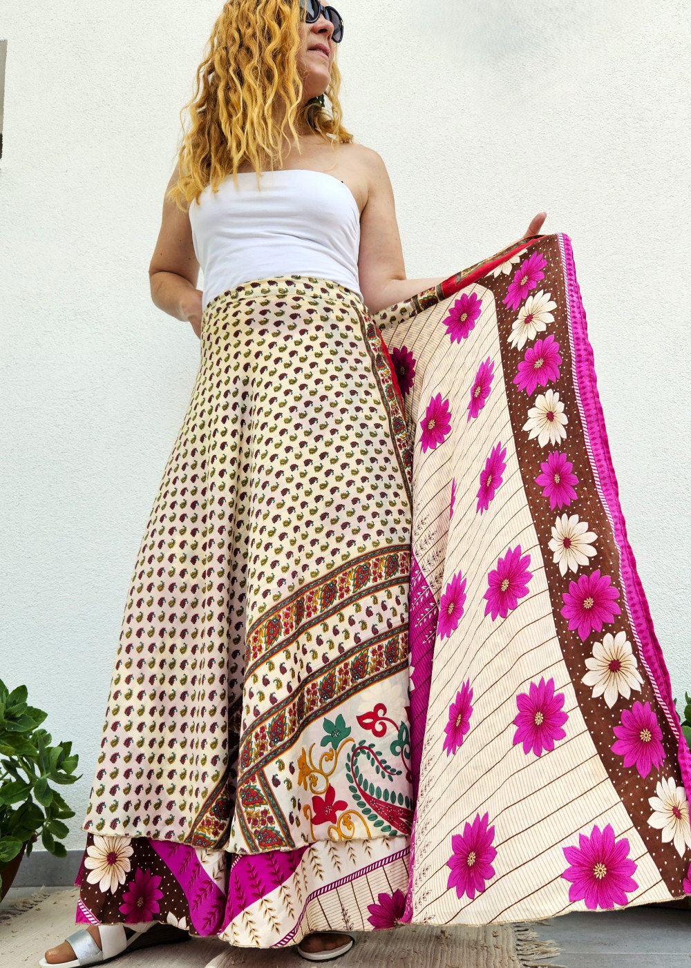 Lapszoknyáink újrahasznosított szárikból készülnek Indiában, egy hosszabb és egy rövidebb anyag derékban összevarrva! Kifordítható, mindkét oldala hordható, sokféleképpen köthető, variálható. Szoknyáinkból nincs két egyforma, mindegyikből csak EGY darab van, ha megtetszik, csapj le rá!