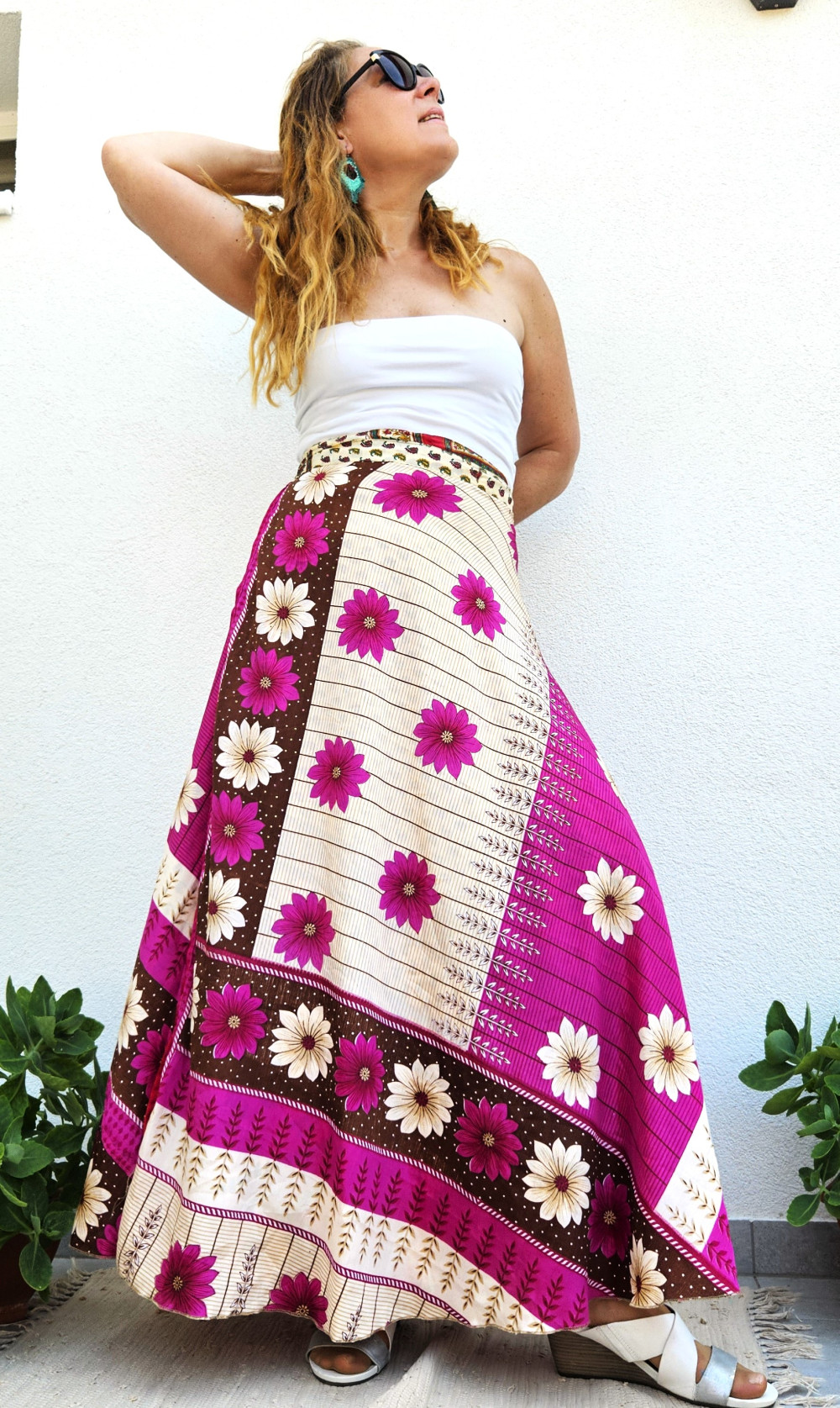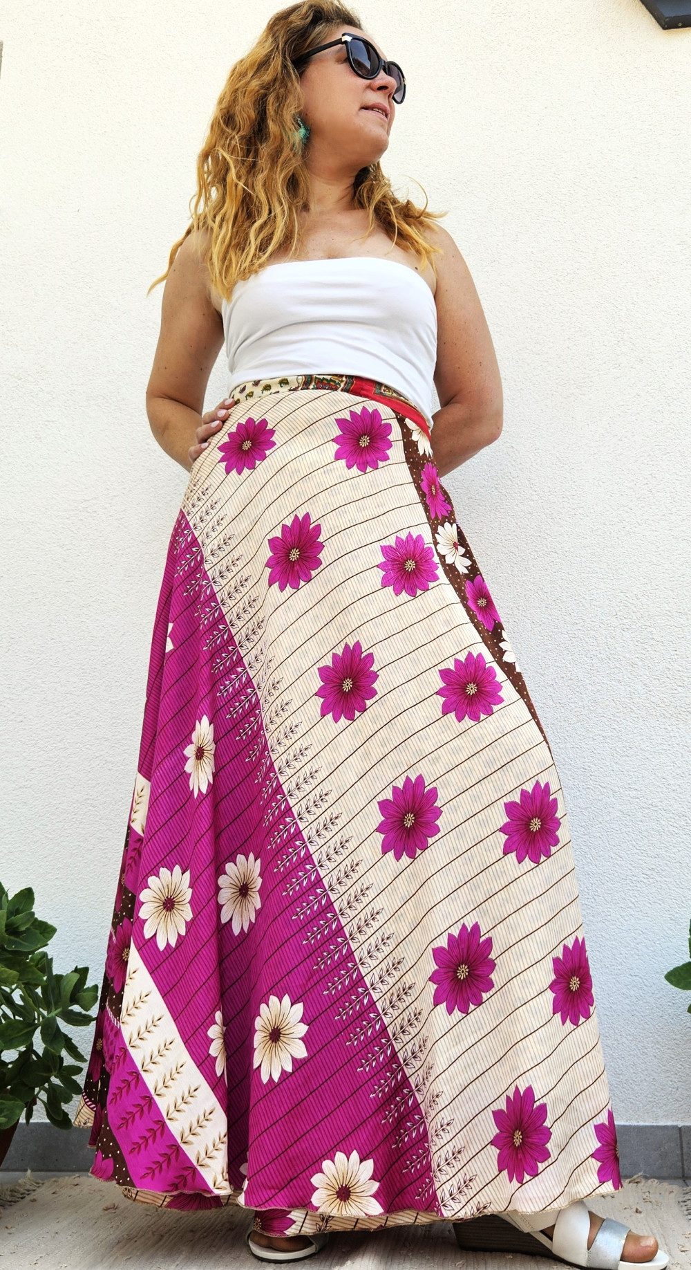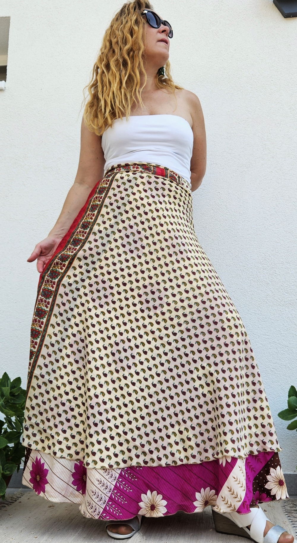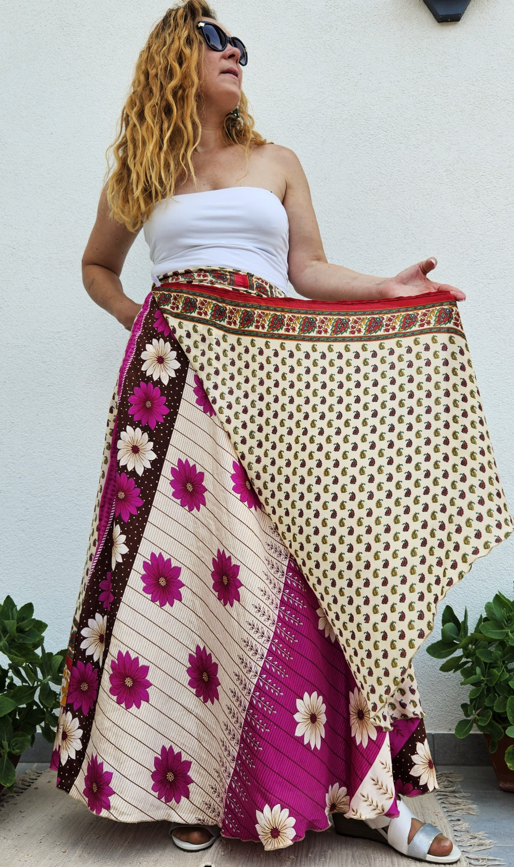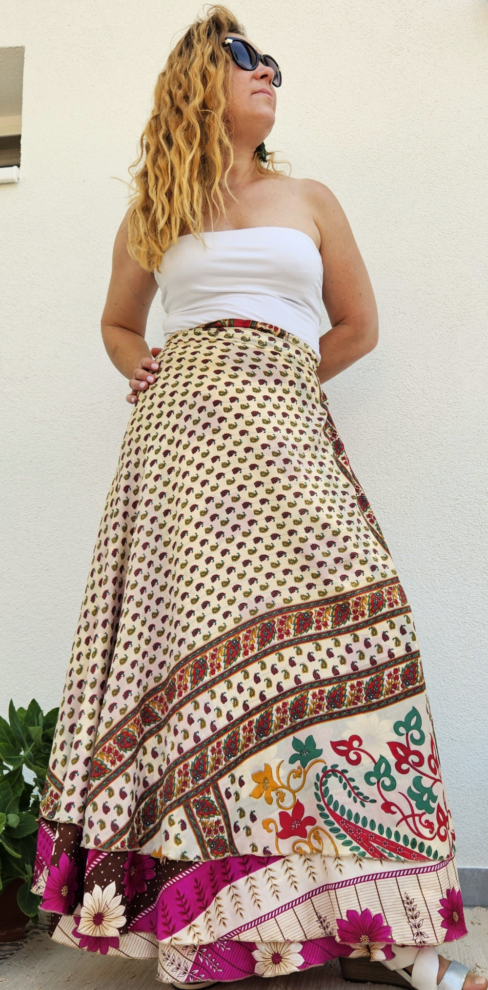 Lapszoknyáink újrahasznosított szárikból készülnek Indiában, egy hosszabb és egy rövidebb anyag derékban összevarrva! Kifordítható, mindkét oldala hordható, sokféleképpen köthető, variálható. Szoknyáinkból nincs két egyforma, mindegyikből csak EGY darab van, ha megtetszik, csapj le rá!