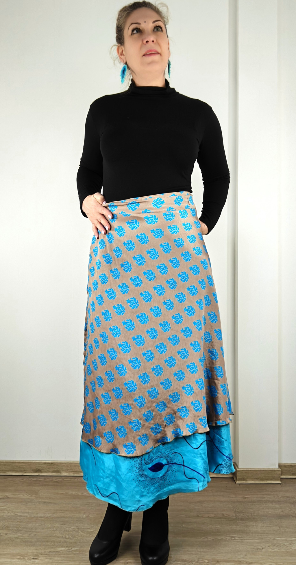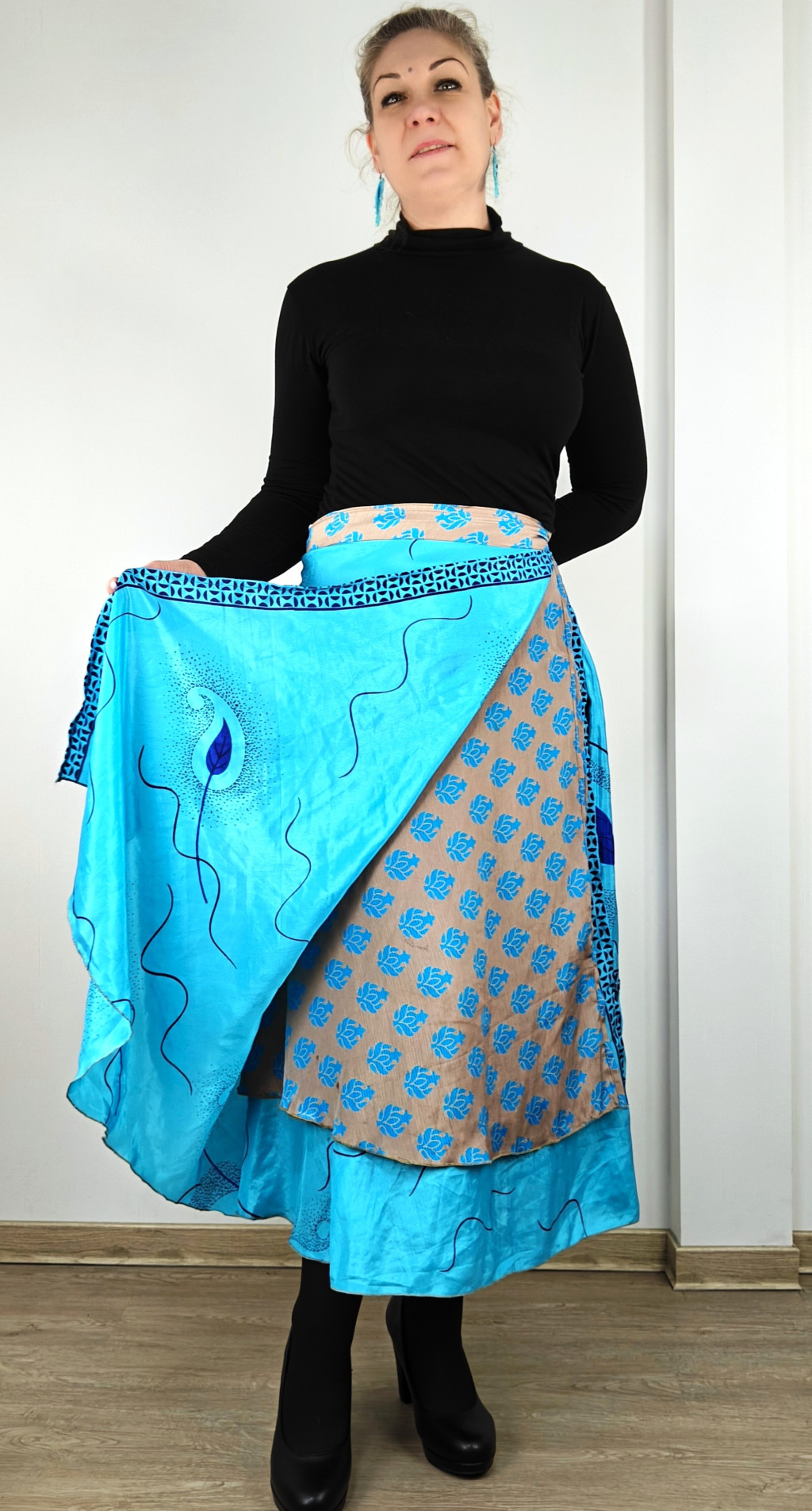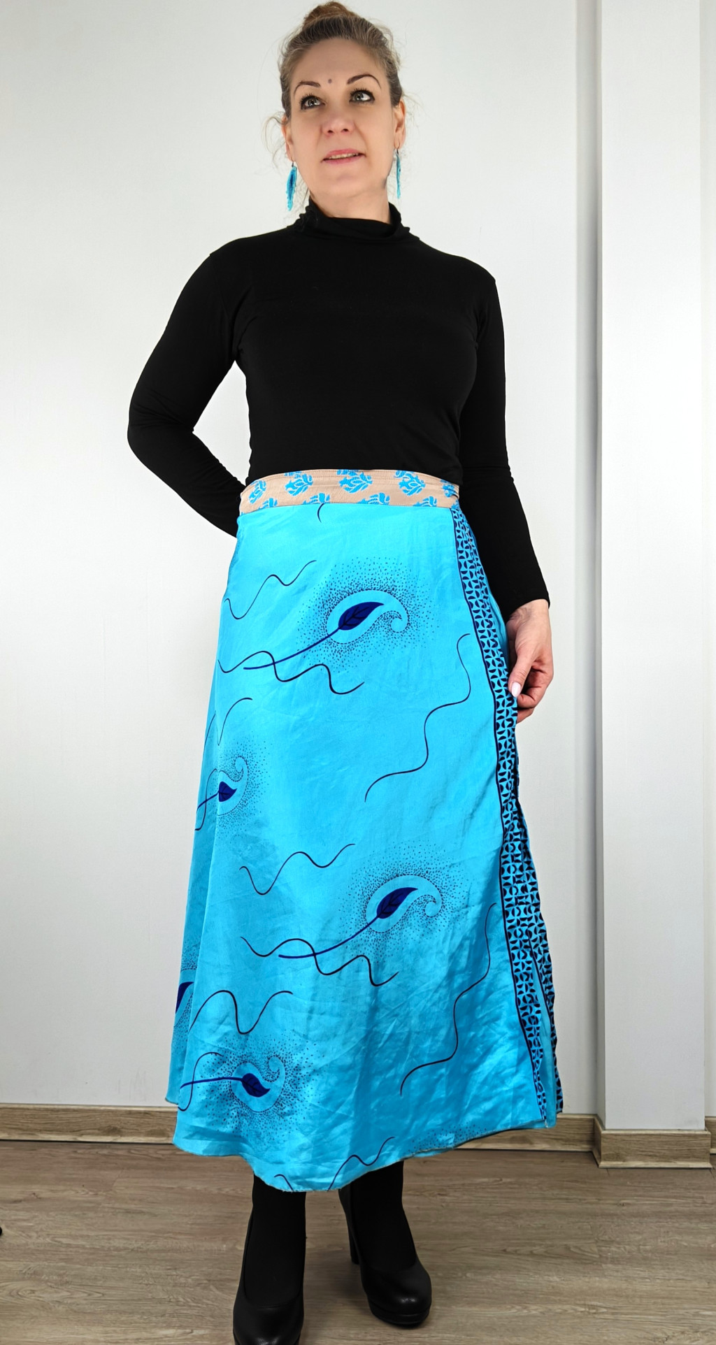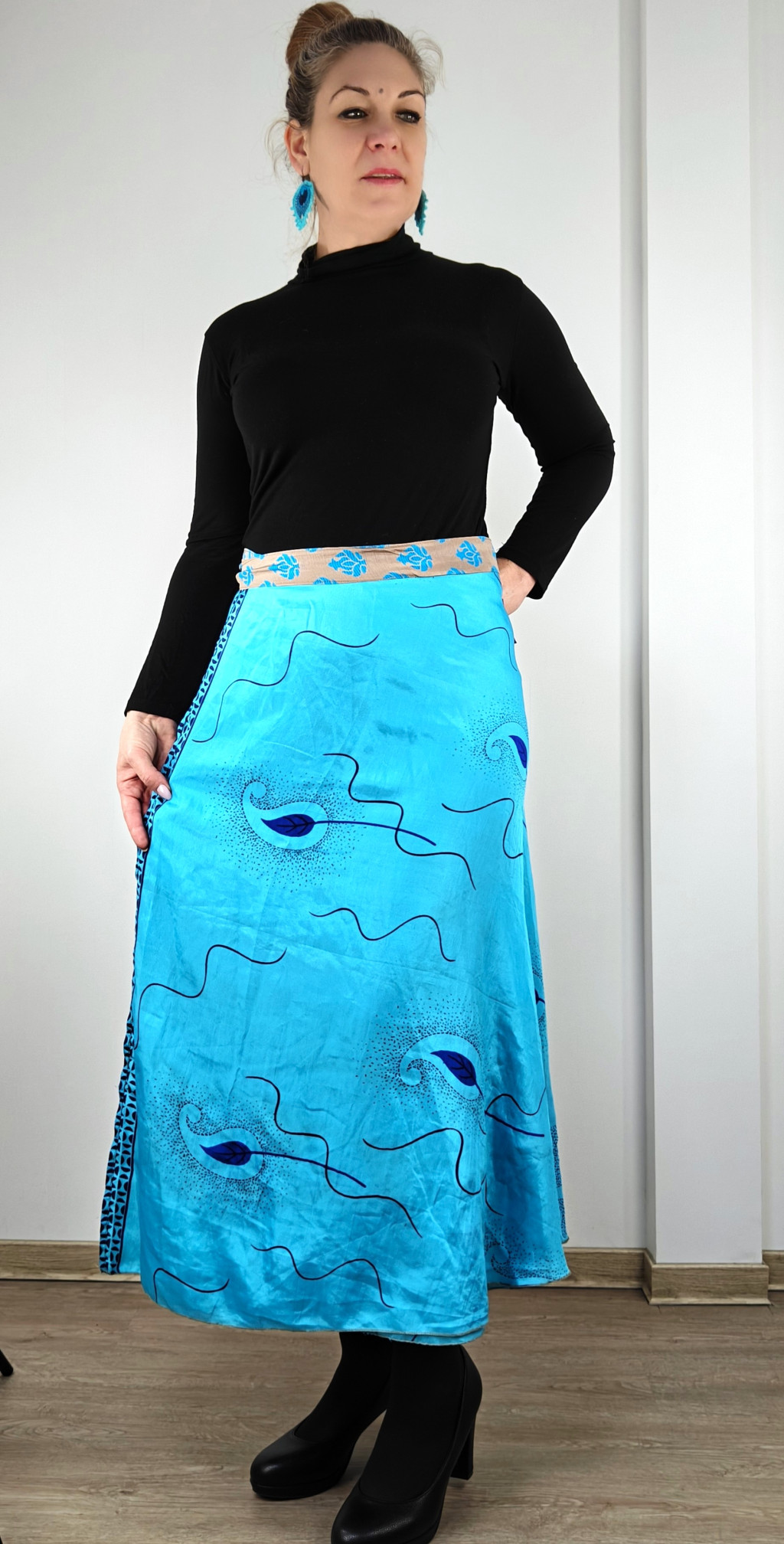 Lapszoknyáink újrahasznosított szárikból készülnek Indiában, egy hosszabb és egy rövidebb anyag derékban összevarrva! Két oldalú, kifordítható, mindkét oldala hordható, sokféleképpen köthető, variálható. Szoknyáinkból nincs két egyforma, mindegyikből csak EGY darab van, ha megtetszik, csapj le rá!