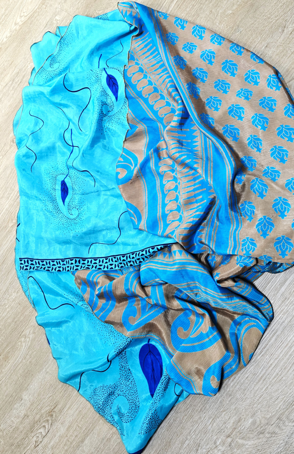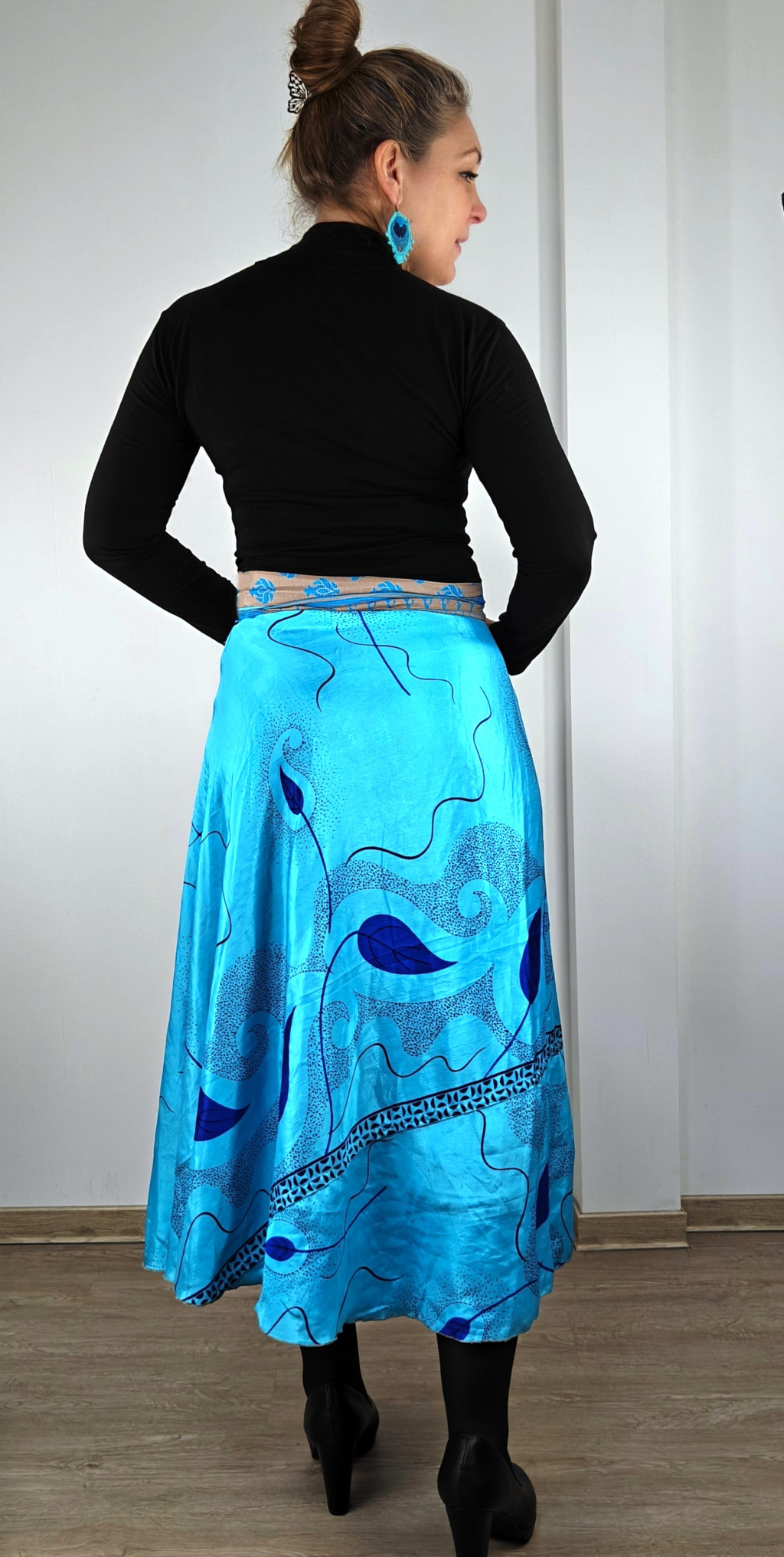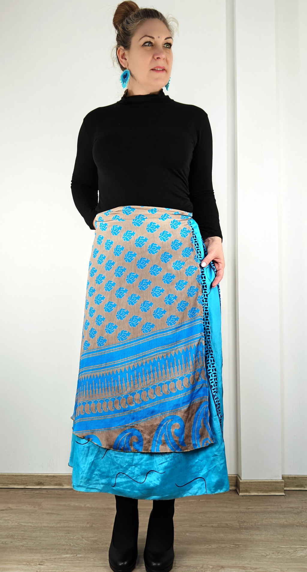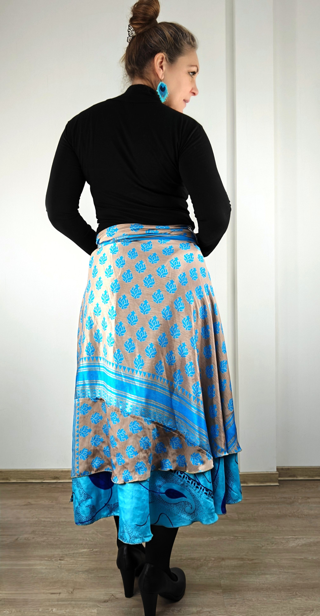 Lapszoknyáink újrahasznosított szárikból készülnek Indiában, egy hosszabb és egy rövidebb anyag derékban összevarrva! Két oldalú, kifordítható, mindkét oldala hordható, sokféleképpen köthető, variálható. Szoknyáinkból nincs két egyforma, mindegyikből csak EGY darab van, ha megtetszik, csapj le rá!