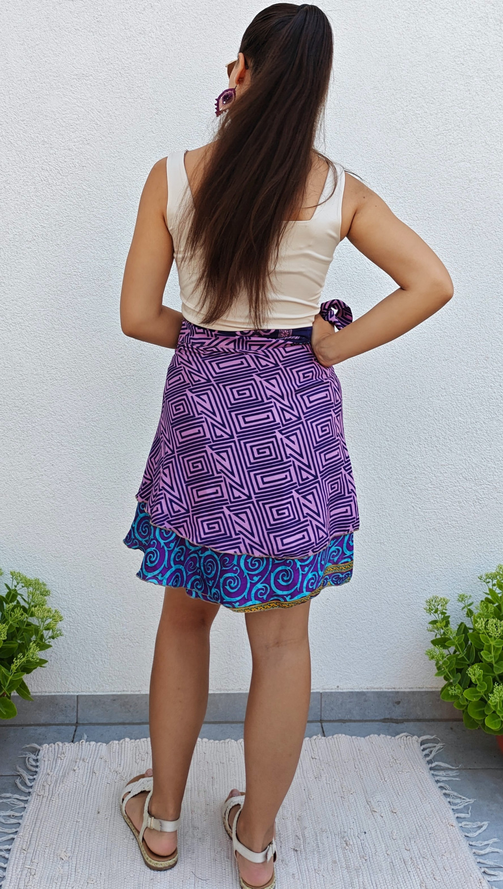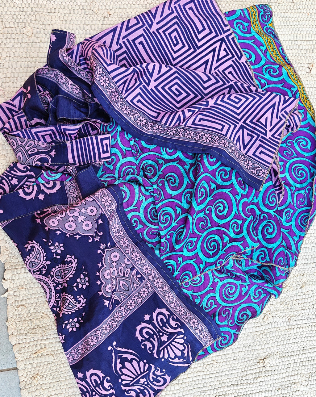 Lapszoknyáink újrahasznosított szárikból készülnek Indiában, egy hosszabb és egy rövidebb anyag derékban összevarrva! Két oldalú, kifordítható, mindkét oldala hordható, sokféleképpen köthető, variálható. Szoknyáinkból nincs két egyforma, mindegyikből csak EGY darab van, ha megtetszik, csapj le rá!