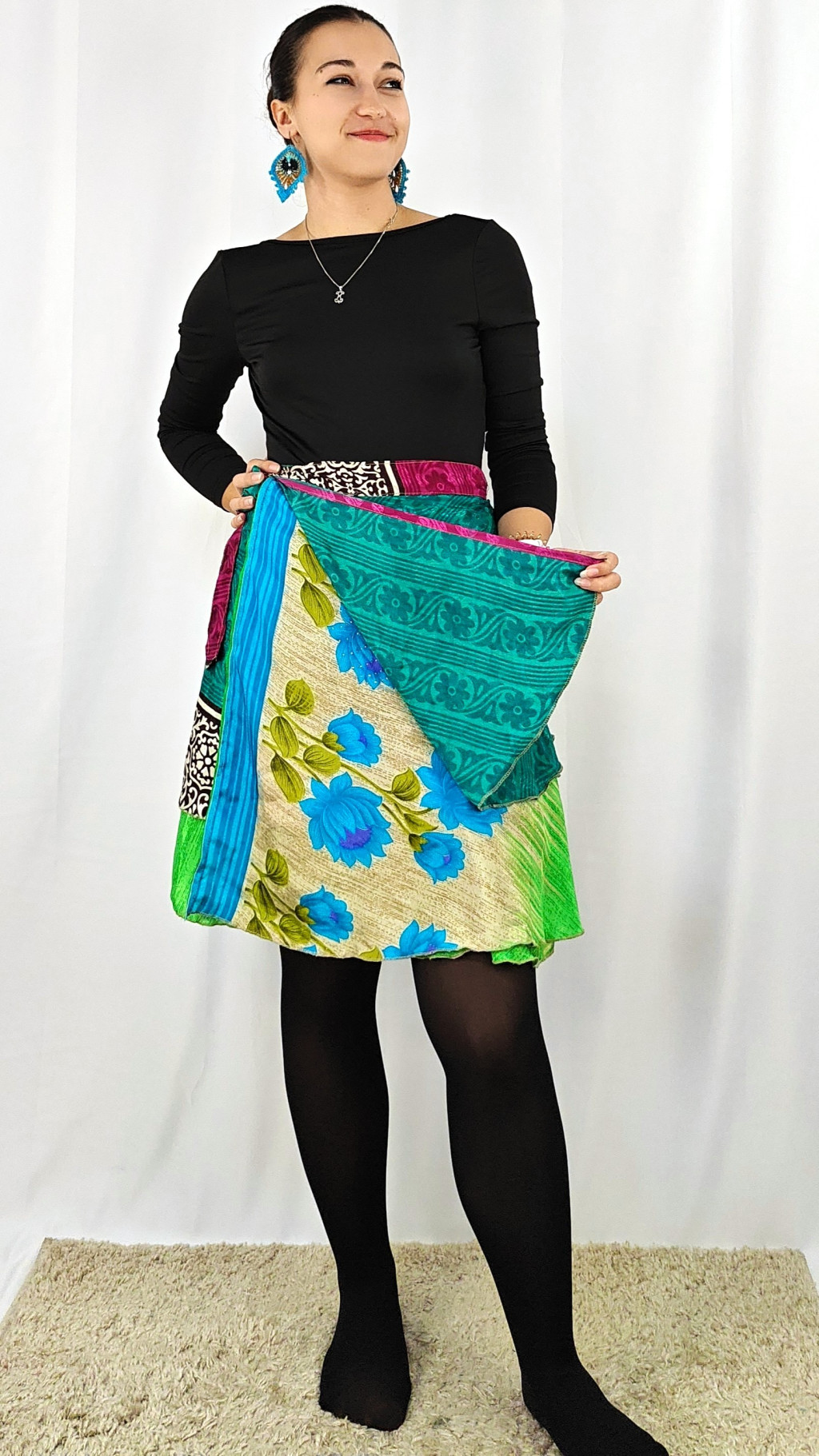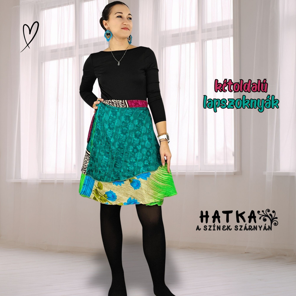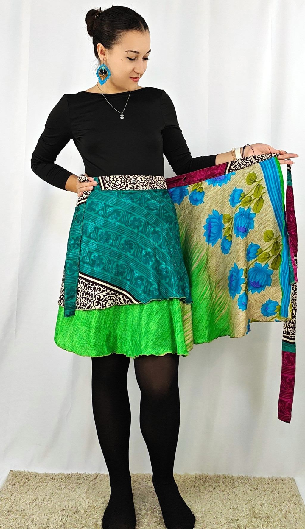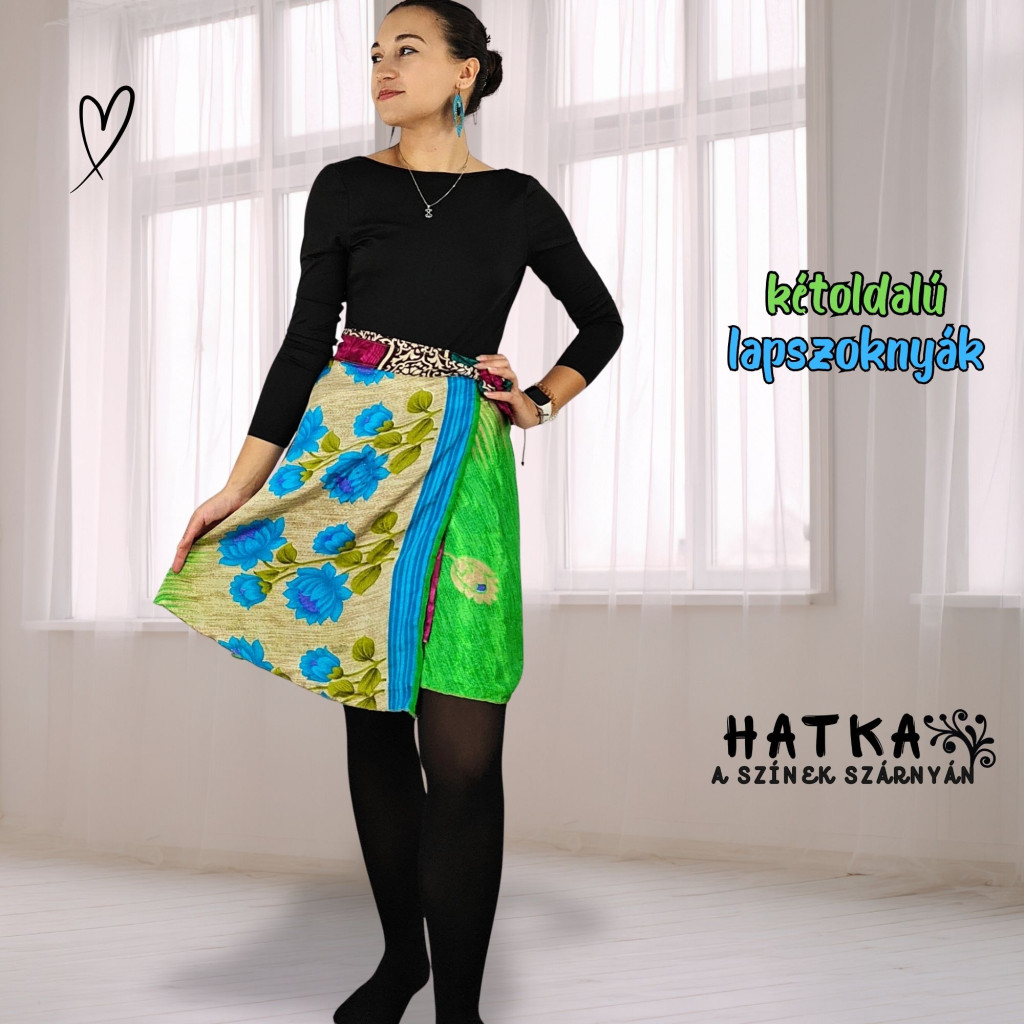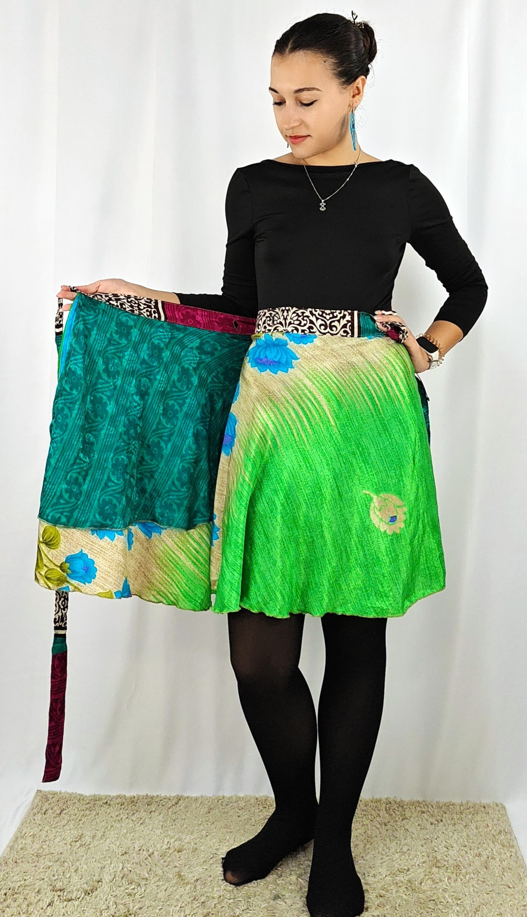 Lapszoknyáink újrahasznosított szárikból készülnek Indiában, egy hosszabb és egy rövidebb anyag derékban összevarrva! Két oldalú, kifordítható, mindkét oldala hordható, sokféleképpen köthető, variálható. Szoknyáinkból nincs két egyforma, mindegyikből csak EGY darab van, ha megtetszik, csapj le rá!
