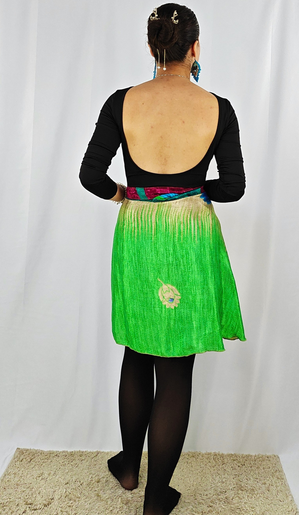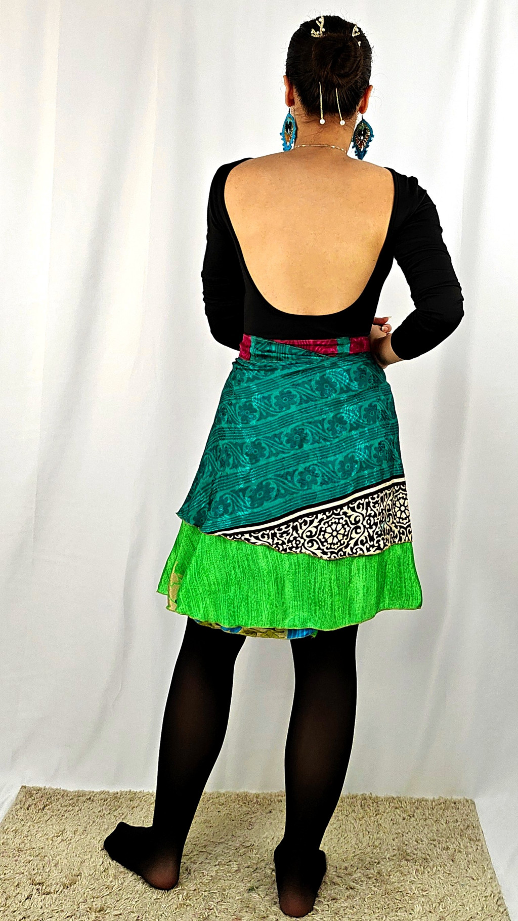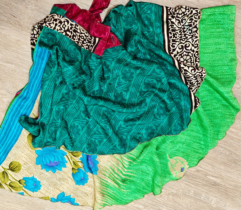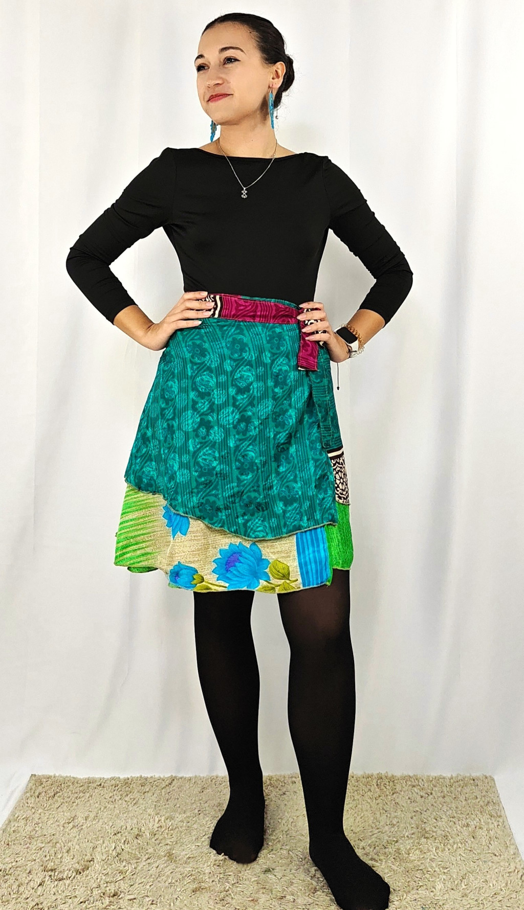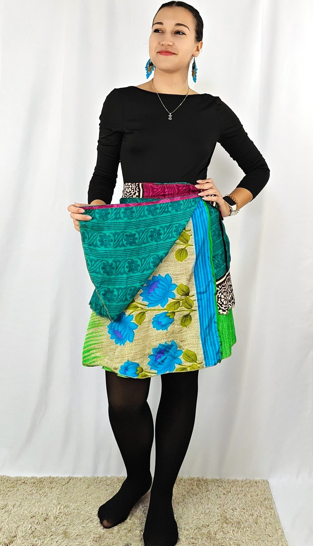 Lapszoknyáink újrahasznosított szárikból készülnek Indiában, egy hosszabb és egy rövidebb anyag derékban összevarrva! Két oldalú, kifordítható, mindkét oldala hordható, sokféleképpen köthető, variálható. Szoknyáinkból nincs két egyforma, mindegyikből csak EGY darab van, ha megtetszik, csapj le rá!