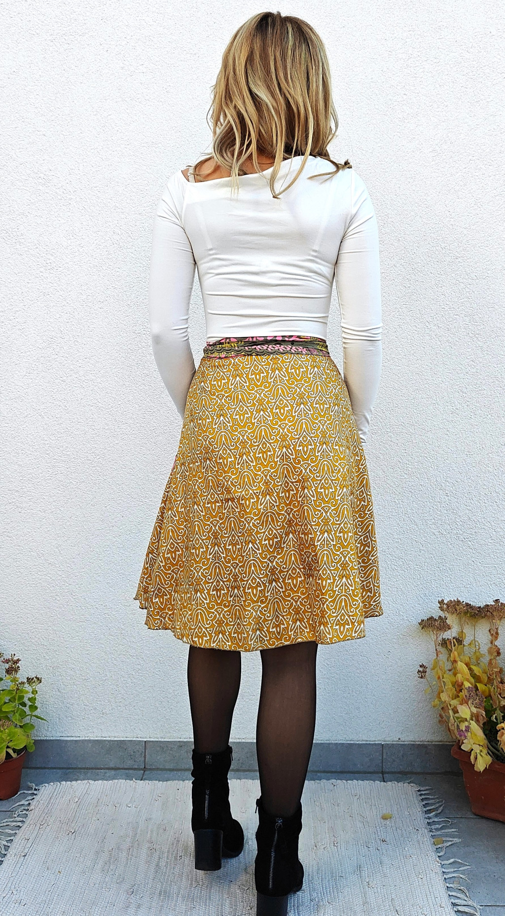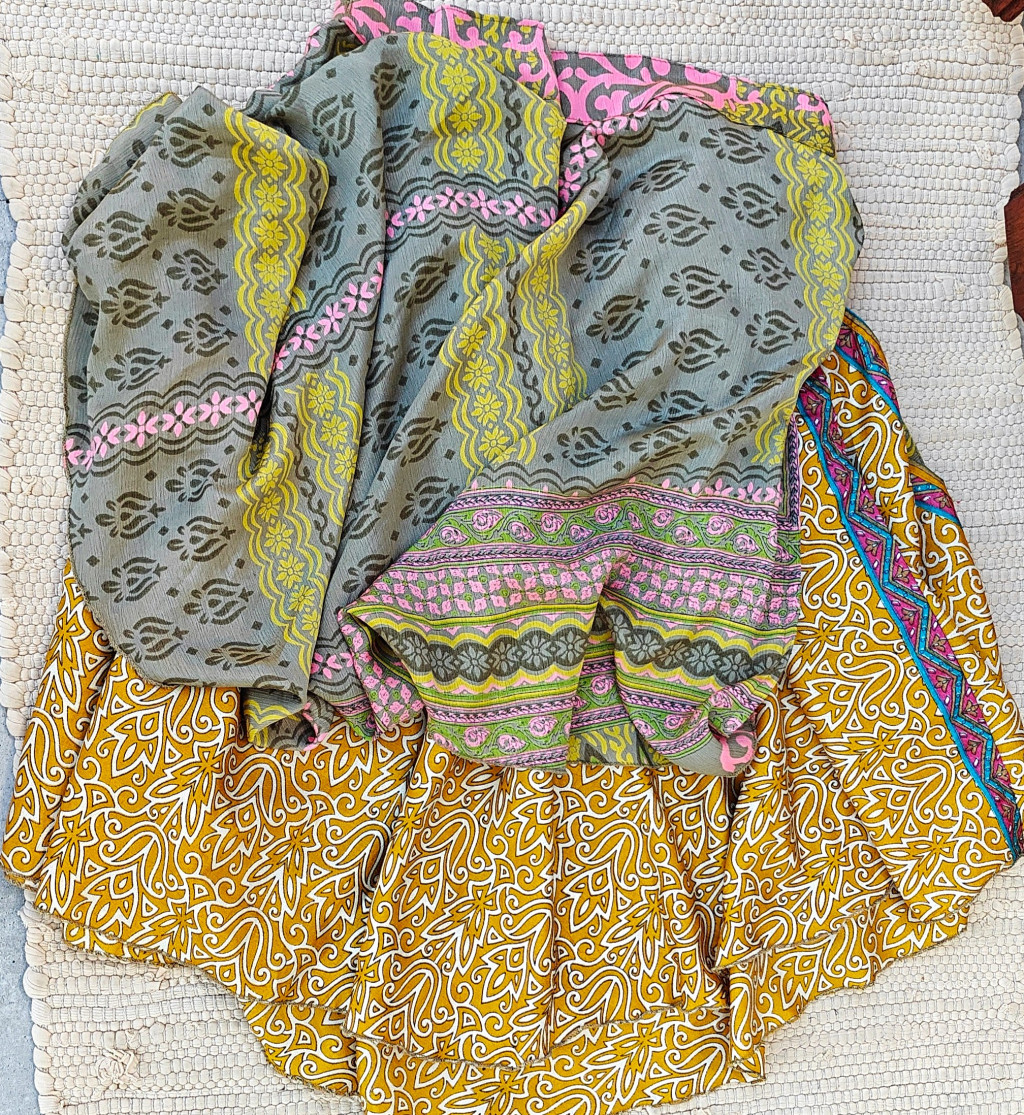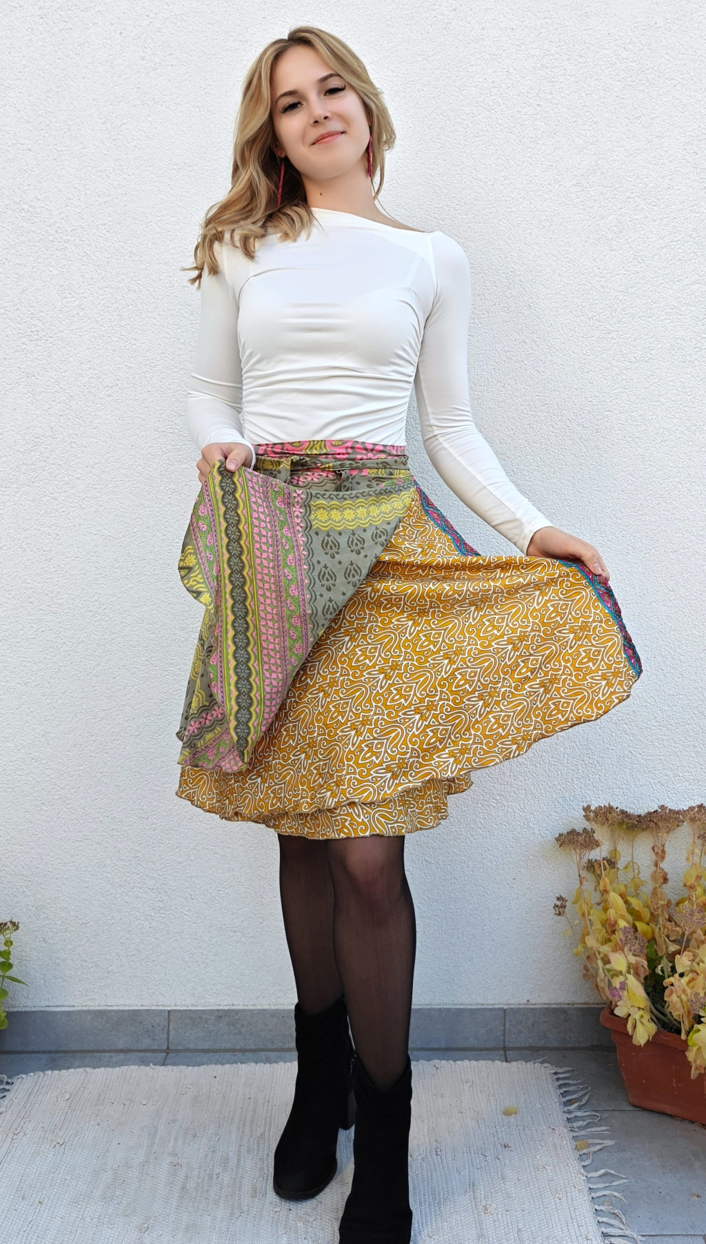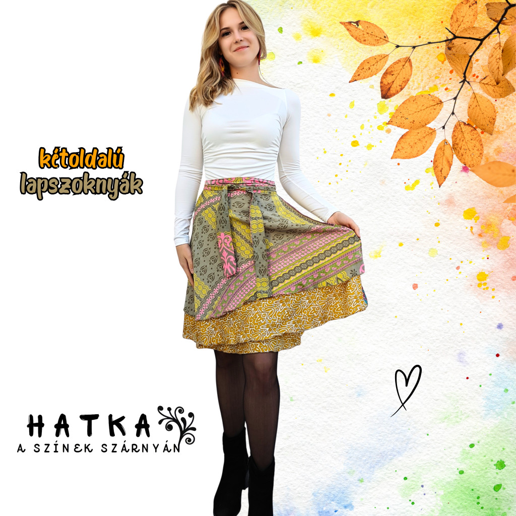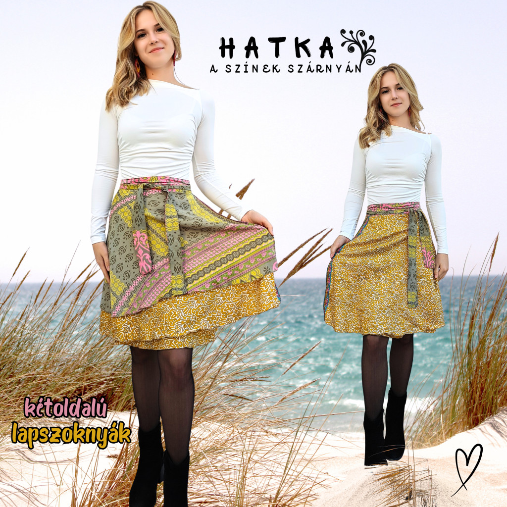 Lapszoknyáink újrahasznosított szárikból készülnek Indiában, egy hosszabb és egy rövidebb anyag derékban összevarrva! Két oldalú, kifordítható, mindkét oldala hordható, sokféleképpen köthető, variálható. Szoknyáinkból nincs két egyforma, mindegyikből csak EGY darab van, ha megtetszik, csapj le rá!